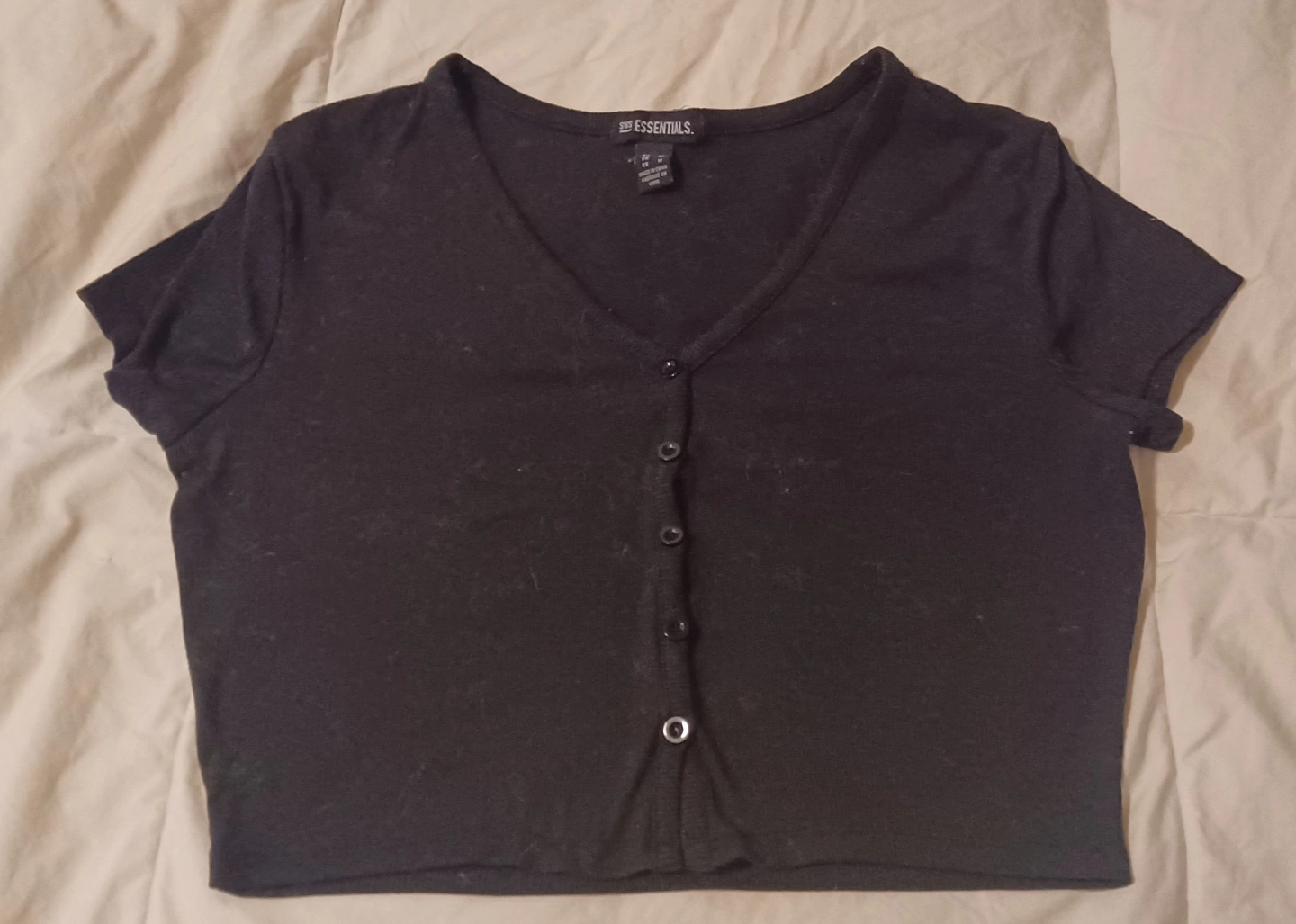 Short sleeve black crop top. V-neck button detail. Size Medium.