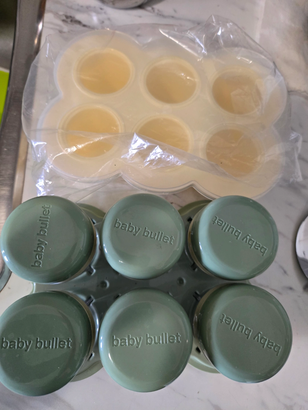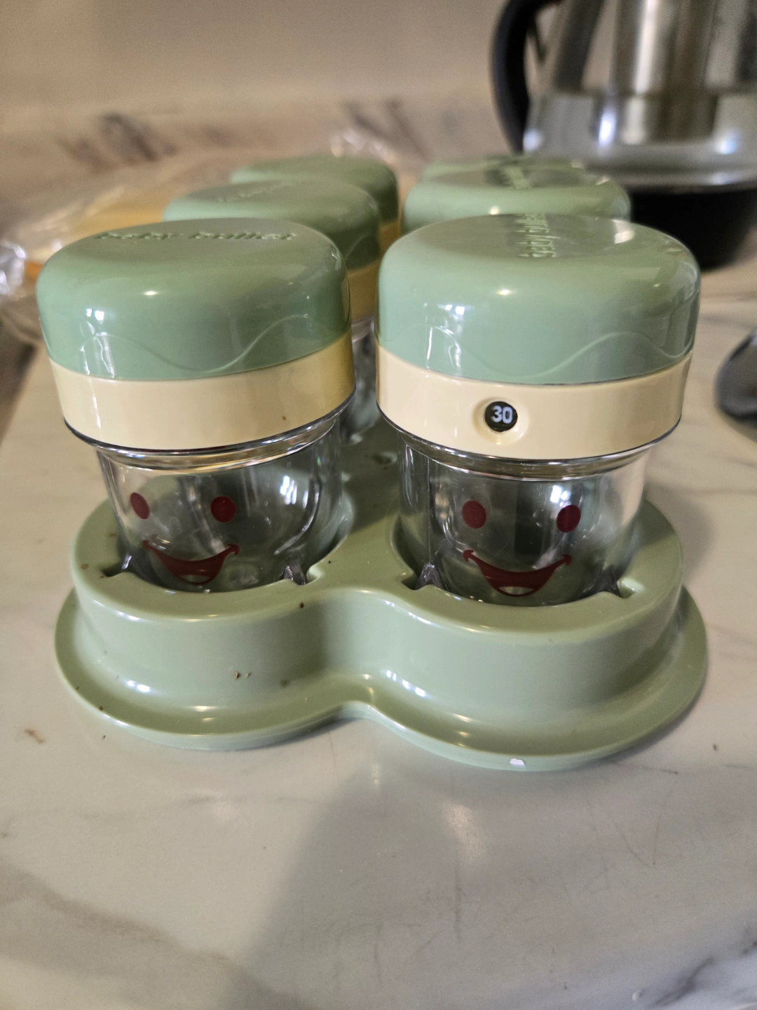 230Set of six Baby Bullet food storage containers. Includes a storage tray and a separate ice cube tray. Green lids and base. Small, adorable smiley faces on containers.