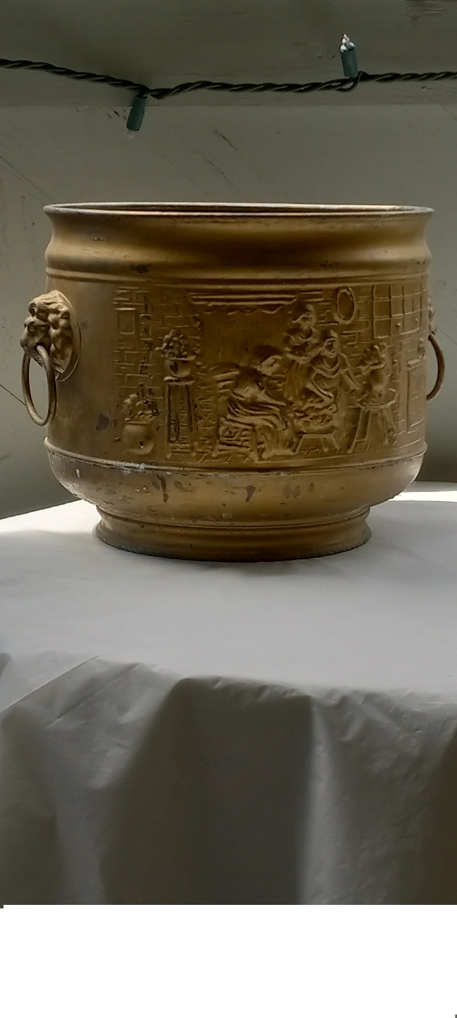 Large brass planter. Embossed with frontier inspired designs. Features lion head handles on either side. age related wear.