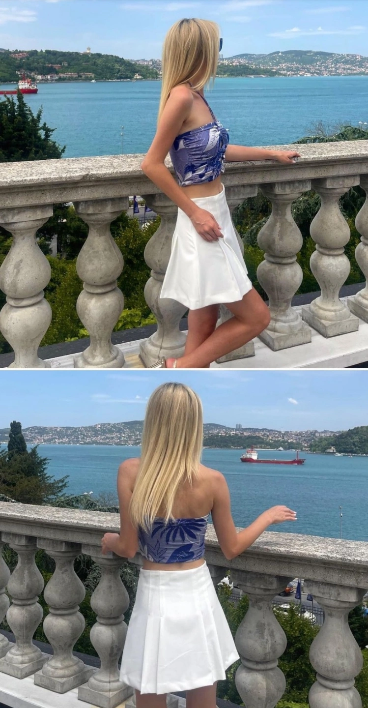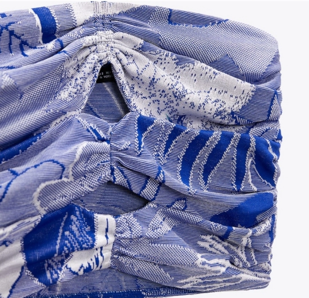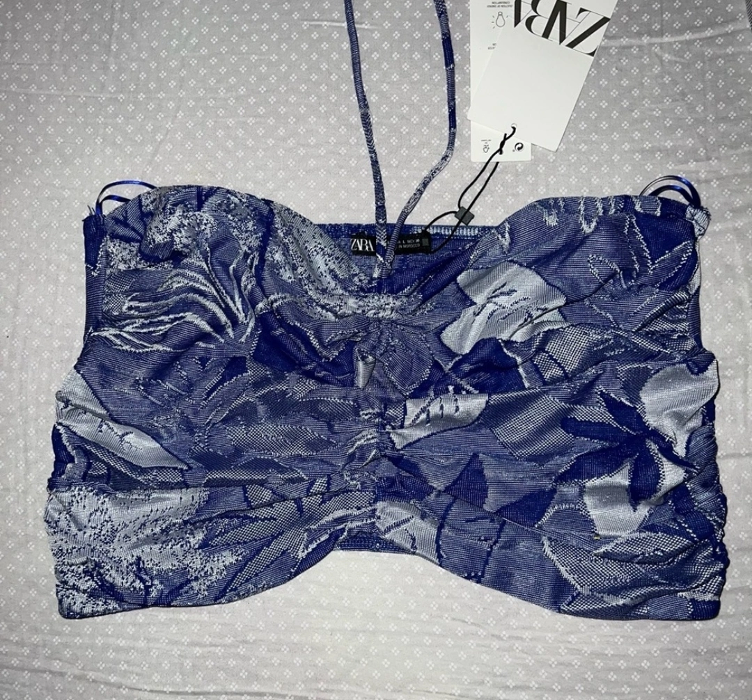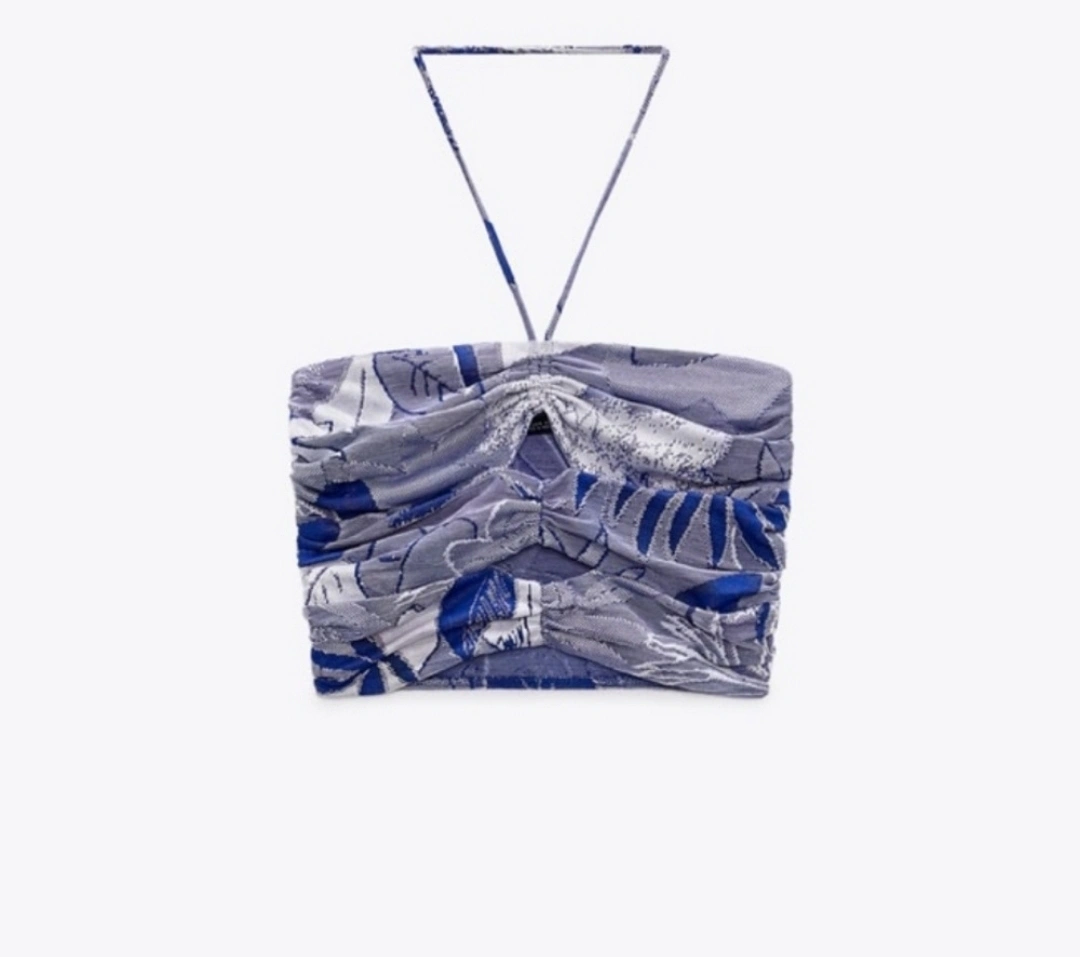 Beautiful blue floral print crop top. Halter neck design. Ruched detail. Size L New with tags retails $140