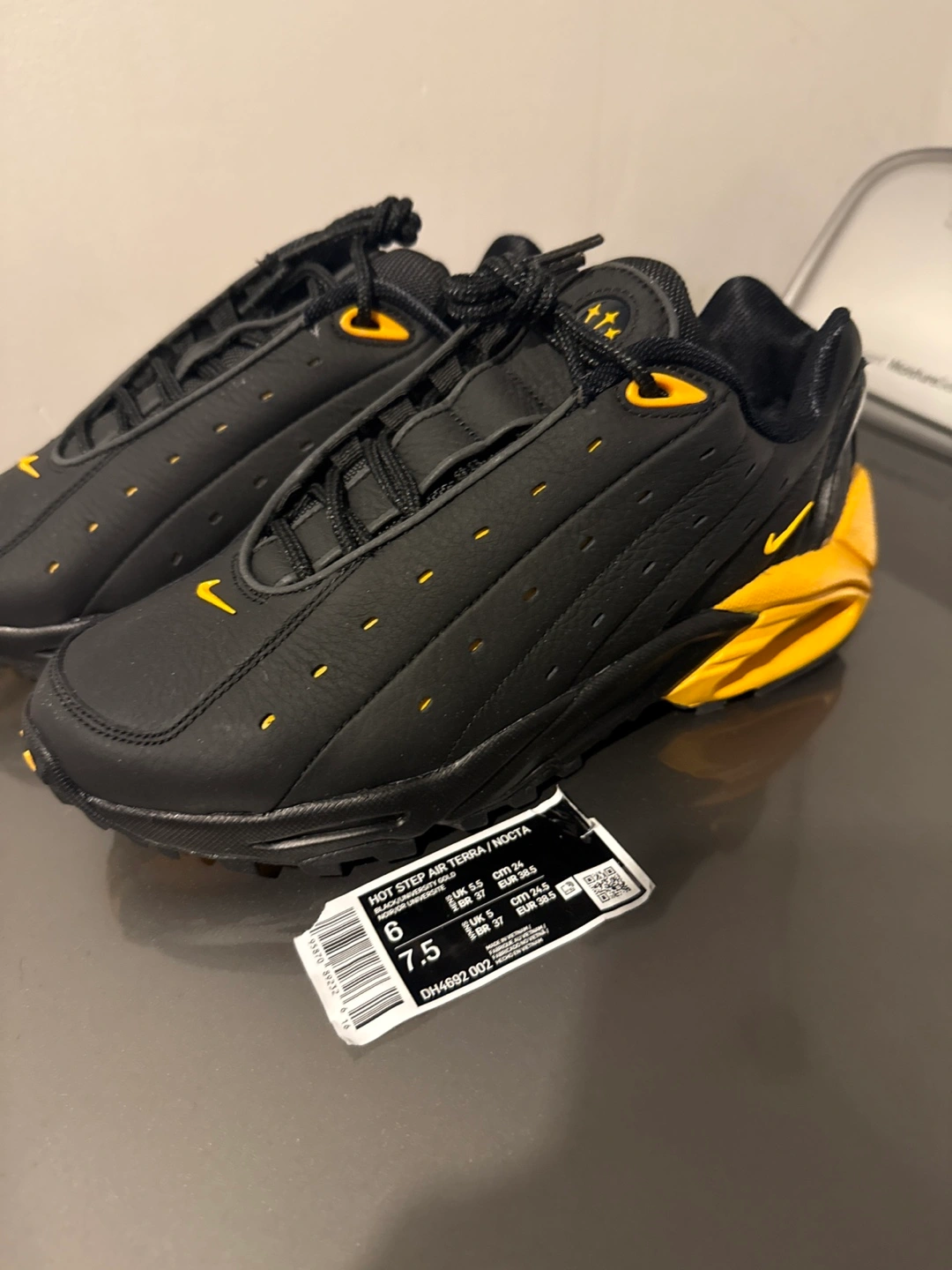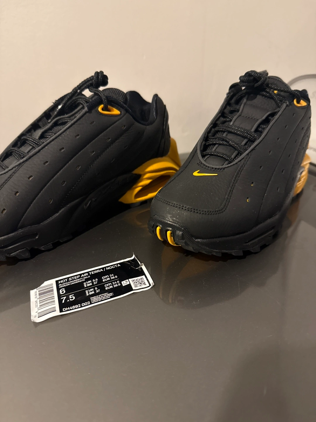 Black and gold Nike sneakers. Low-top design. Minimal wear. Size 6 mens/ 7.5 women's. I bought these a couple of years ago and threw away the original box, the shoes have only been worn once.