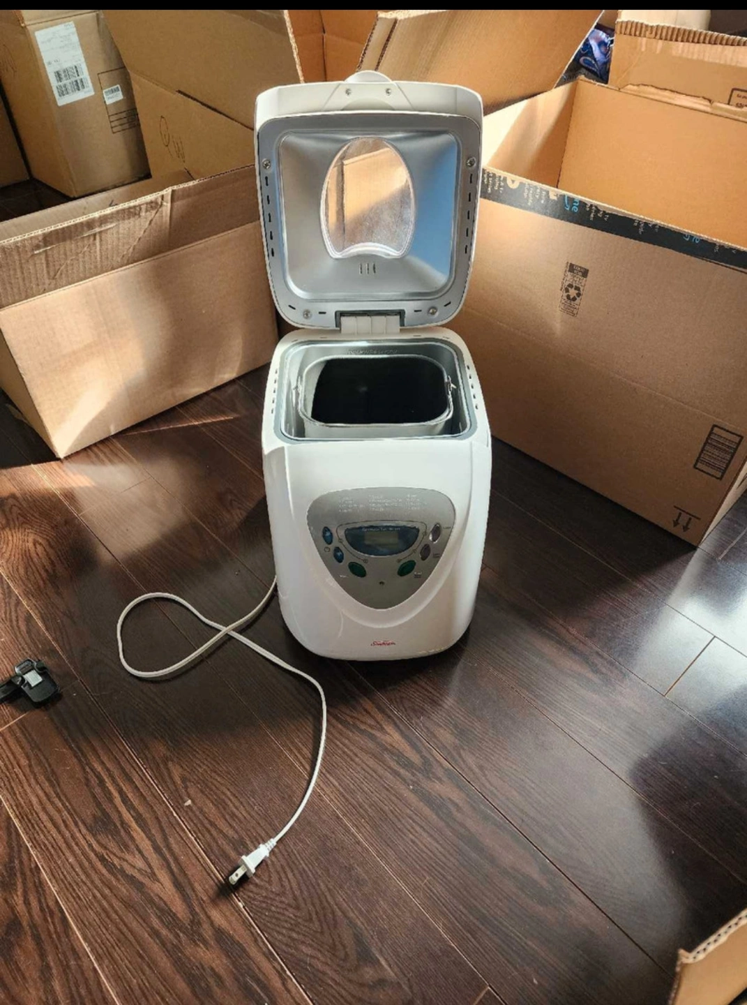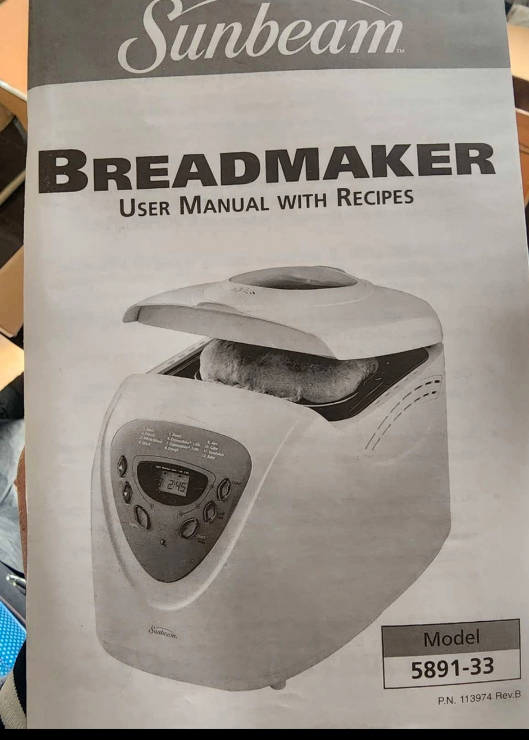 Used Sunbeam breadmaker, model 5891-33. Includes user manual with recipes. White colour. Good condition.