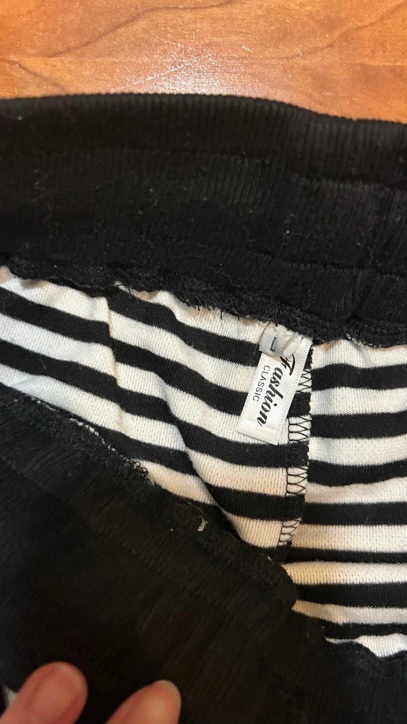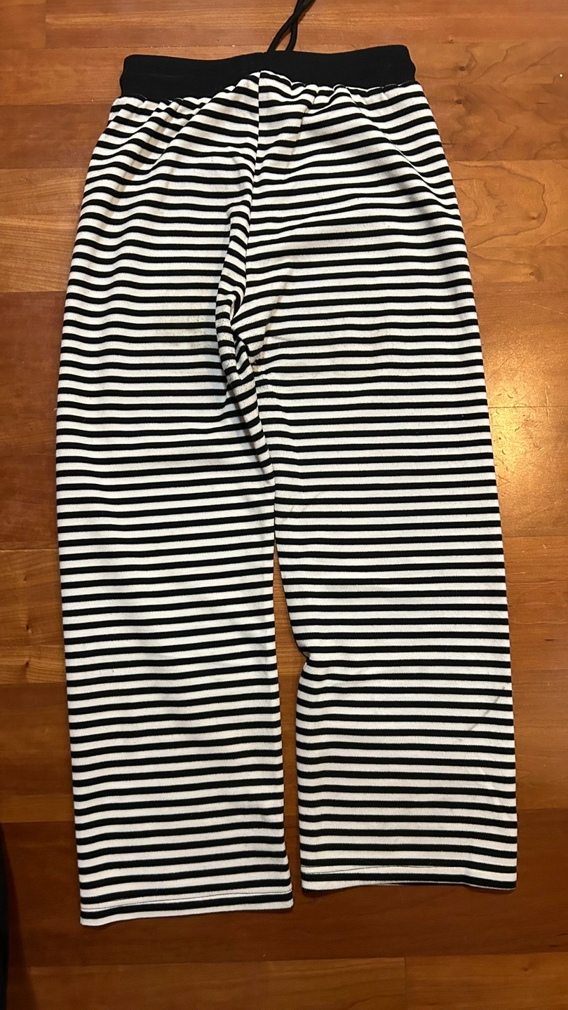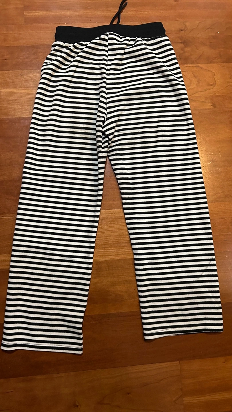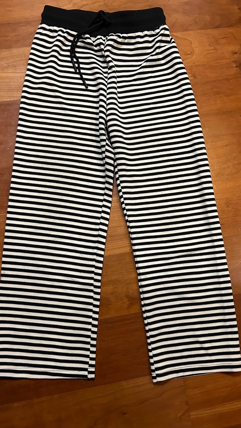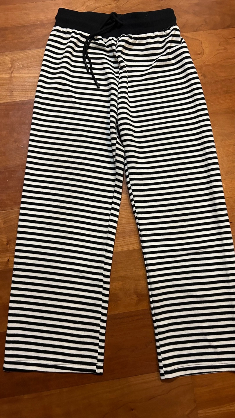 Comfortable cropped pants. Black and white horizontal stripes. Elastic waistband with drawstring. Relaxed fit.