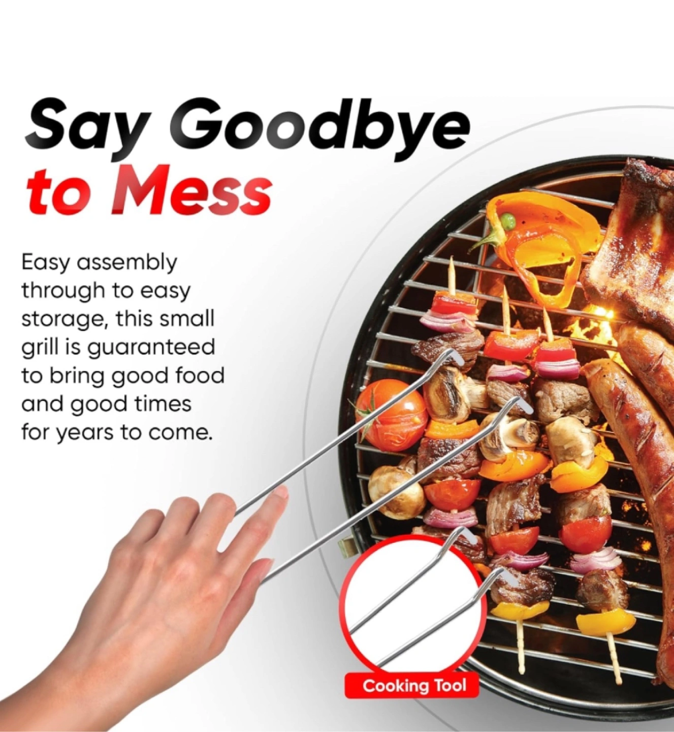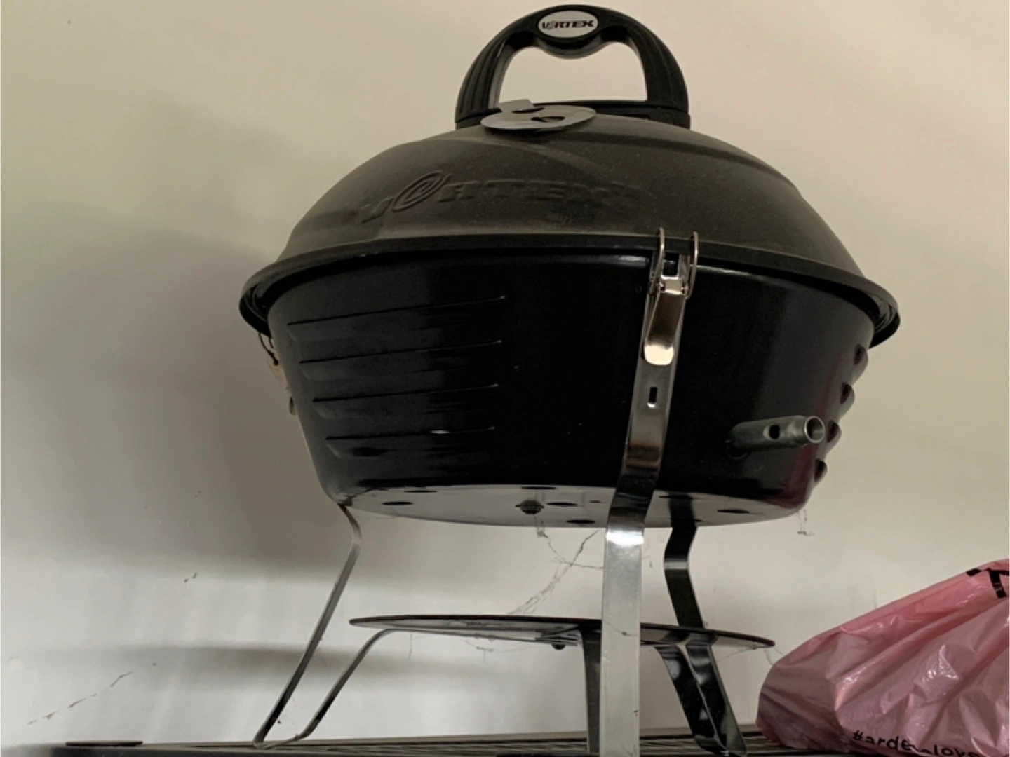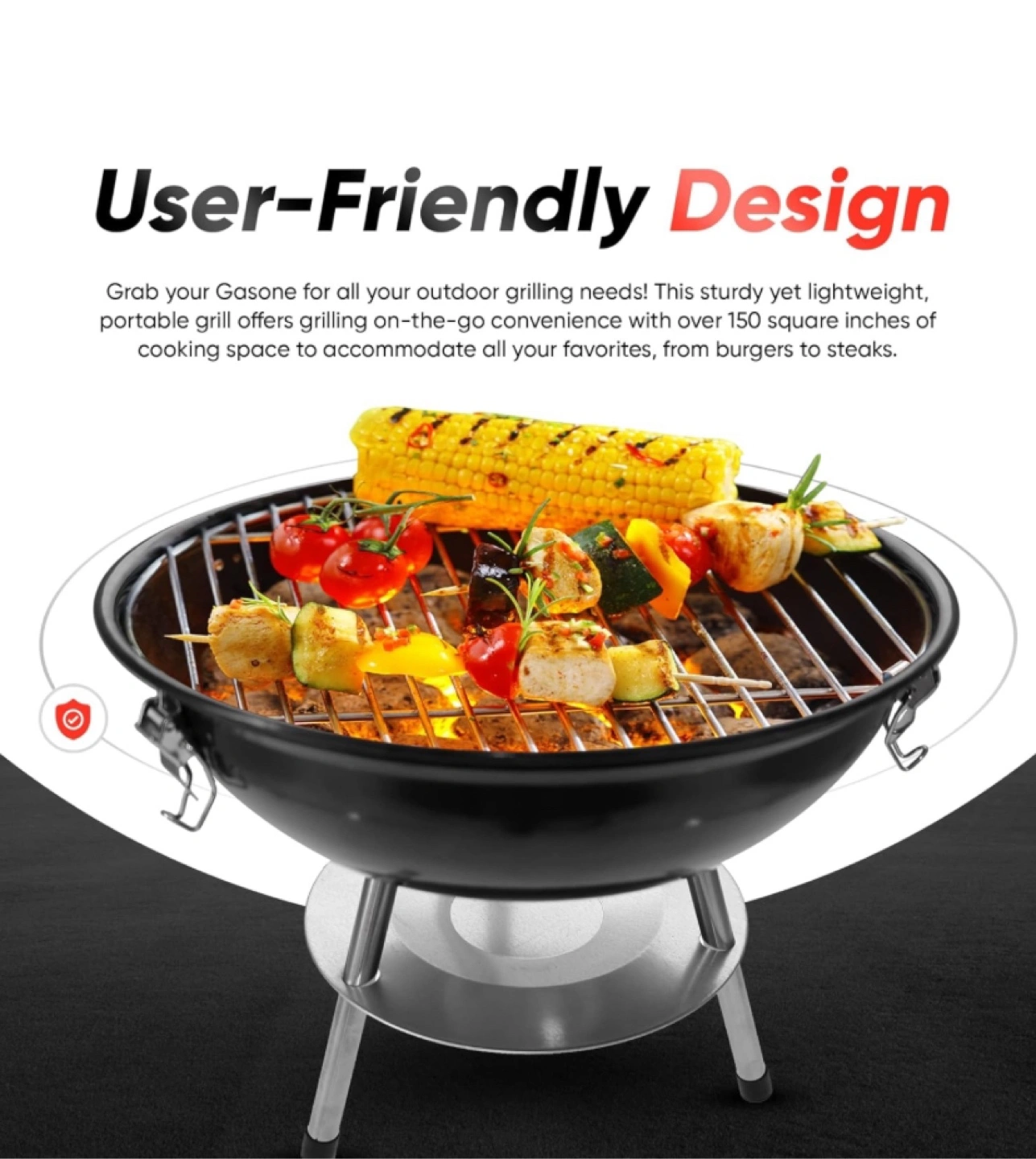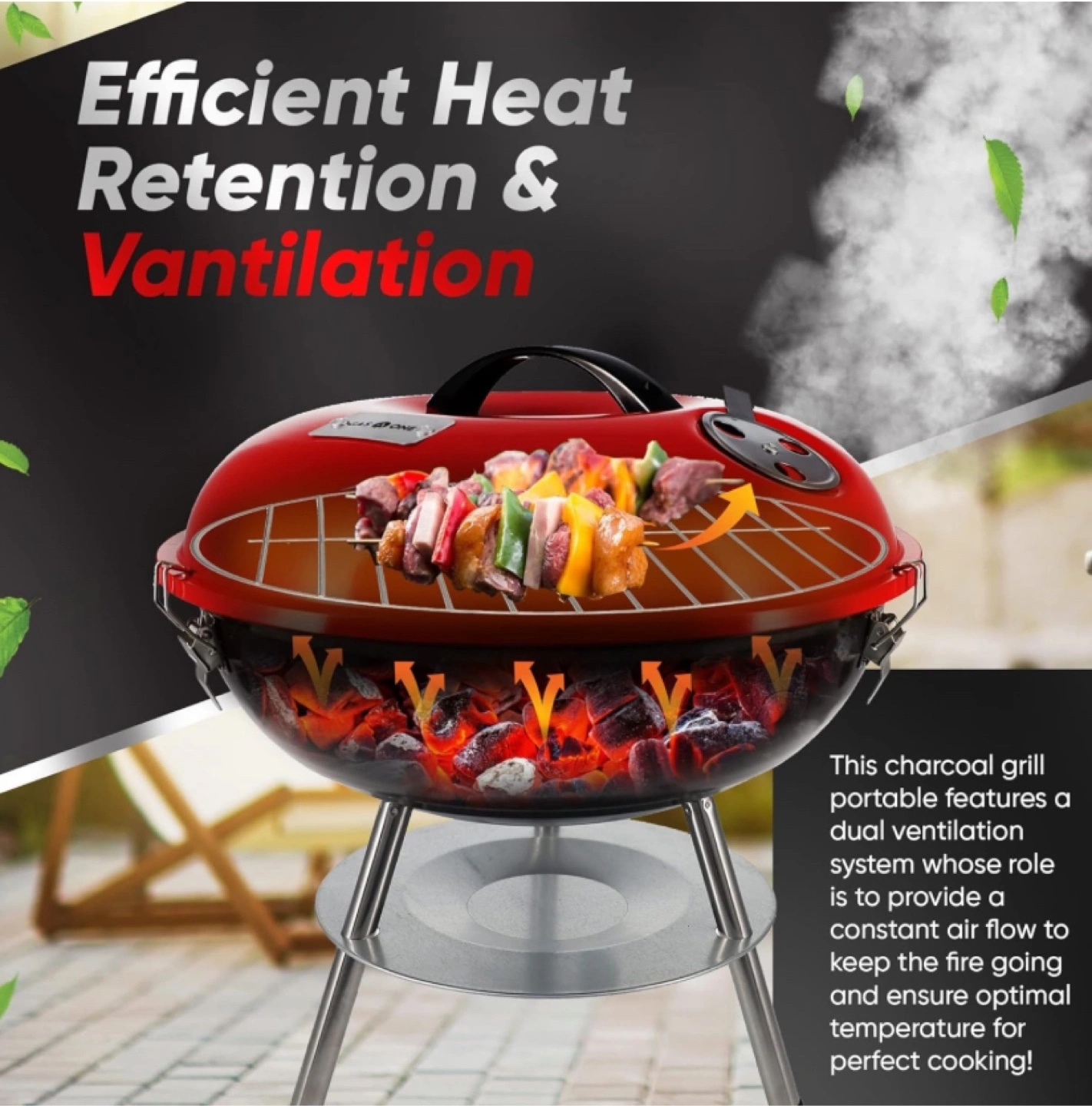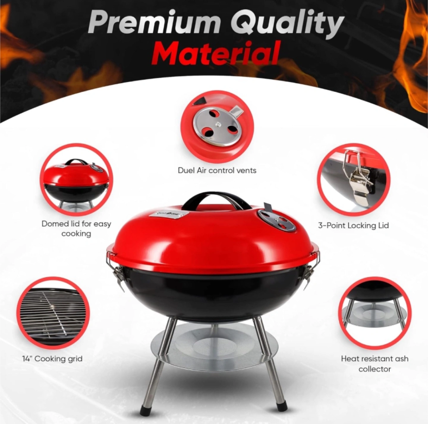 Compact and portable charcoal grill, easy assembly and storage. Durable construction, features dual ventilation for optimal cooking. Includes 14" cooking grid and heat-resistant ash collector. Great for camping or small spaces. Never used before. Came as a gift. Take it wherever you want to go.