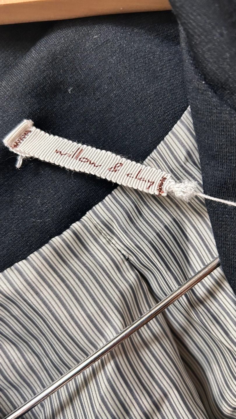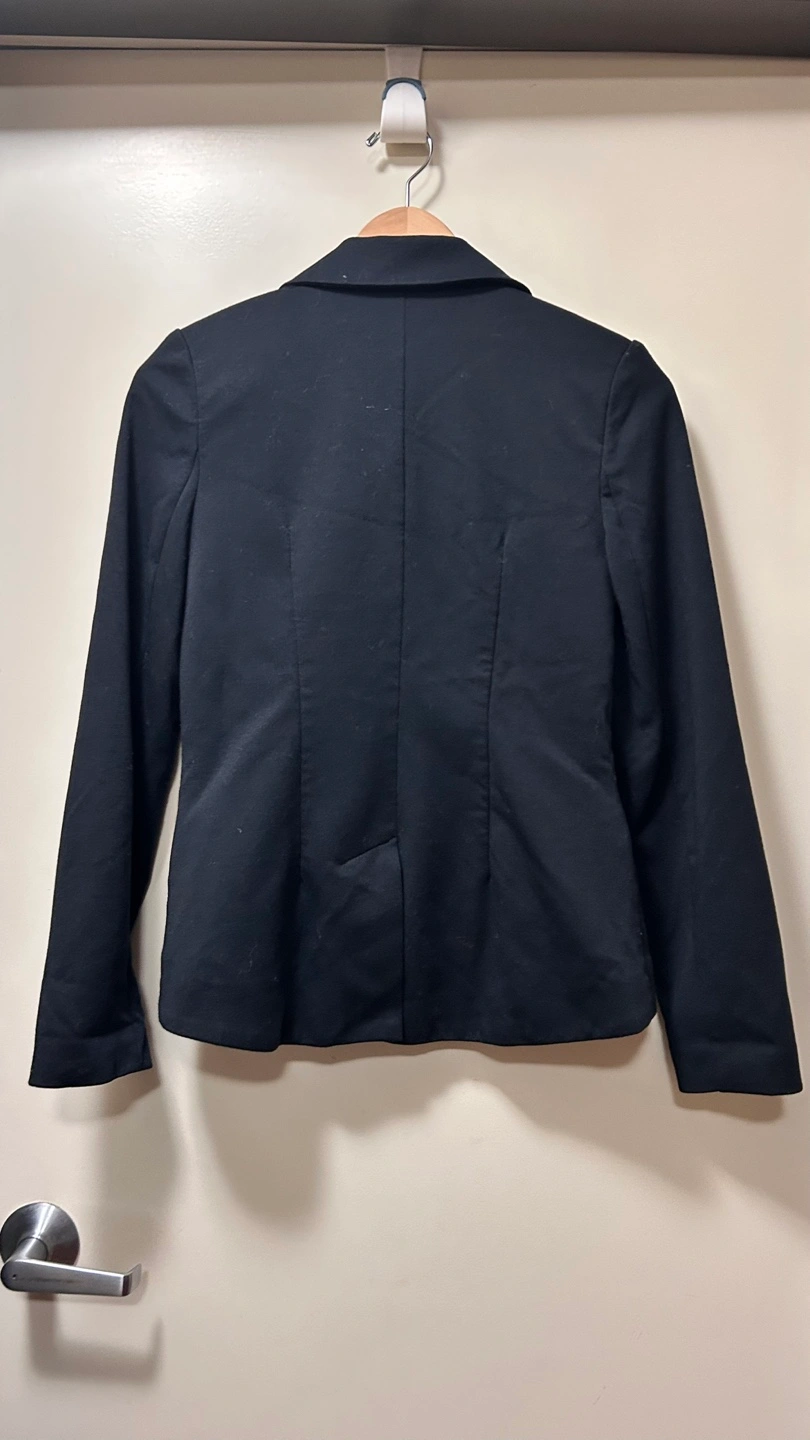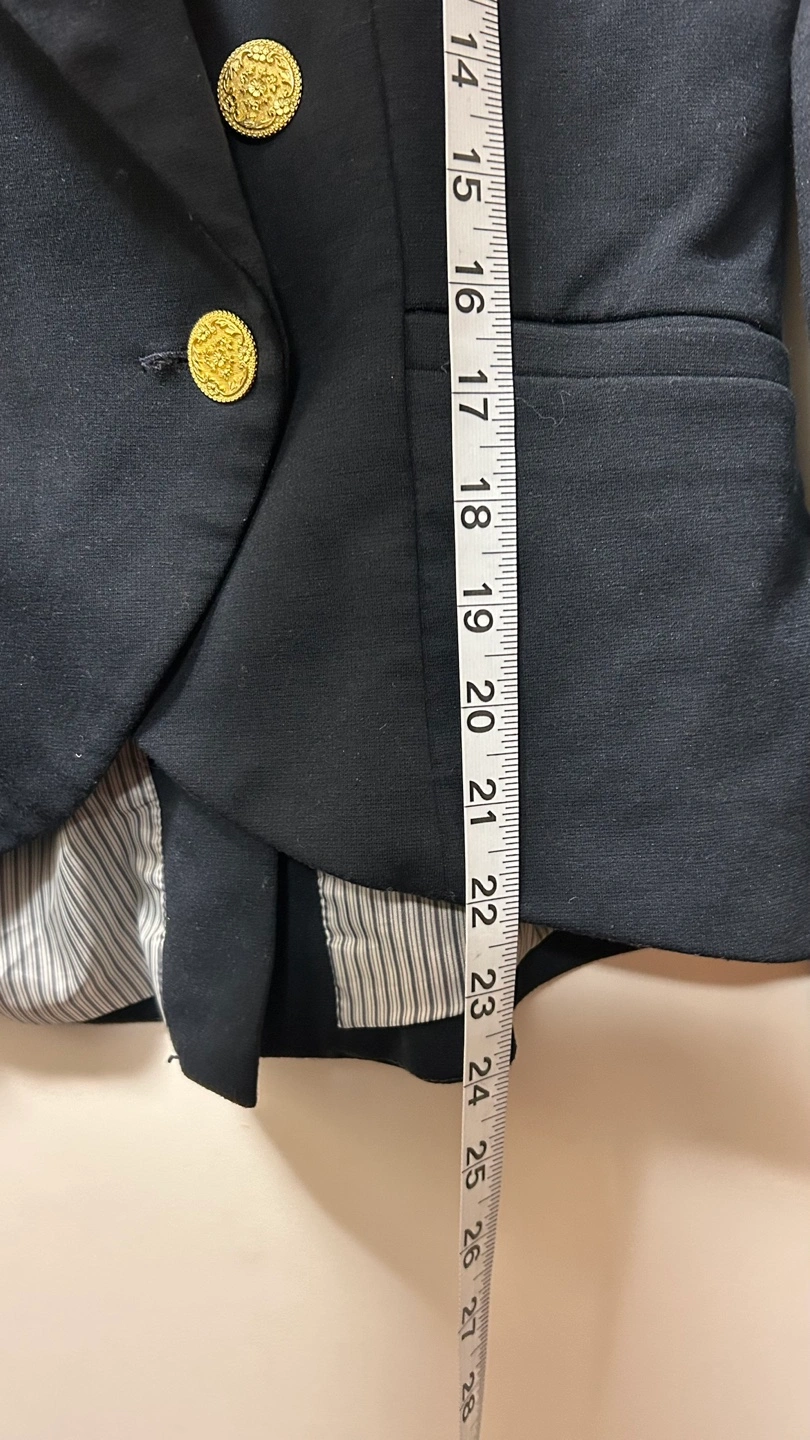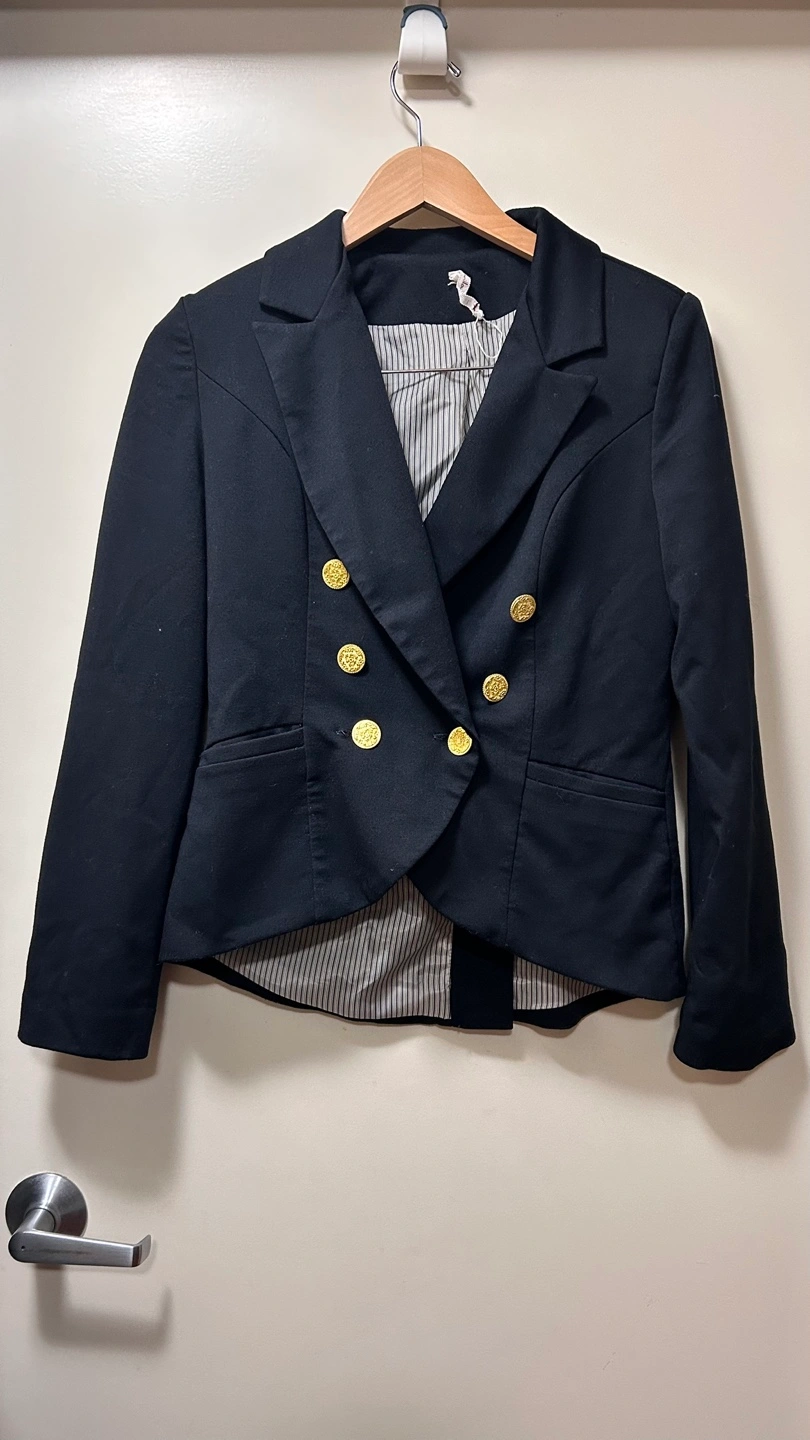 Women's black blazer. Size small. Double-breasted. Gold buttons. 78% polyester, 19% rayon, 3% spandex. Lined. Made in China. Ptp is 17.5 length is 22” in front and 24” in back