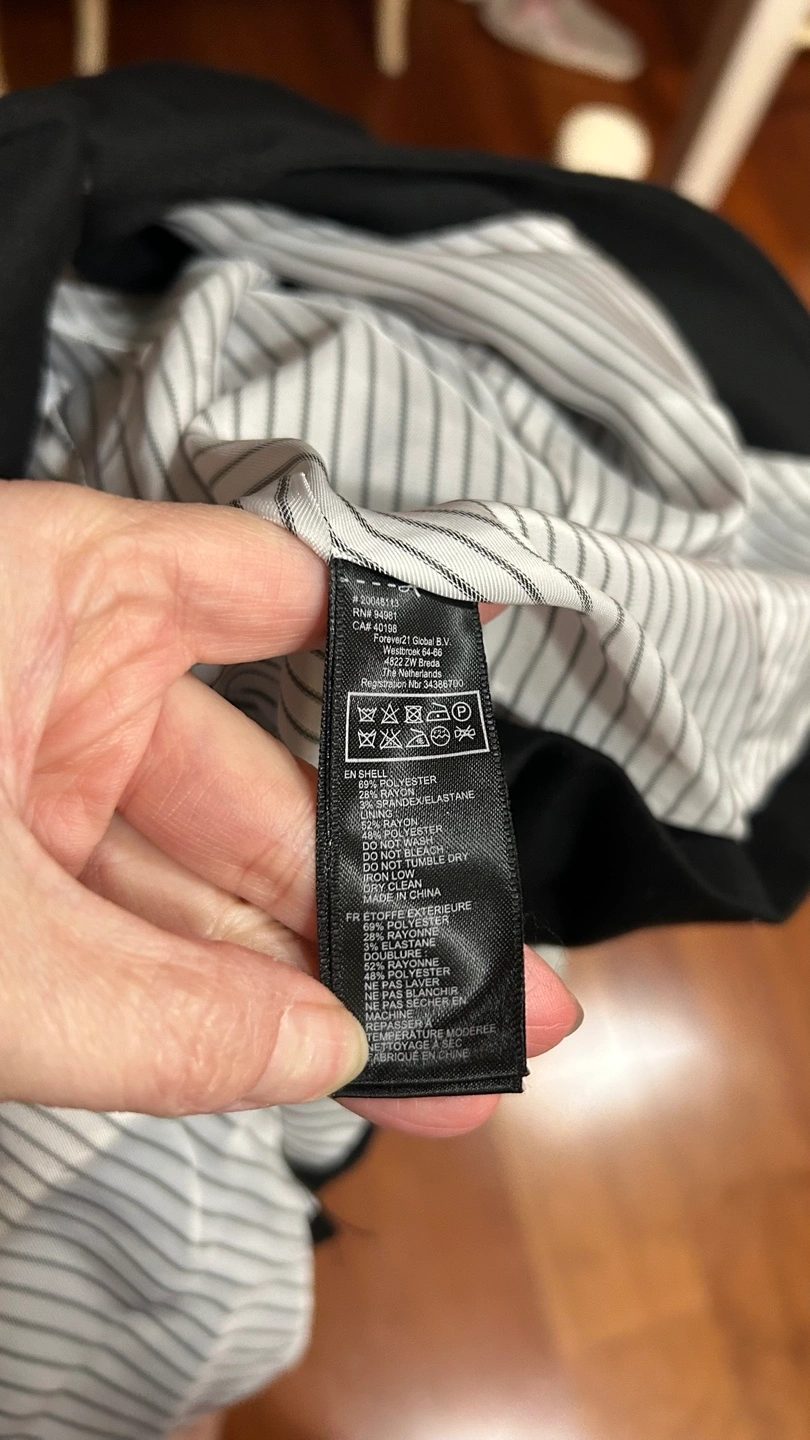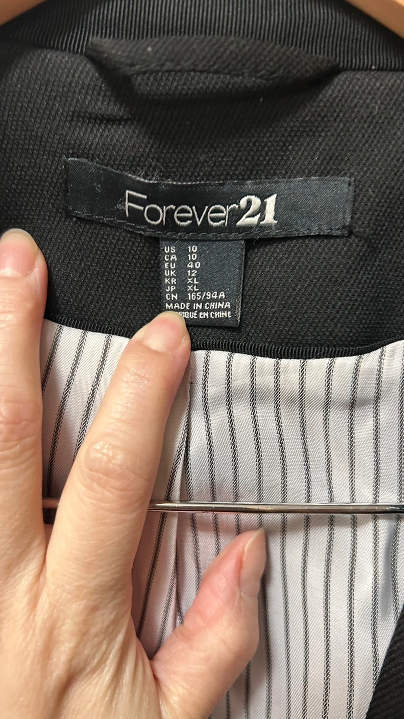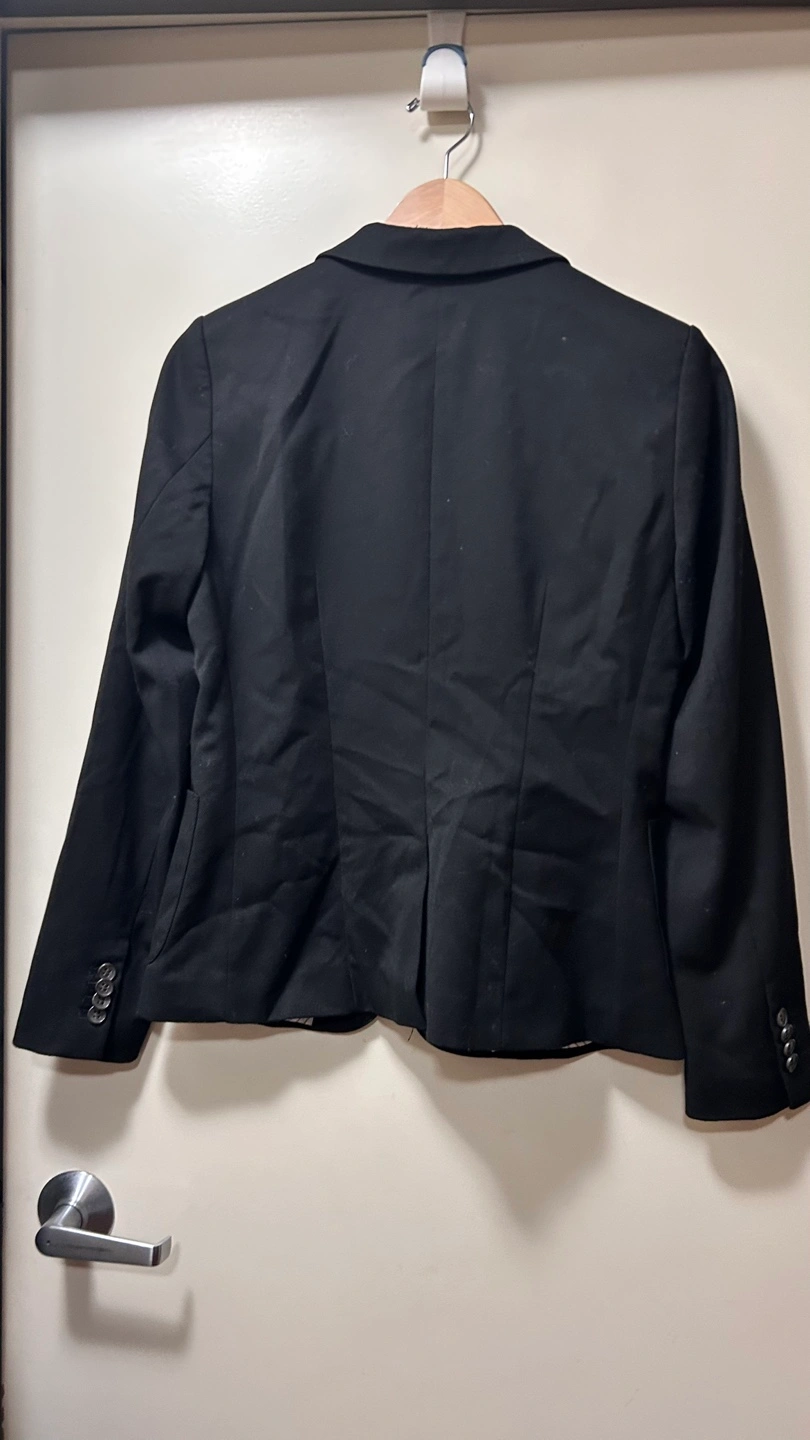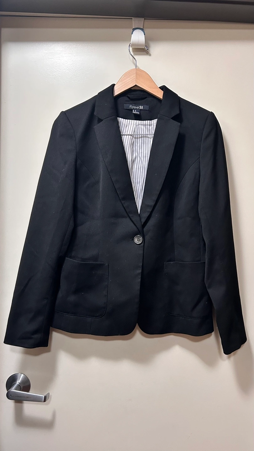 Black blazer. Size 10. Long sleeves. Two pockets. Button closure. Striped lining. Made in China.
