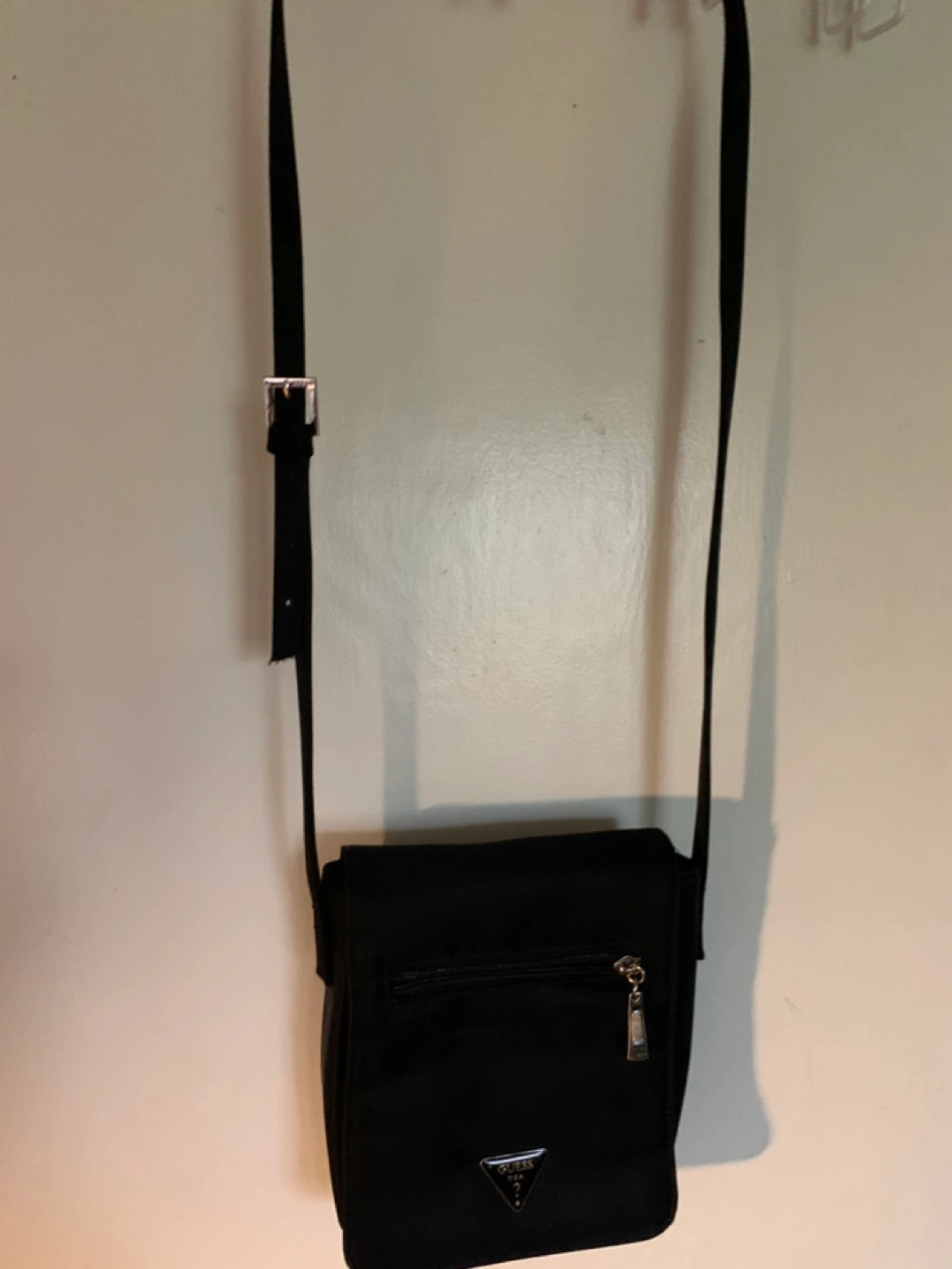 Small black crossbody bag. Features adjustable strap, zipper closure, and interior pocket. Excellent for everyday use.