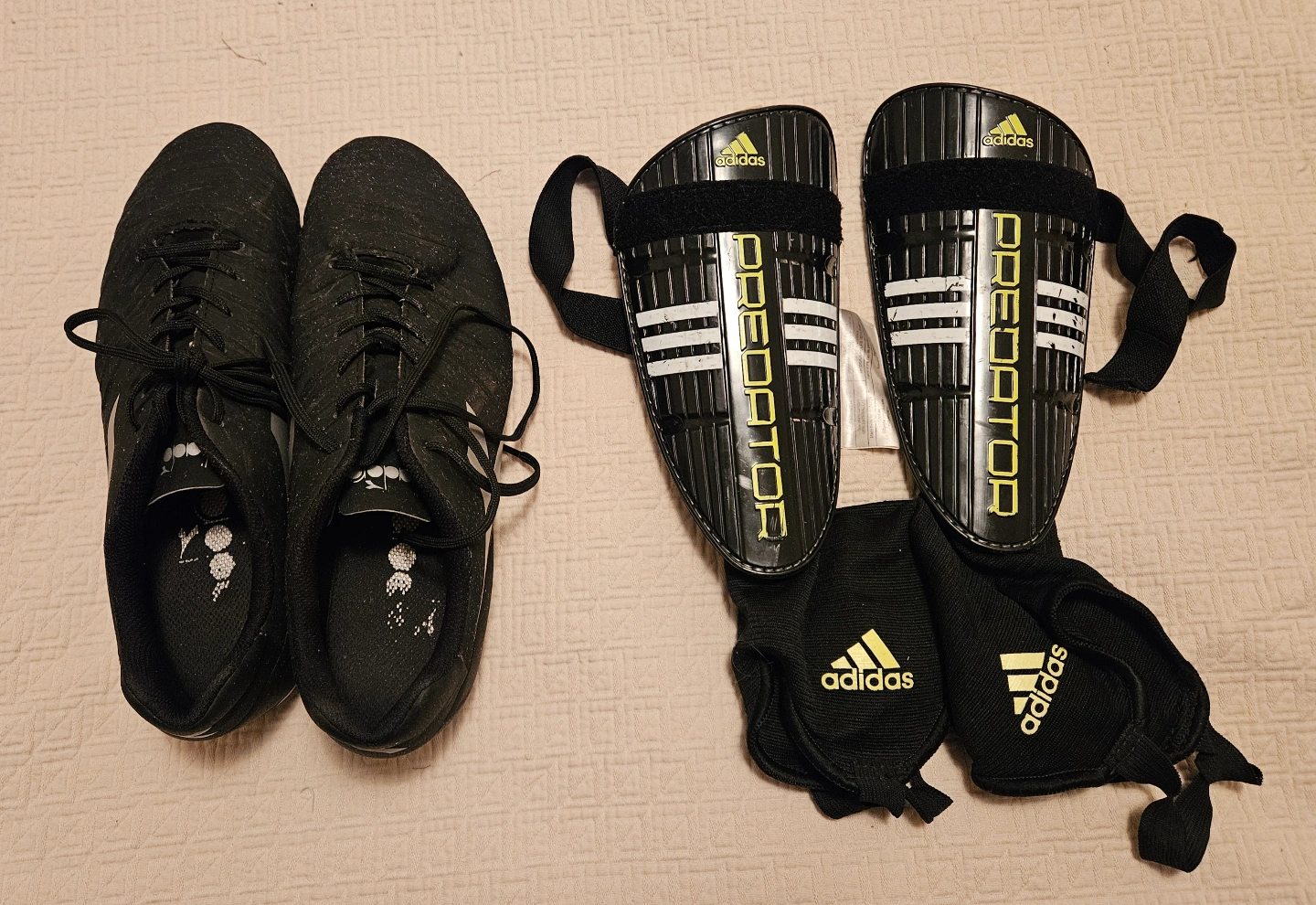 Men's soccer Cleats used only 1 season, and Adidas size Large shin pads. (some dust from cleaning wipes can easily be brushed off) #freecycle. Pick up Victoria Park & St. Clair.