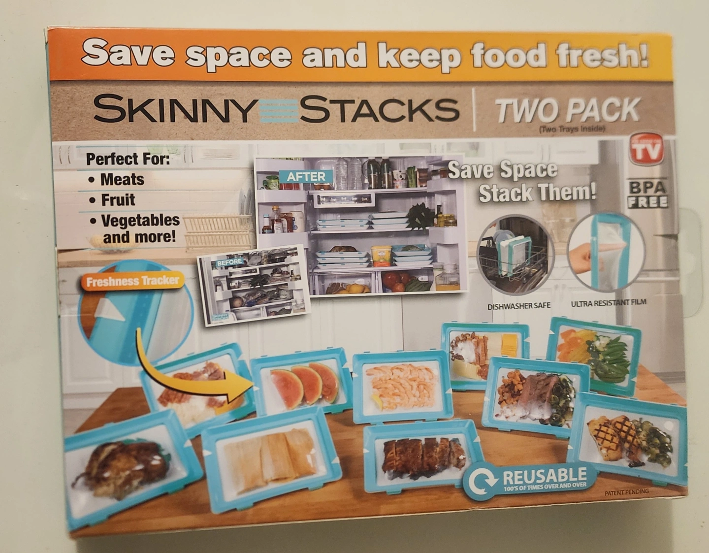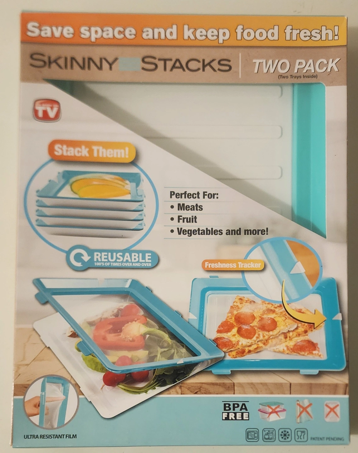 Stackable food storage trays. Two trays included. BPA free. Reusable. Ultra resistant film. Perfect for meats, fruits, vegetables. Saves space. Dishwasher safe. Freshness tracker.