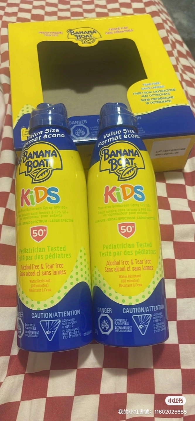 Two bottles of Banana Boat Kids Sunscreen SPF 50+. Value size, pediatrician tested, alcohol and tear free.
