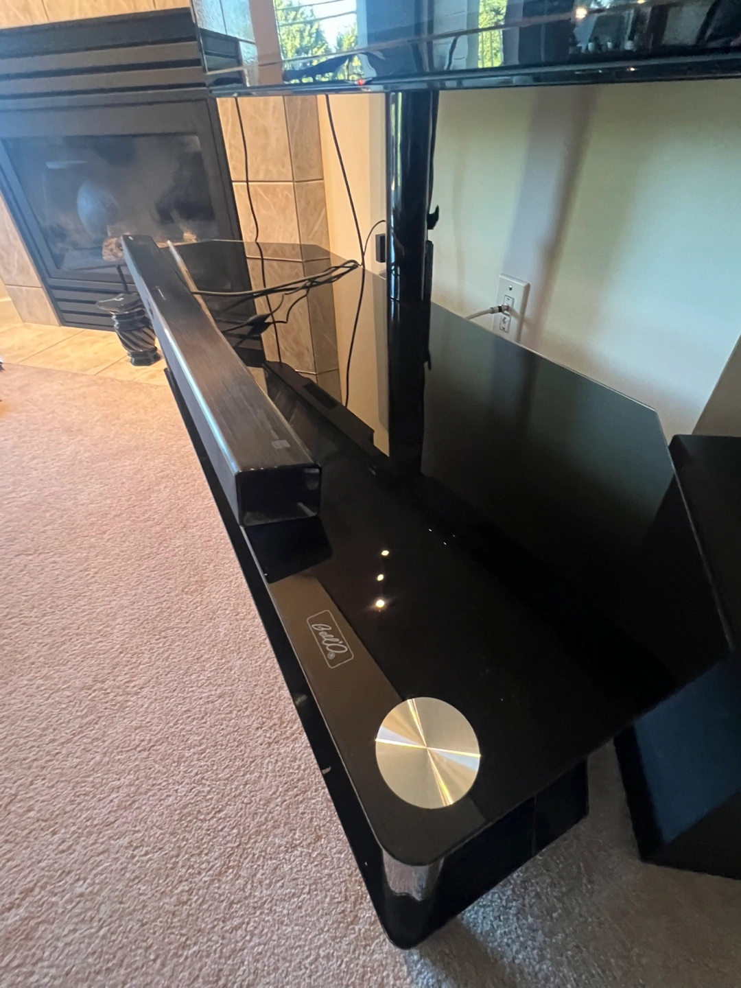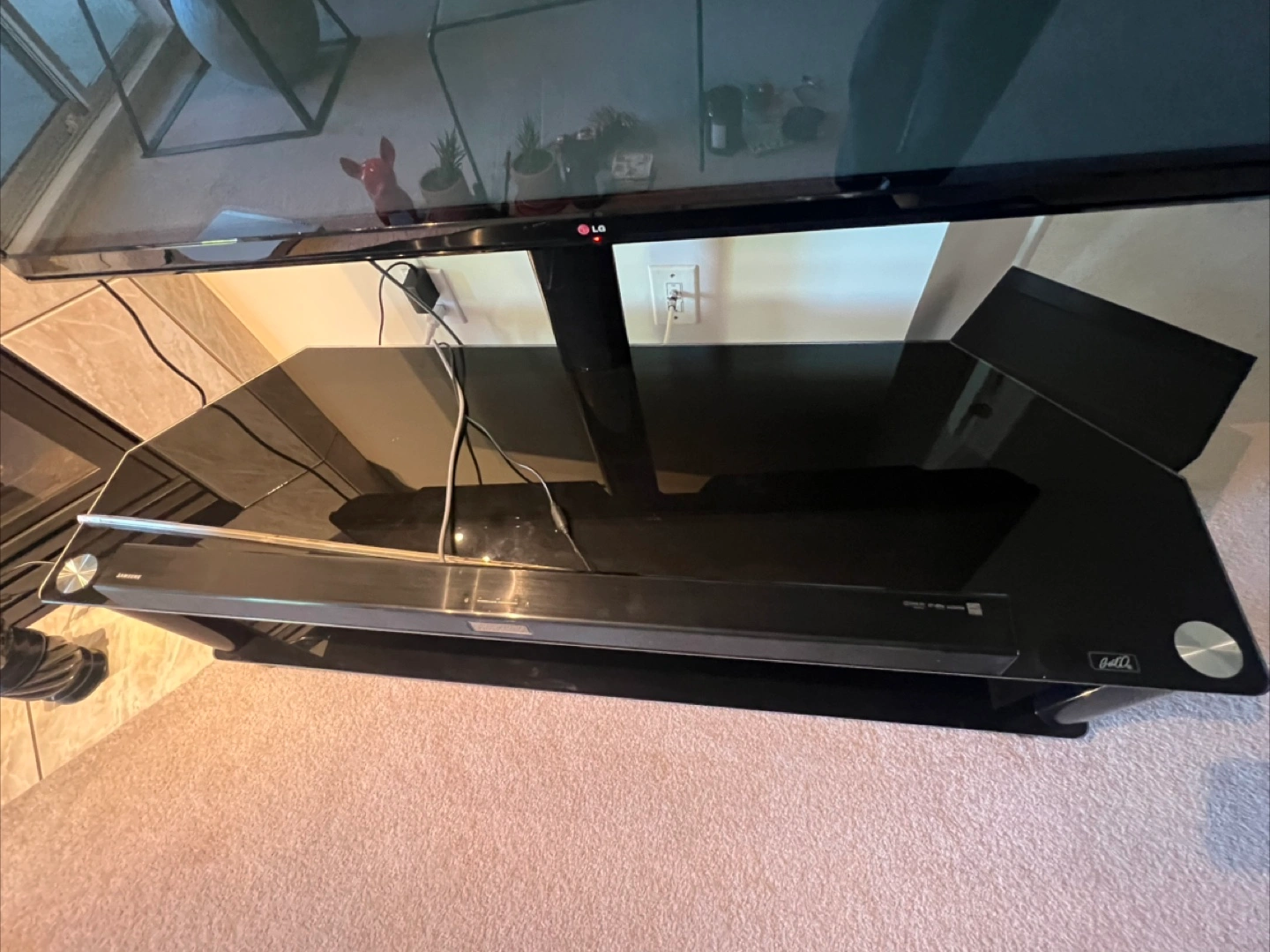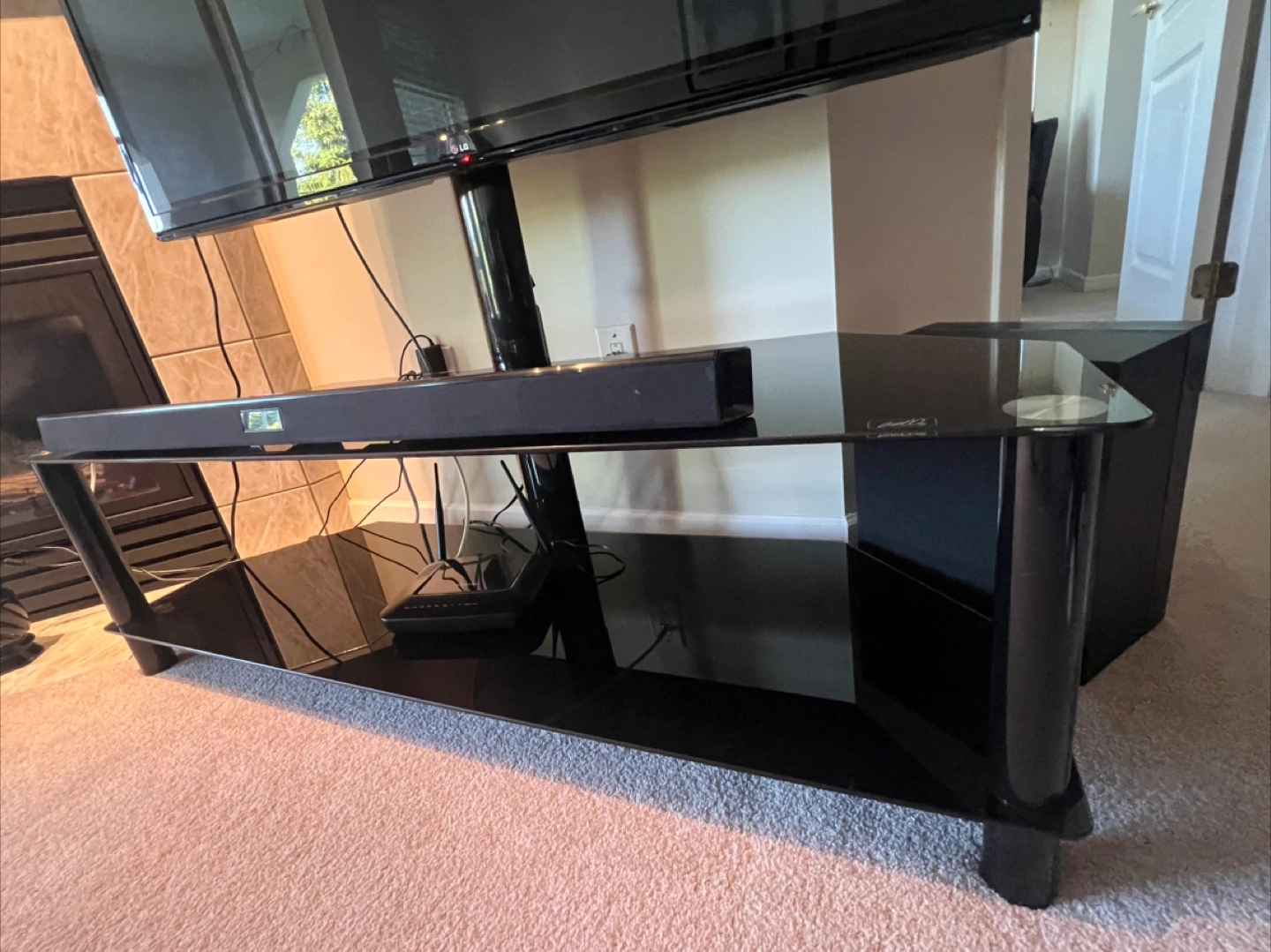 Sleek black glass TV stand. Holds a large flat-screen TV. Excellent for modern living rooms. Excellent conditions no scratches no stains .