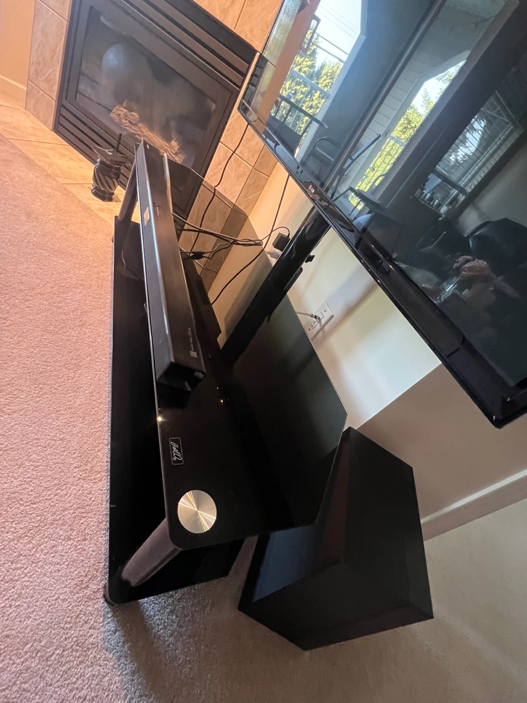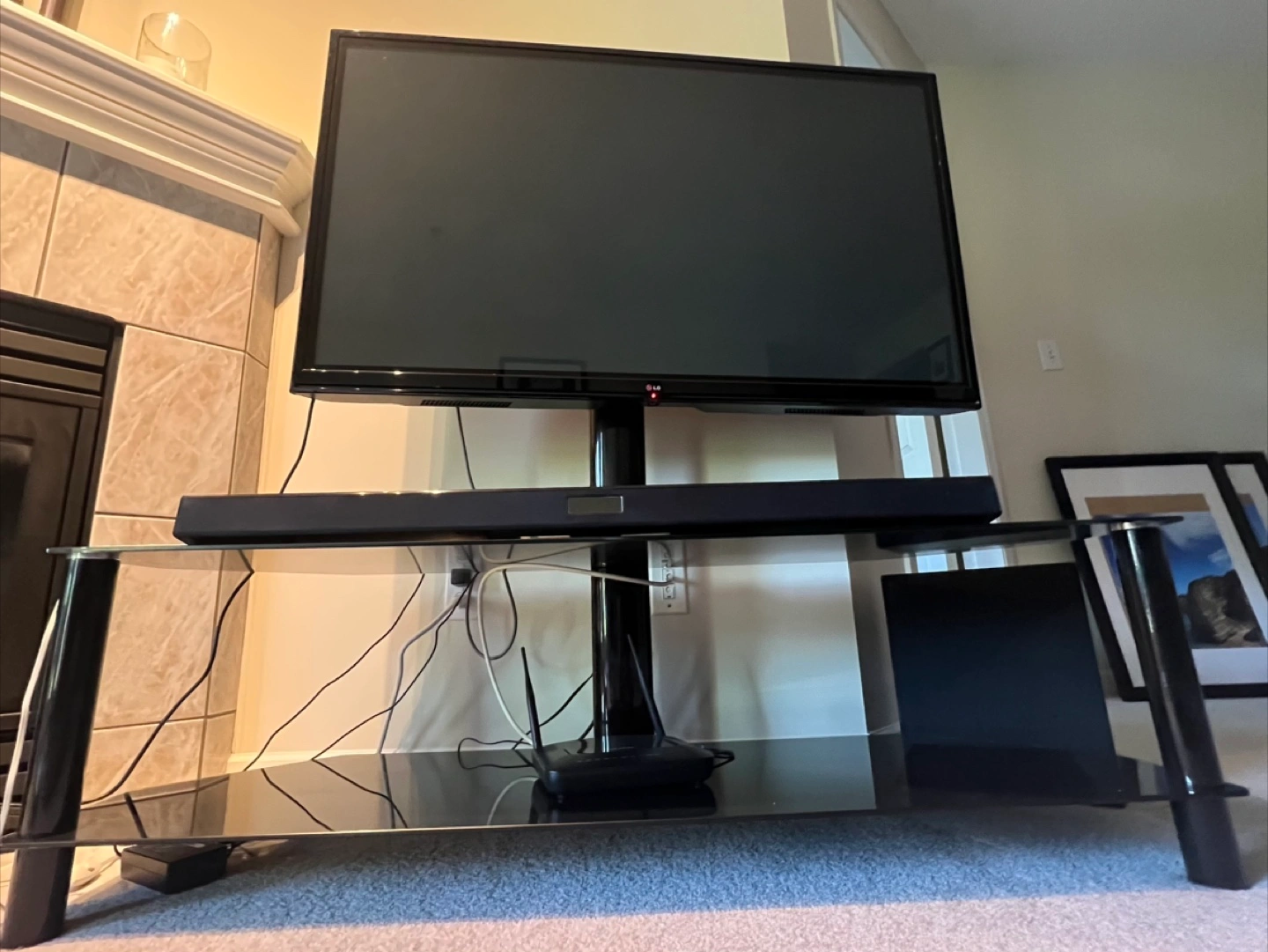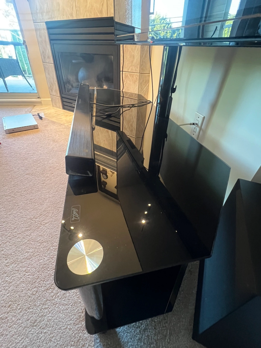 Sleek black glass TV stand. Holds a large flat-screen TV. Excellent for modern living rooms. Excellent conditions no scratches no stains .