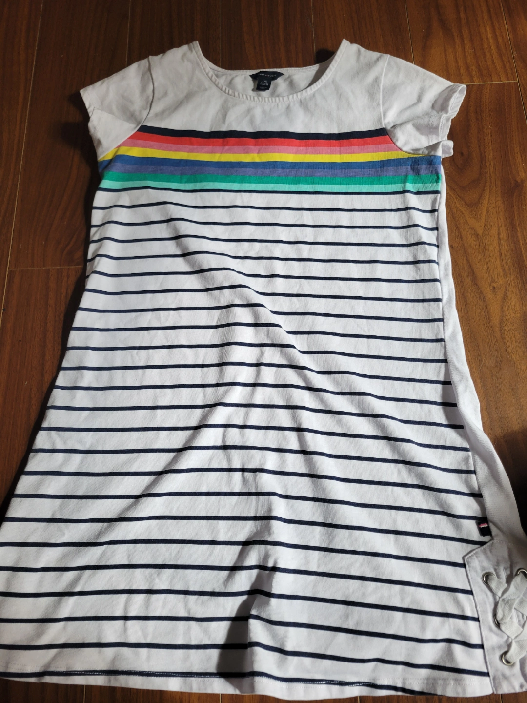 Adorable Tommy Hilfiger girls' dress. Size L/12-14. Features rainbow stripes and side lacing detail. Made in China. Short sleeves. Lightweight cotton material.