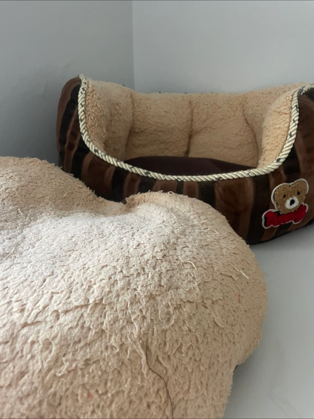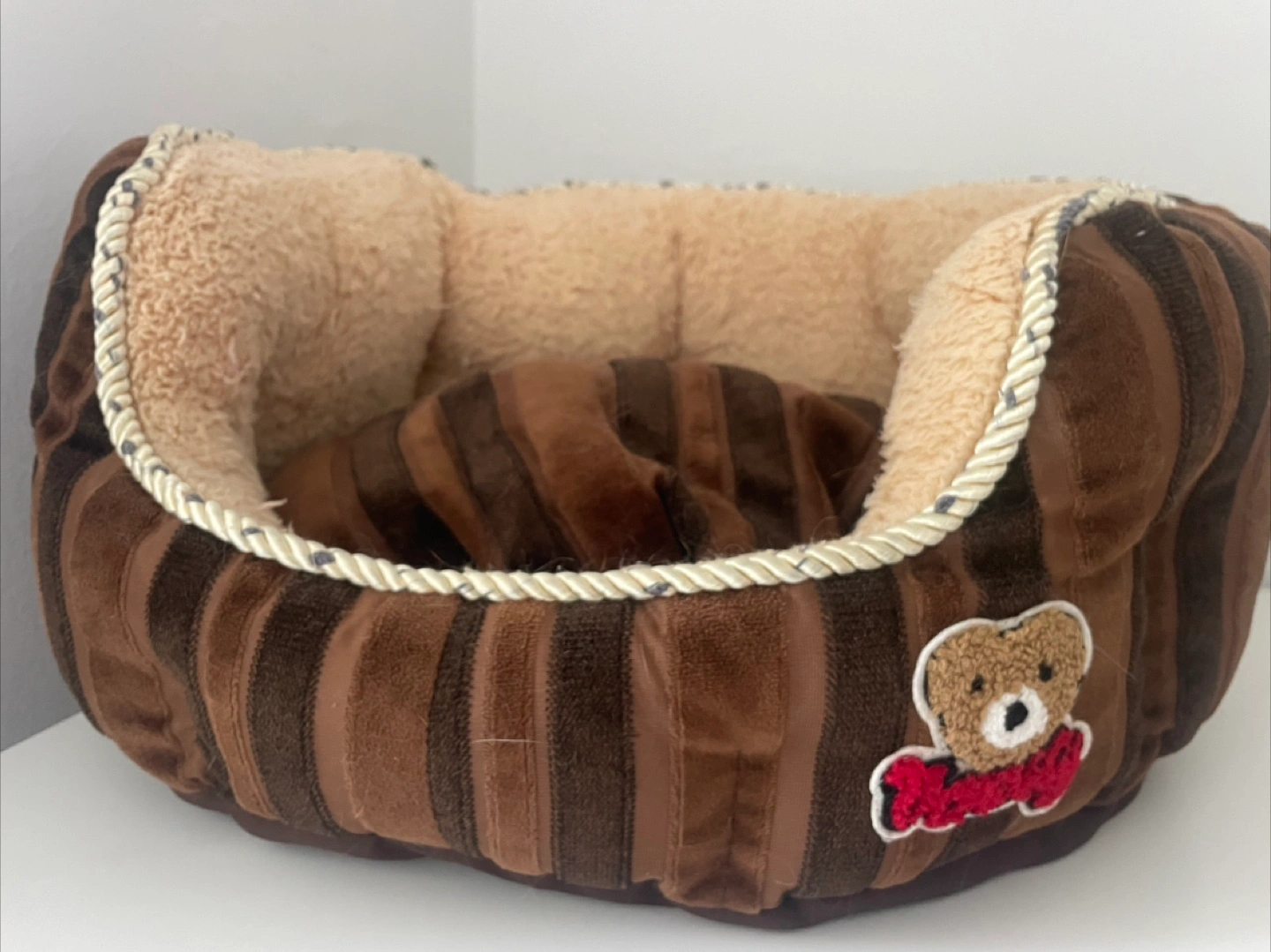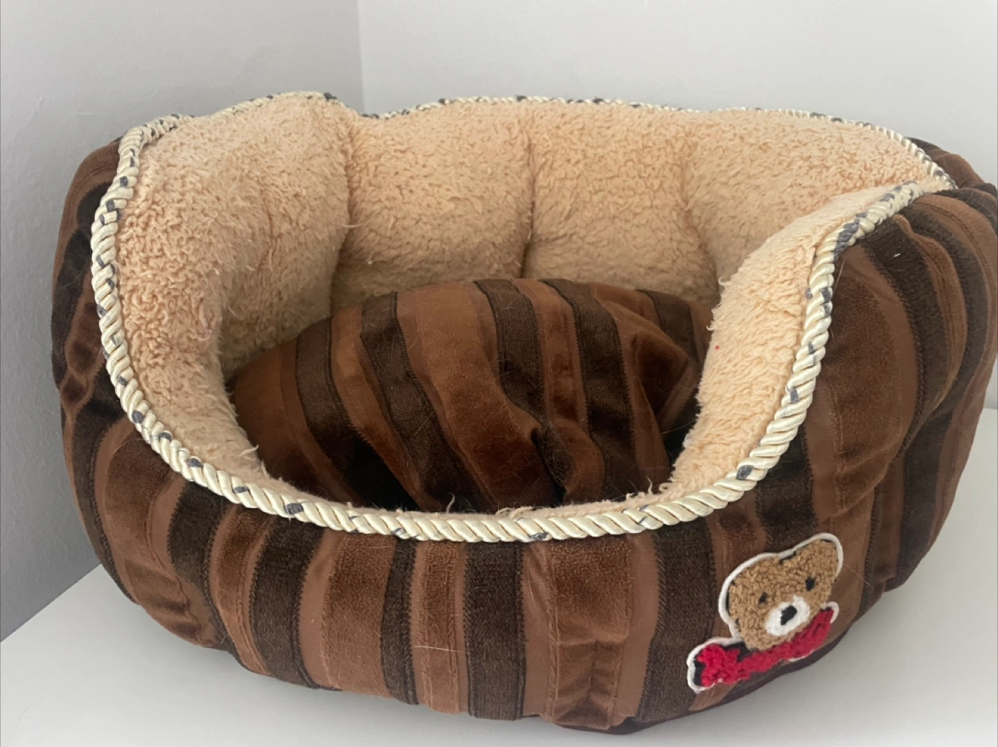 Cozy pet bed. Brown and beige. Features a cute embroidered bear. Soft material. Suitable for small to medium-sized pets.