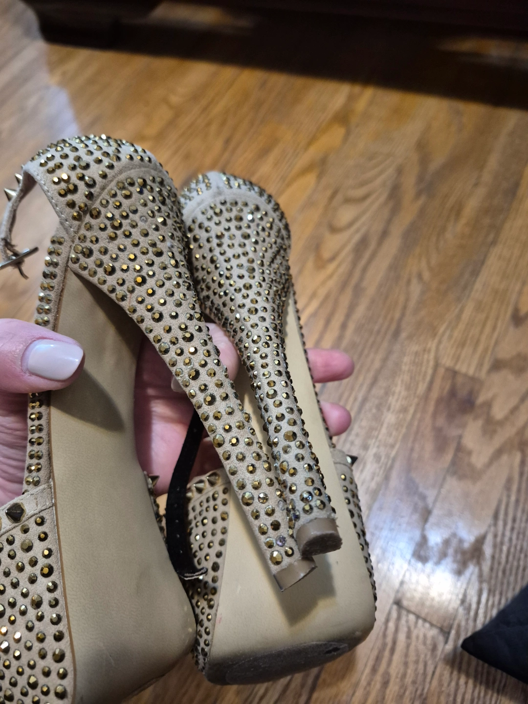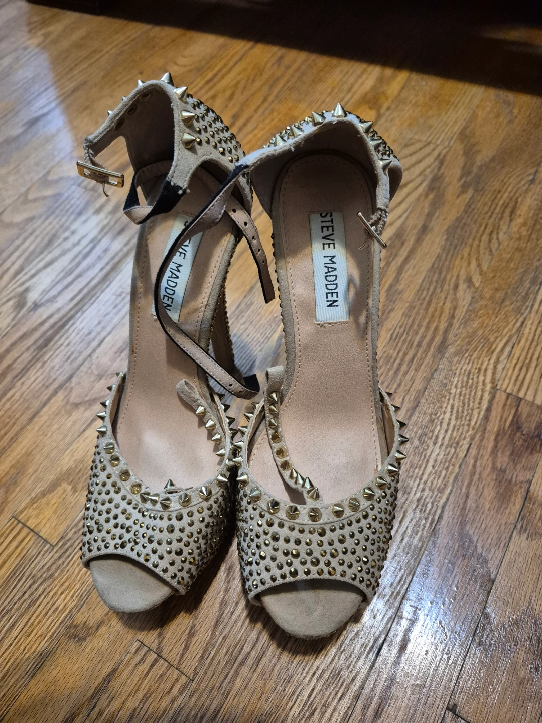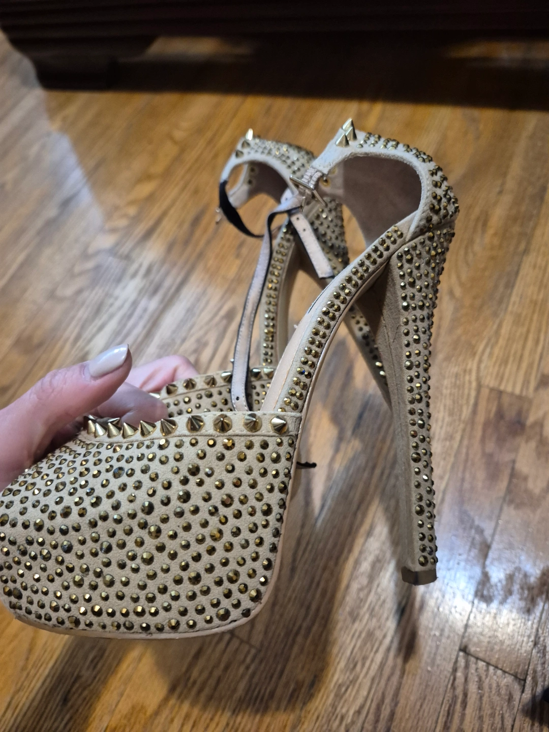 Beautiful beige platform heels. Covered in gold studs. Ankle strap closure. High heel. Size 7.5-8. Pre-owned.