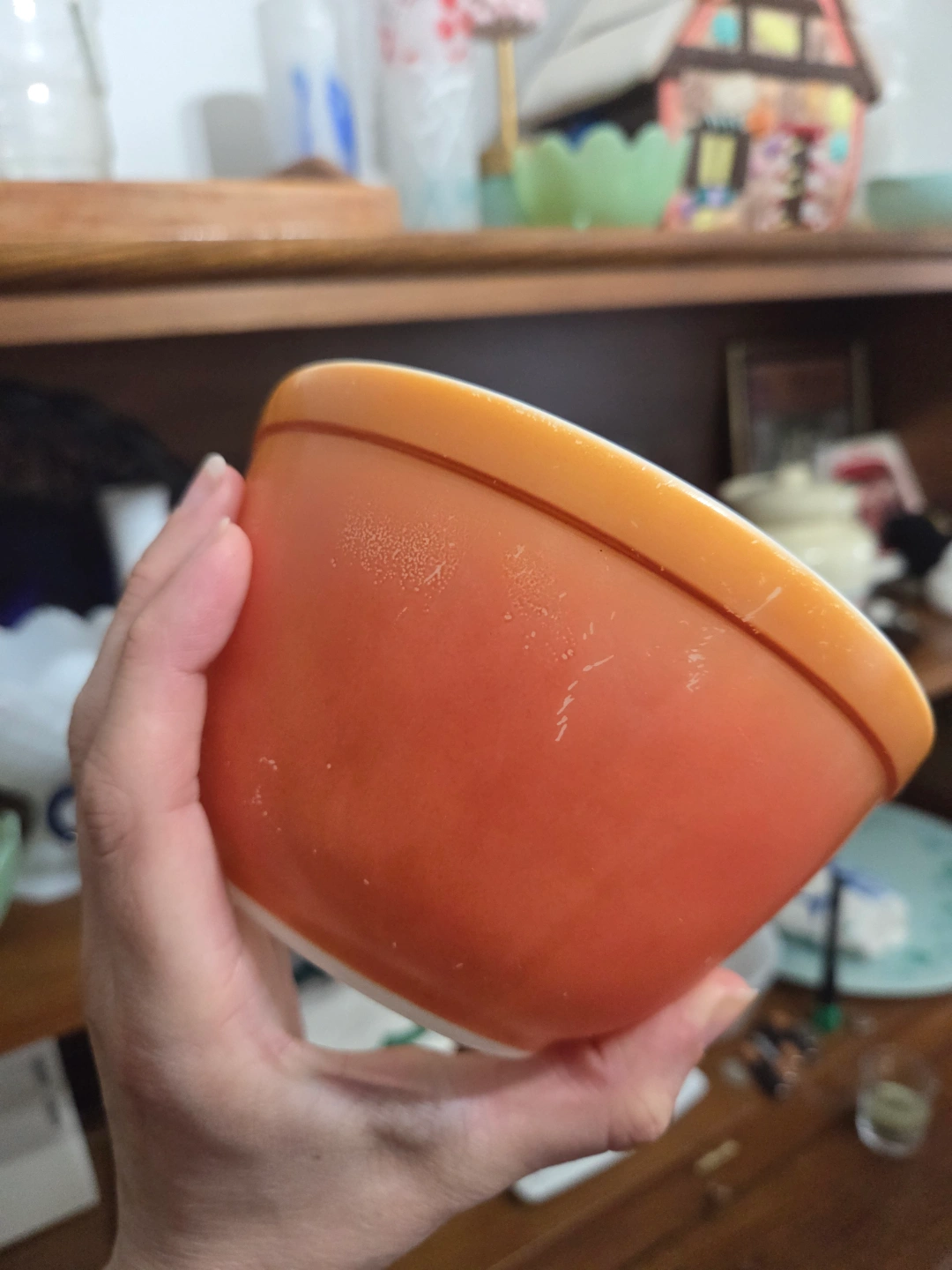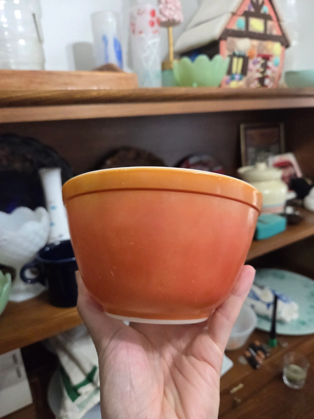 flame glo red to Orange ombre design. #401 pyrex bowl. perfect for sides, soup, baking etc excellent place holder for the set. Shows some signs of use and age on the outside (not glossy) but no chips or cracks. Great for adding to your collection! Must pickup. Please. no etransfer or long holds. this is a cash price. bring cash. This is in storage and I will meet you there. I can access the building during 8 to 430 Monday to Friday. No one is there outside of those times.