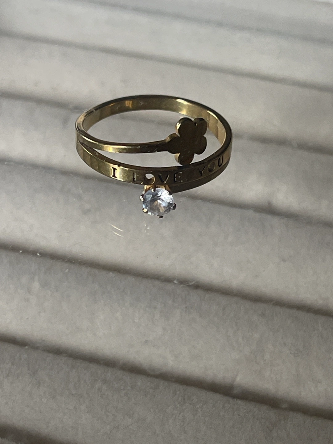 Adjustable gold-toned ring. Features a small flower design and 'I Love You' engraved on the band. Includes a small clear stone.