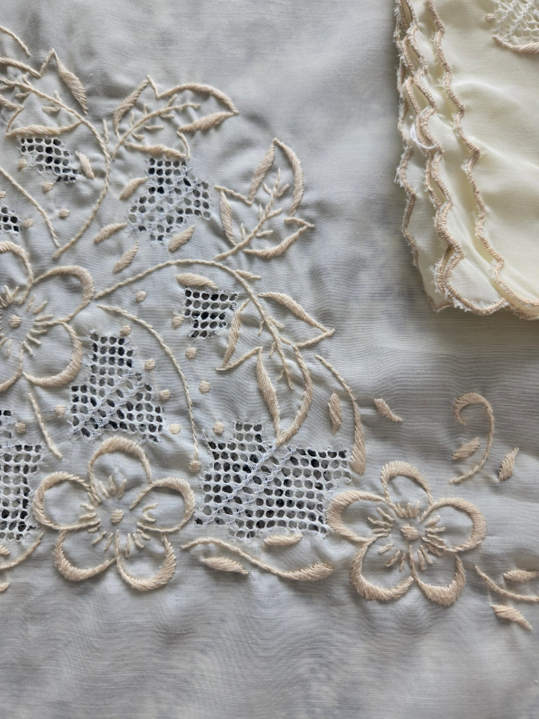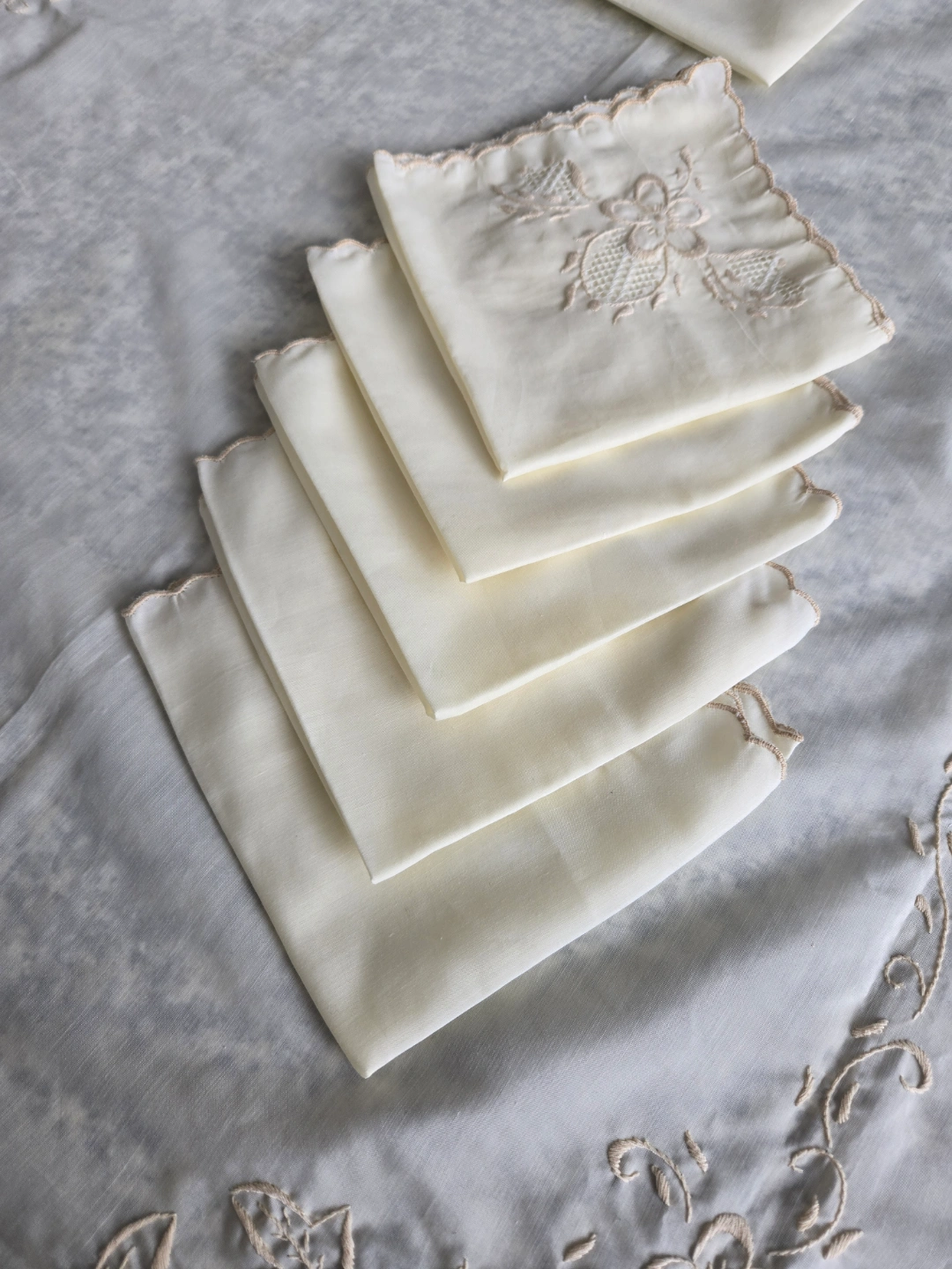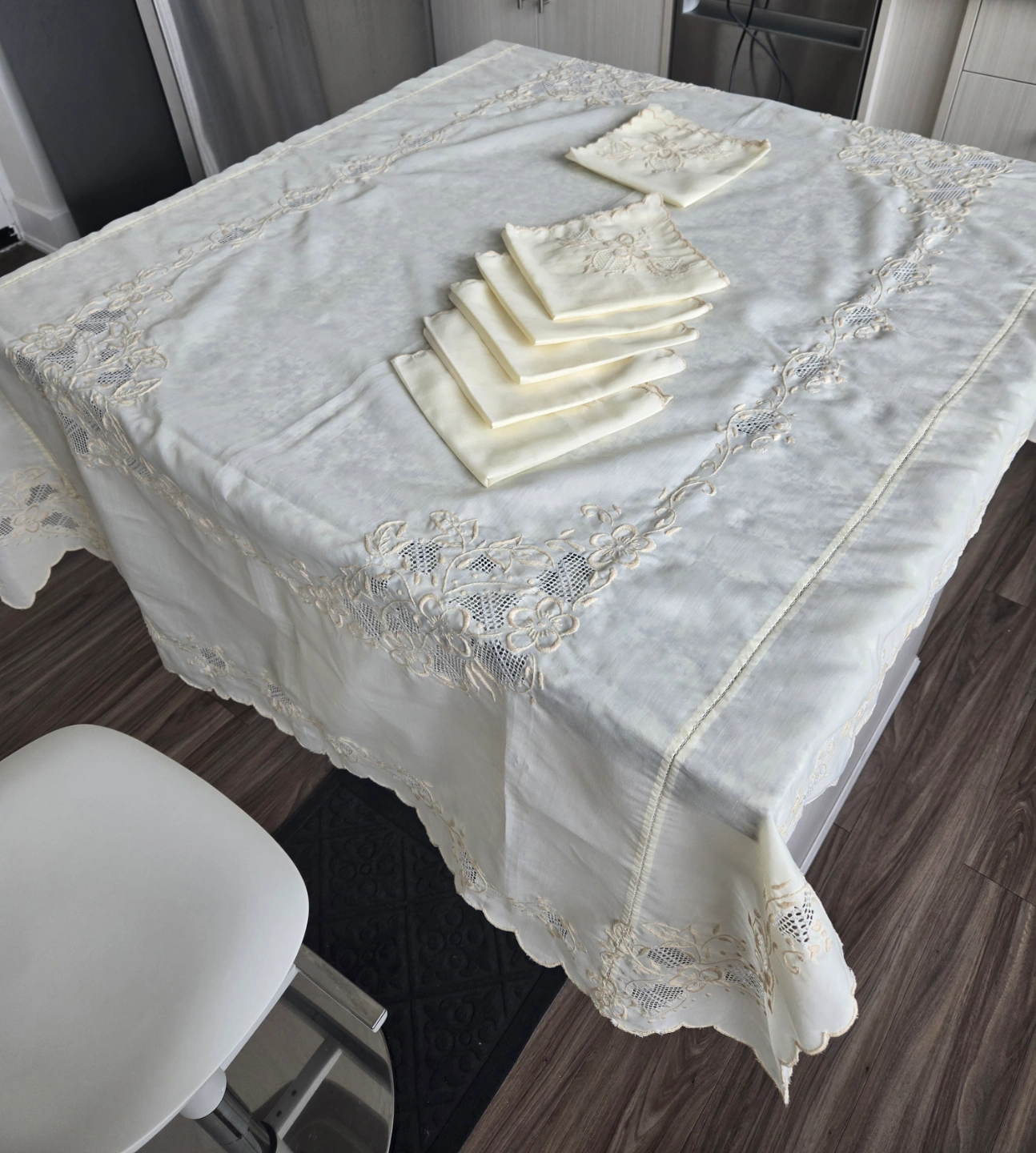 Beautifully embroidered tablecloth accompanied by 6 matching napkins in a lovely cream color with a floral design. Perfectly clean and in good condition.