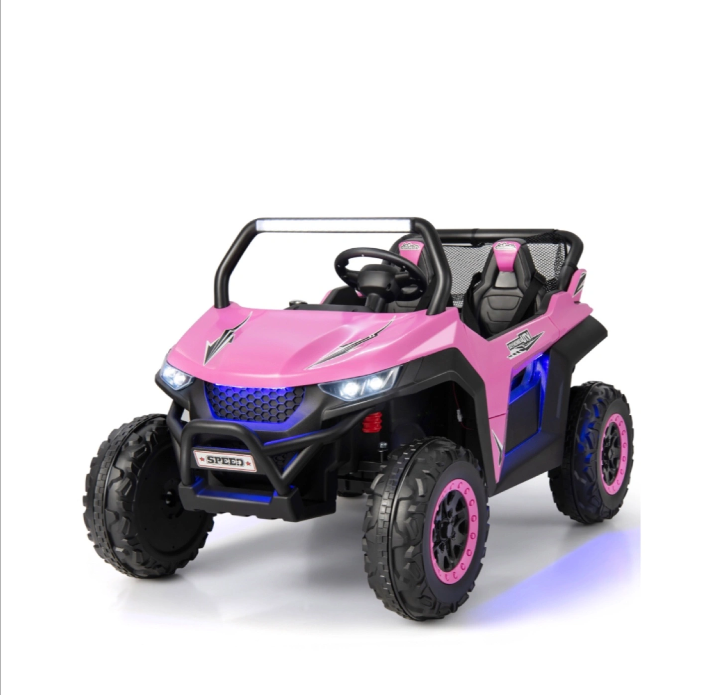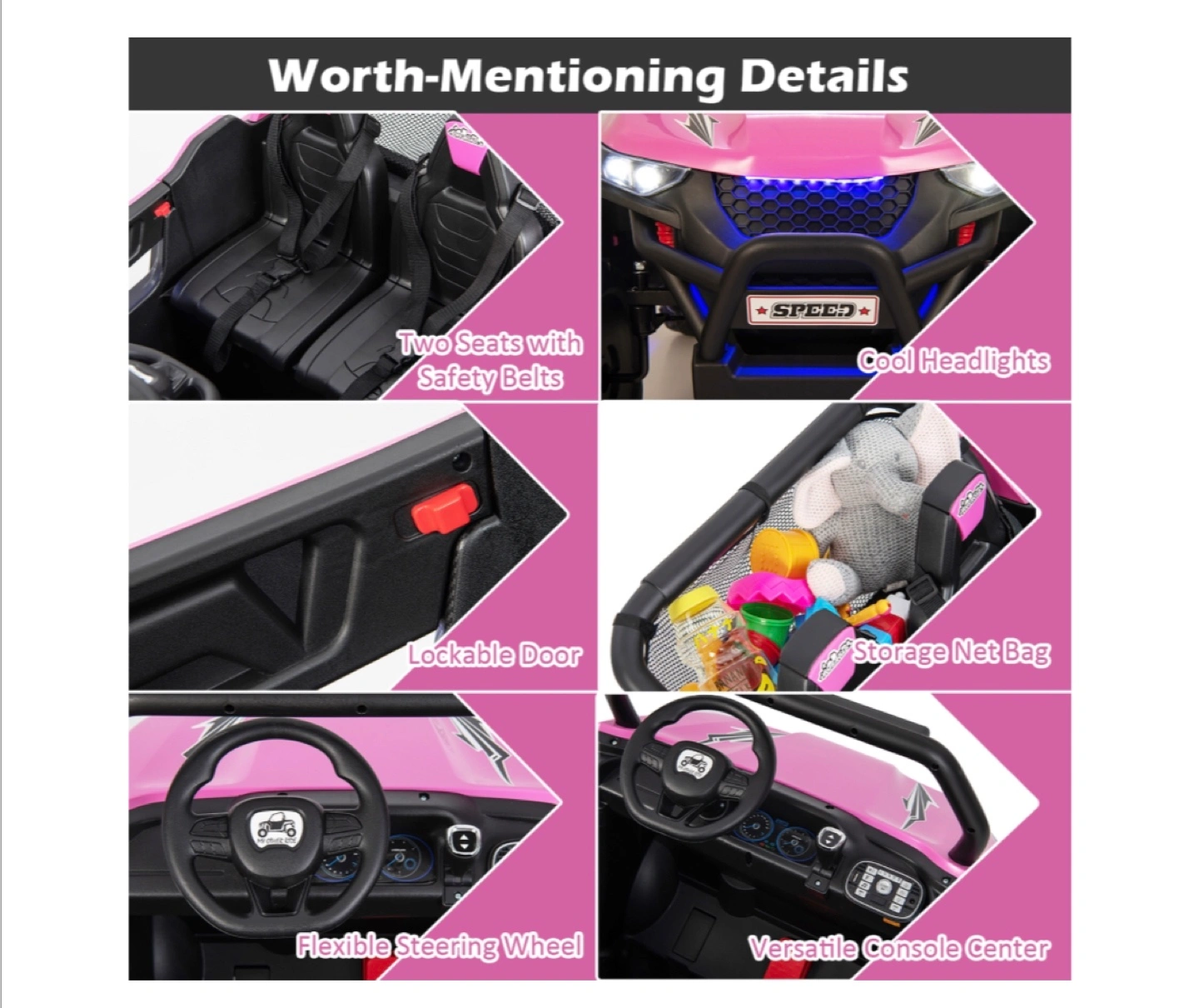 Two-seater children's electric ride-on car. Features include headlights, a storage net, safety belts, lockable doors, and a multifunctional media centre with USB and FM capabilities. Remote control operation available. Pink colour. Currently assembled, I can disassemble on request - it will come with instructions and necessary tools to assemble Overall Dimension: 46.5" x 29" x 28" (L x W x H) Seat Size: 19" x 9" x 11.5" (L x W x H) Net Weight: 44 lbs Weight Capacity: 130 lbs Batteries: 12V Motor: 12V Speed: 2-4 km/hr (1.24-2.5Mph) Play Time: 1-2 Hours Recharge Time: 8-12 Hours Charger: Output DC 12V Purchase price was 400$