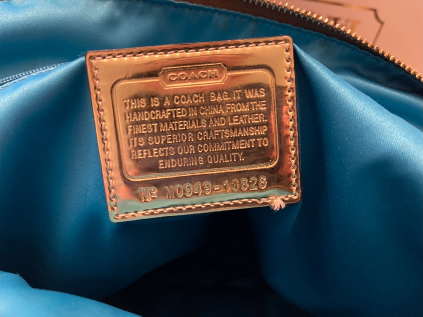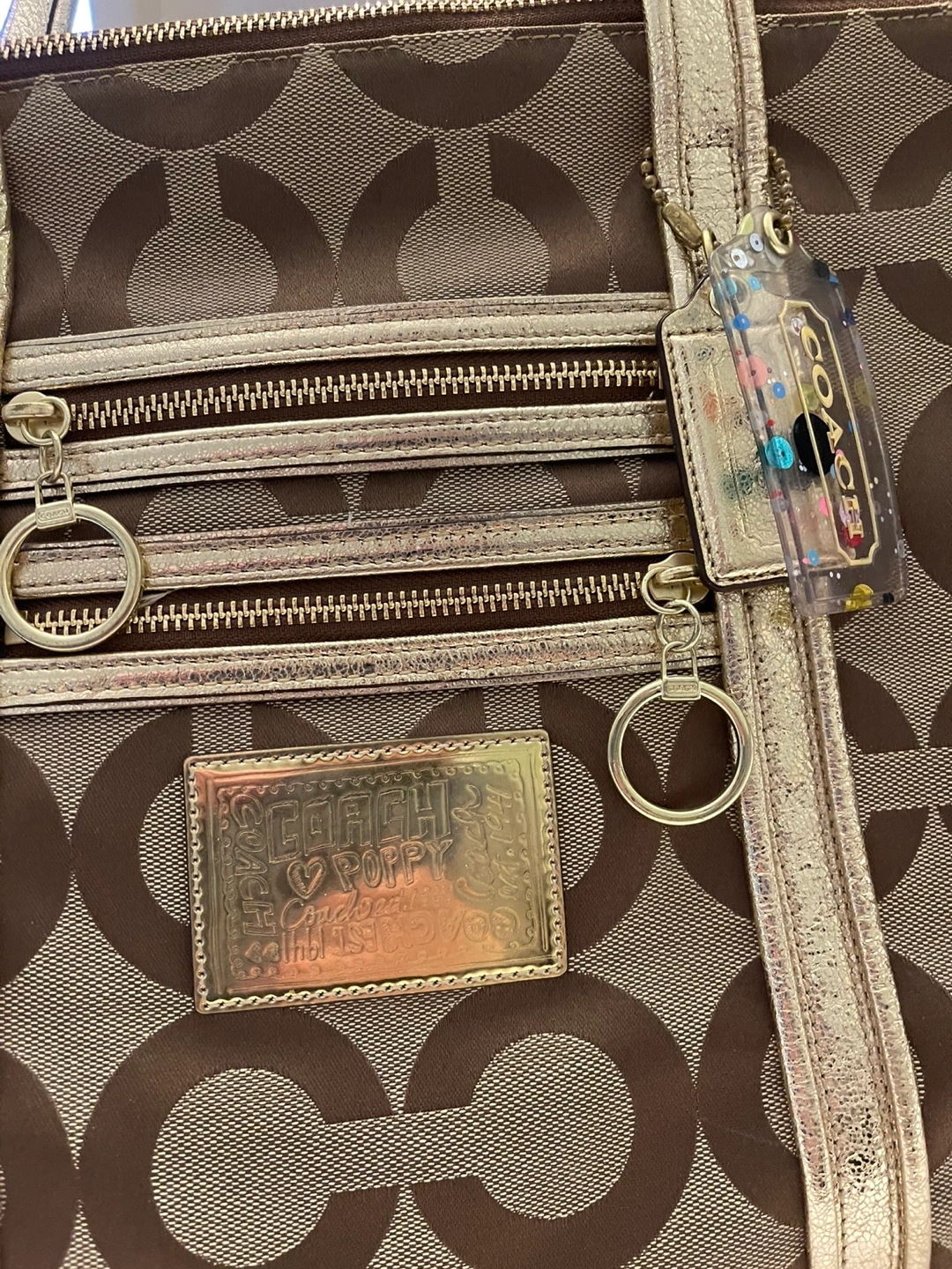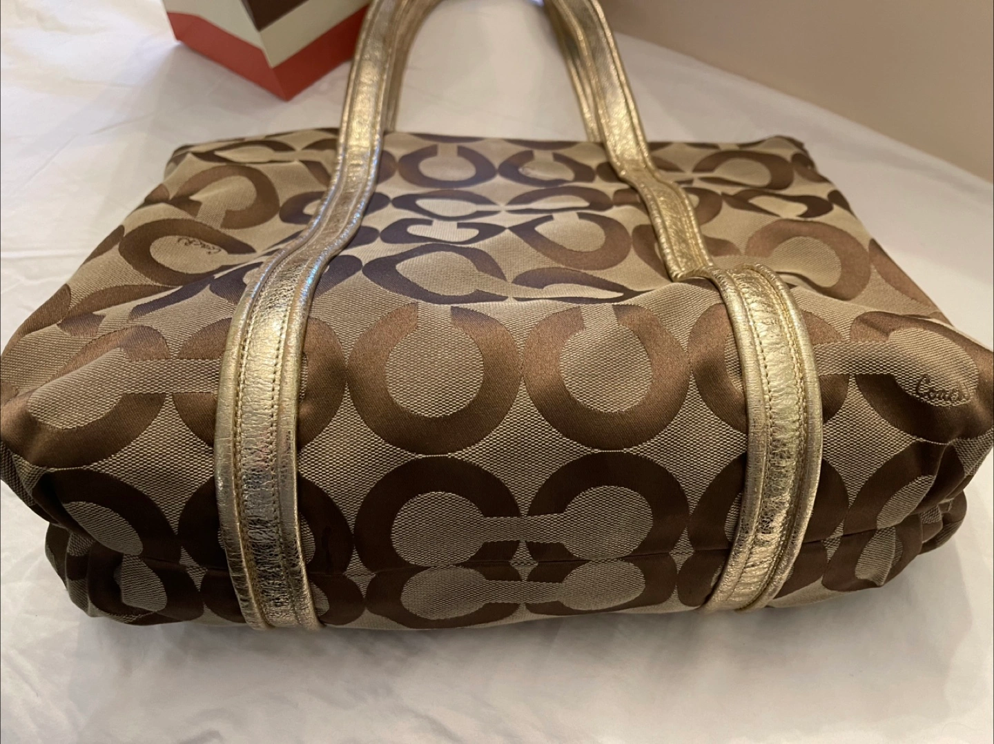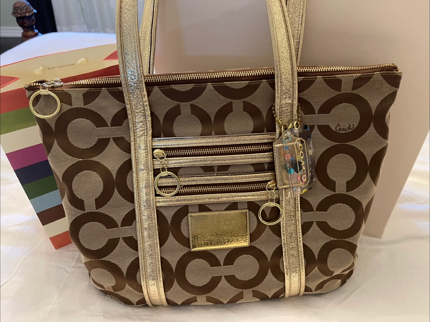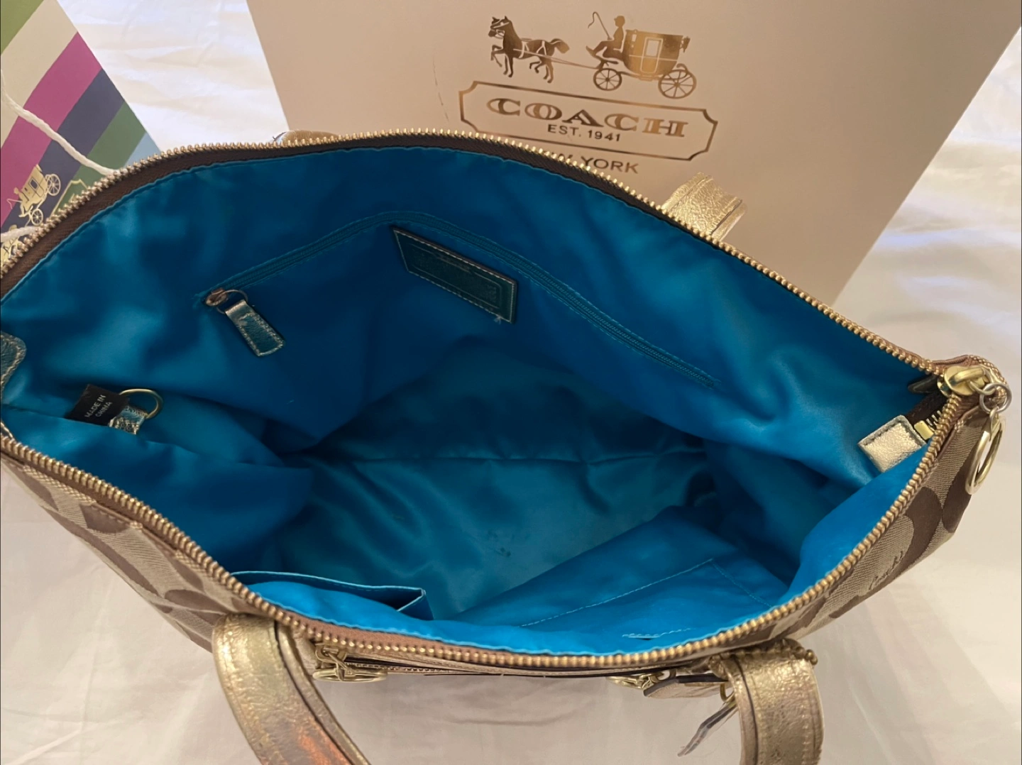 Authentic COACH Op Art tote bag canvas shoulder beige gold Style #13826 Coach tote with gold Coach and Poppy tag, teal internal color, gold hand straps 2-external zipper pocket with gold pull string. Dimensions: 13" tall x 15"width x 5" deep. zippered pockets external it also has 2-4" x 4" open internal pockets and one zippered pocket I would consider it size LARGE Only $100 firm Pick up near Bathurst and Steeles in Thornhill or meet in Yorkdale mall
