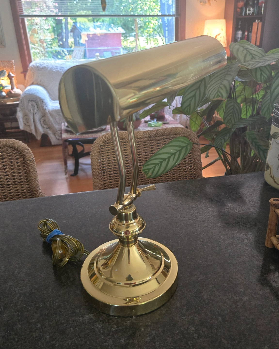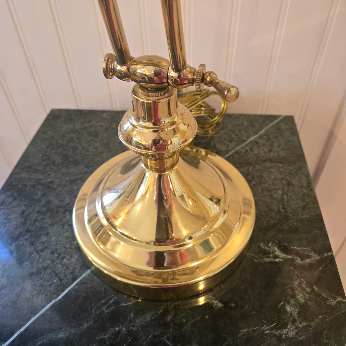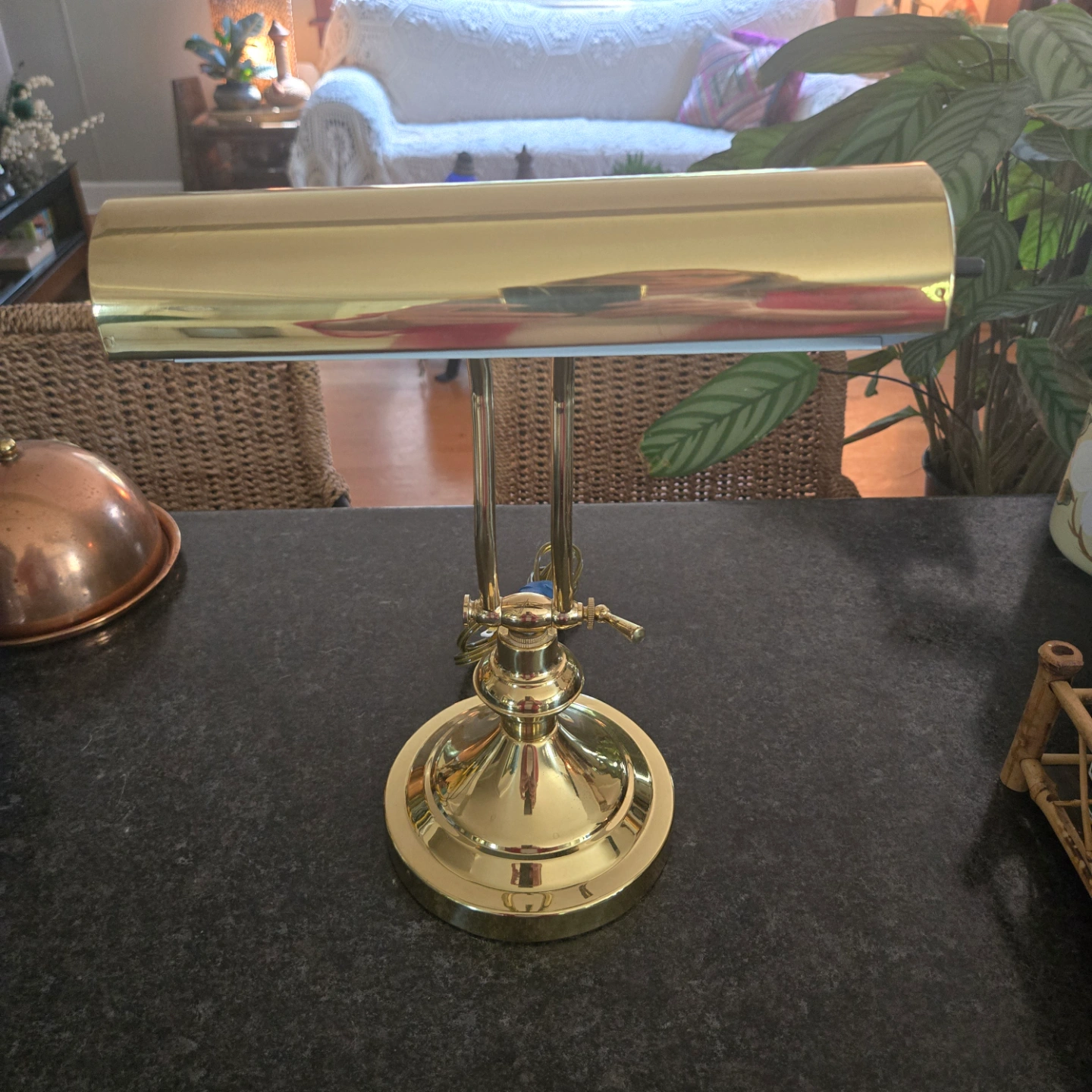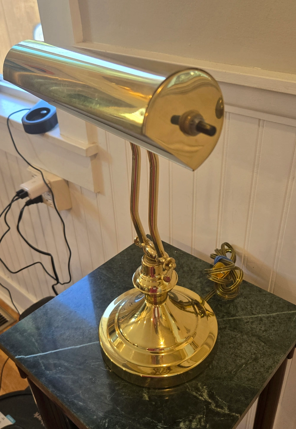 Classic brass desk lamp. Features a sleek, cylindrical shade and adjustable swing arm. Excellent for a piano, home office or bedside table.