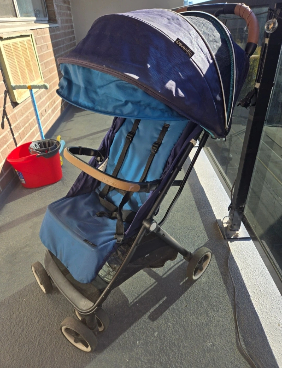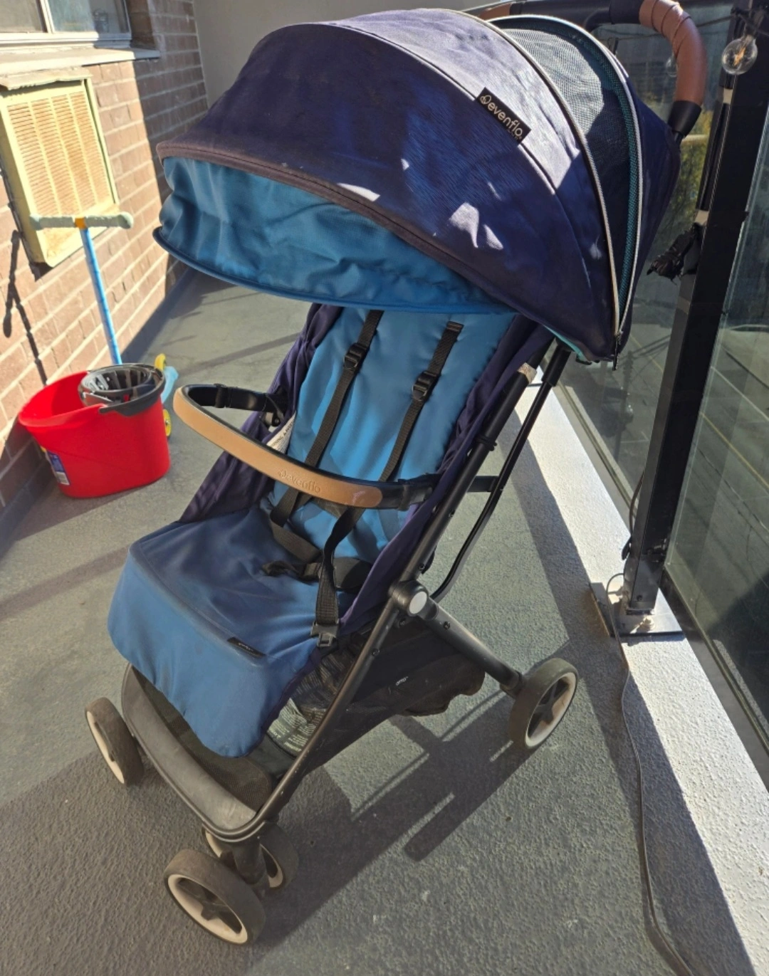 Lightweight, compact stroller. Features include a canopy, storage basket, and easy fold. Suitable for children up to 50 pounds. Used condition.