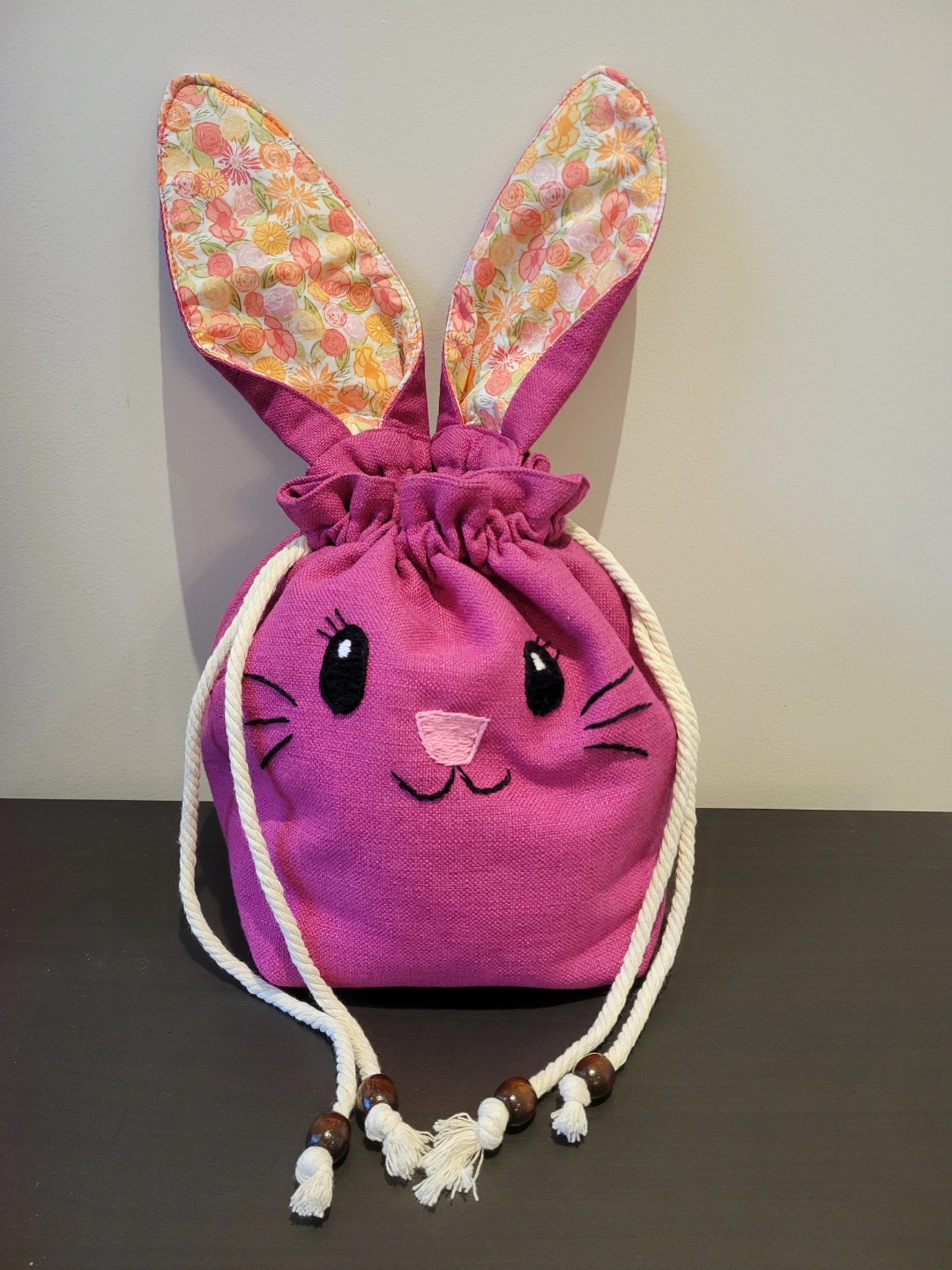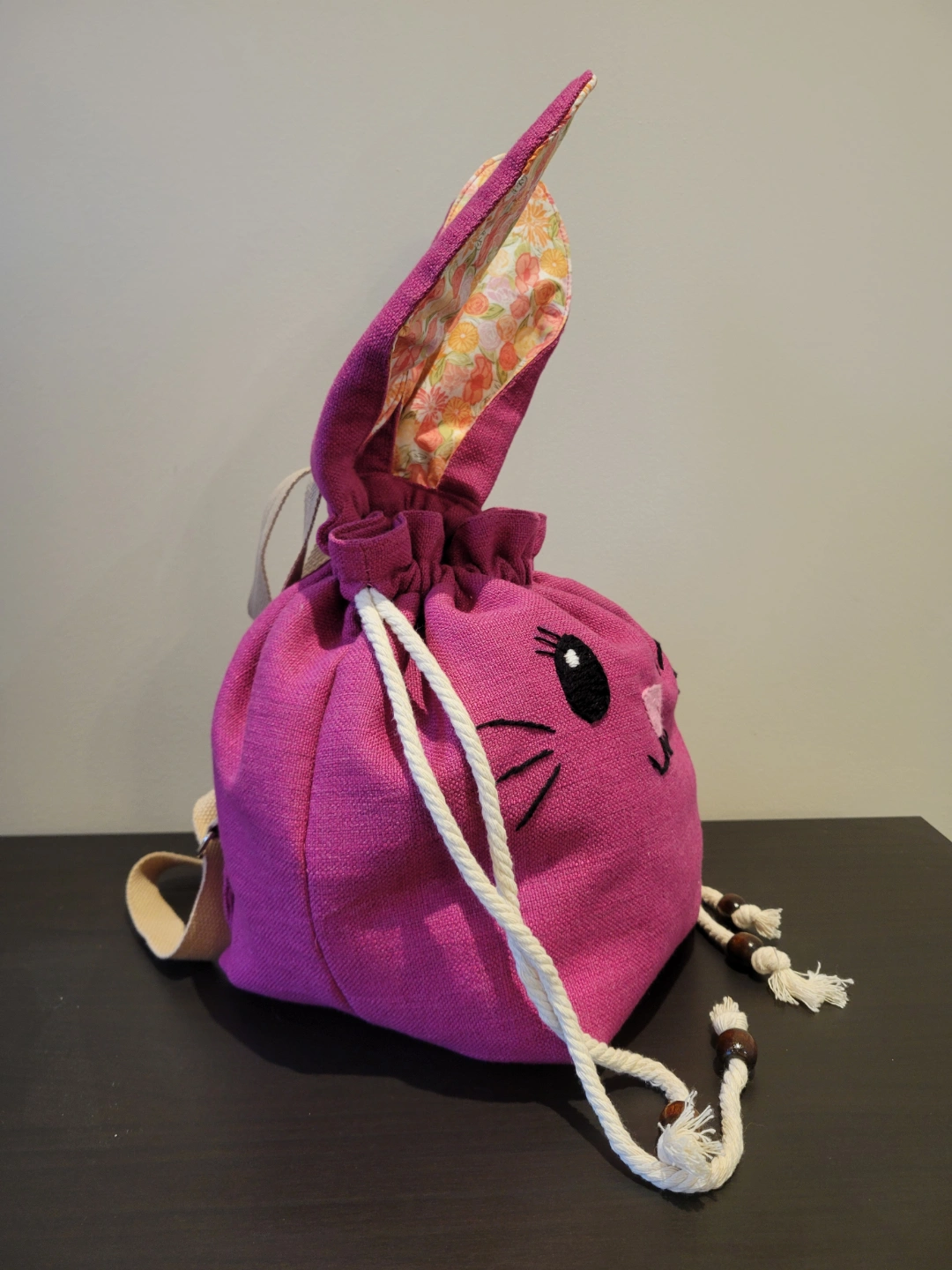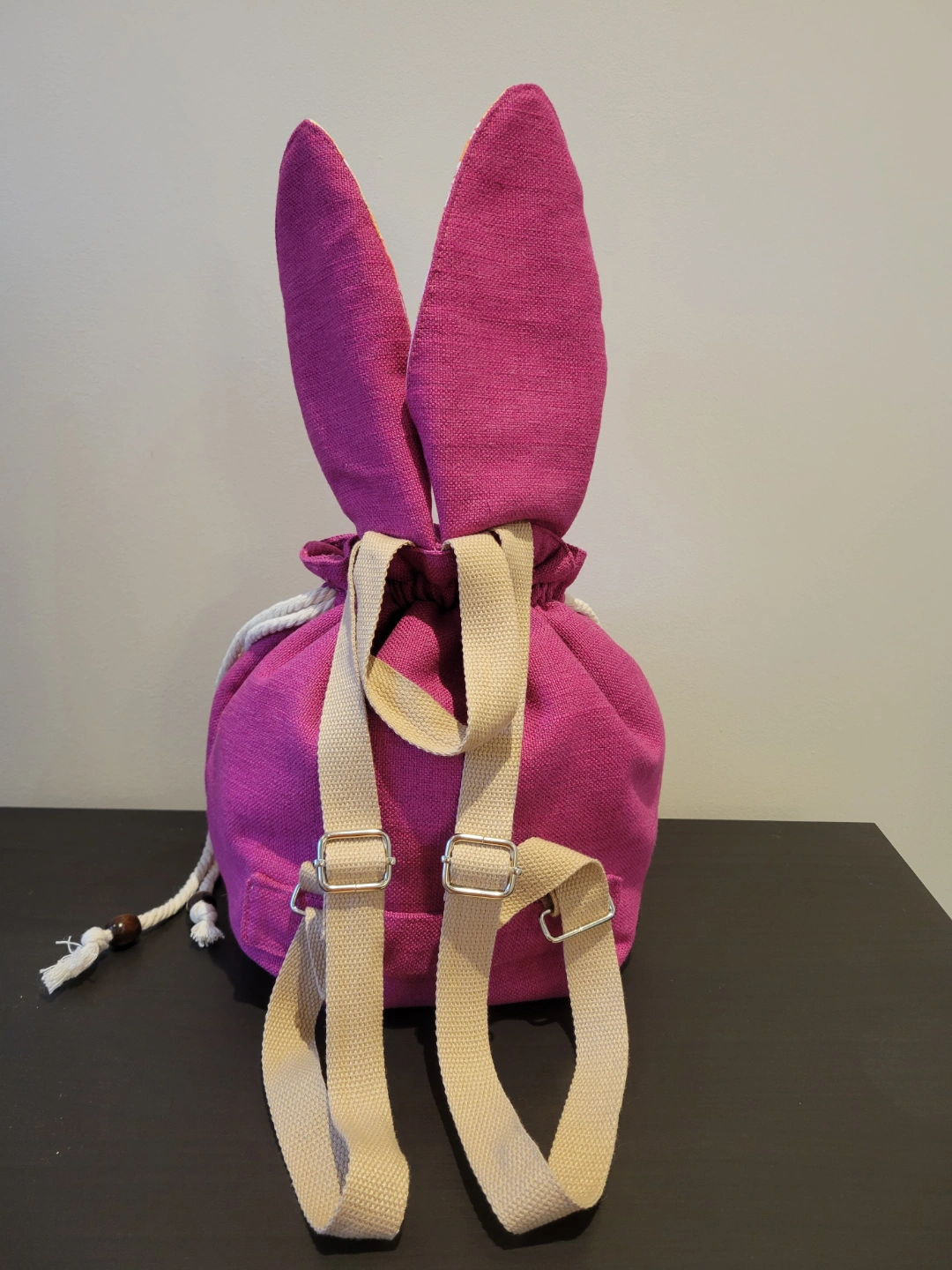 Handmade Pink bunny-shaped drawstring backpack. Features adorable bunny ears and face. Small size, perfect for kids. Adjustable straps. Unique handmade design. Instagram page:https://www.instagram.com/mitra.stitchandstyle?igsh=Yms4aWFqaWpvNDNp