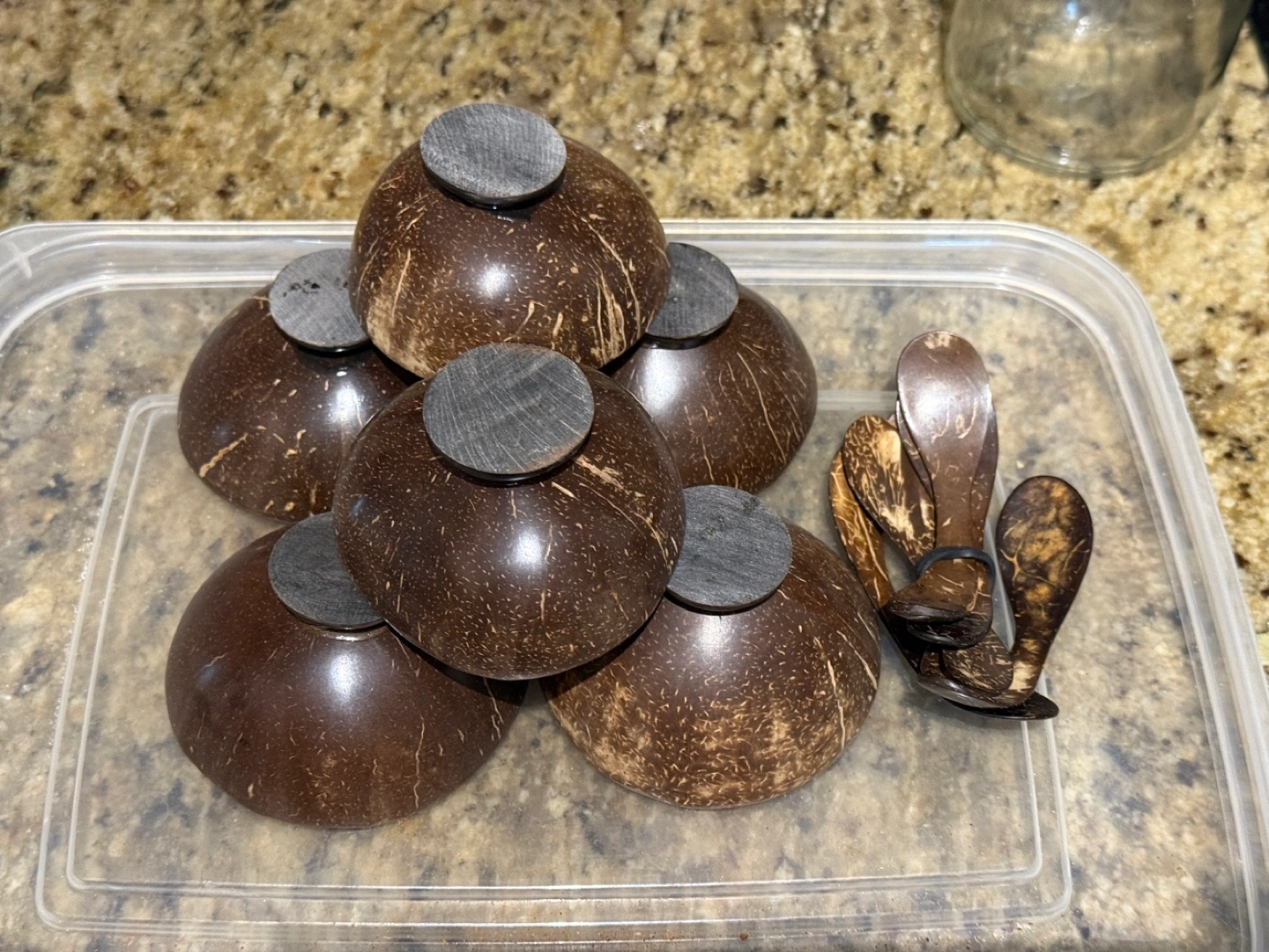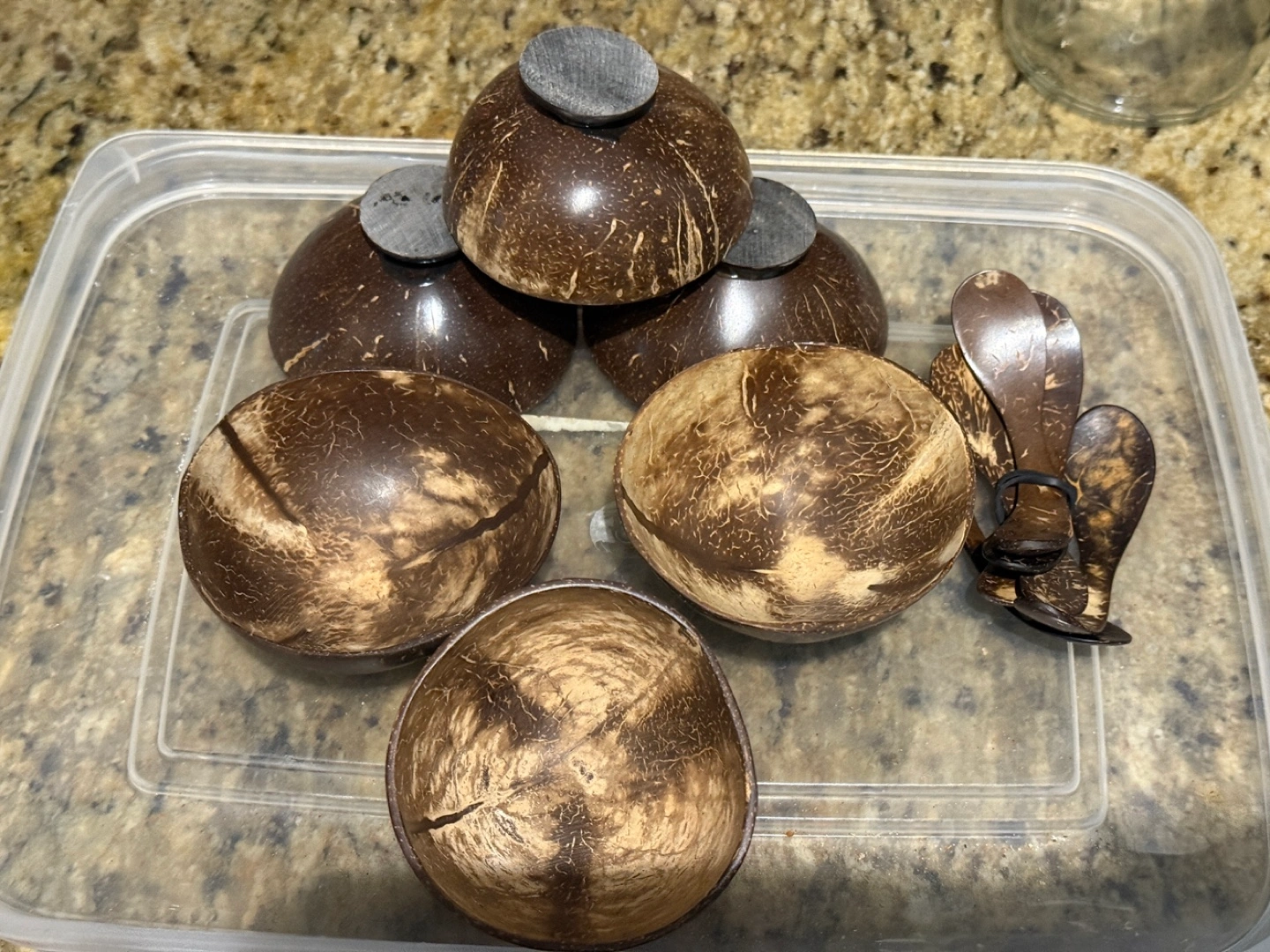 6 small coconut shell bowls. Each bowl features a dark brown, polished finish. 6 small coconut shell spoons included. Spoons have dark brown handles and are tied together. Pick up: 2600 Donmills Road Thanks