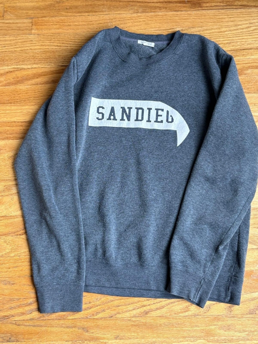 Grey crewneck sweatshirt. Features a white San Diego graphic. Long sleeves, ribbed cuffs and hem. Good used condition. Size small