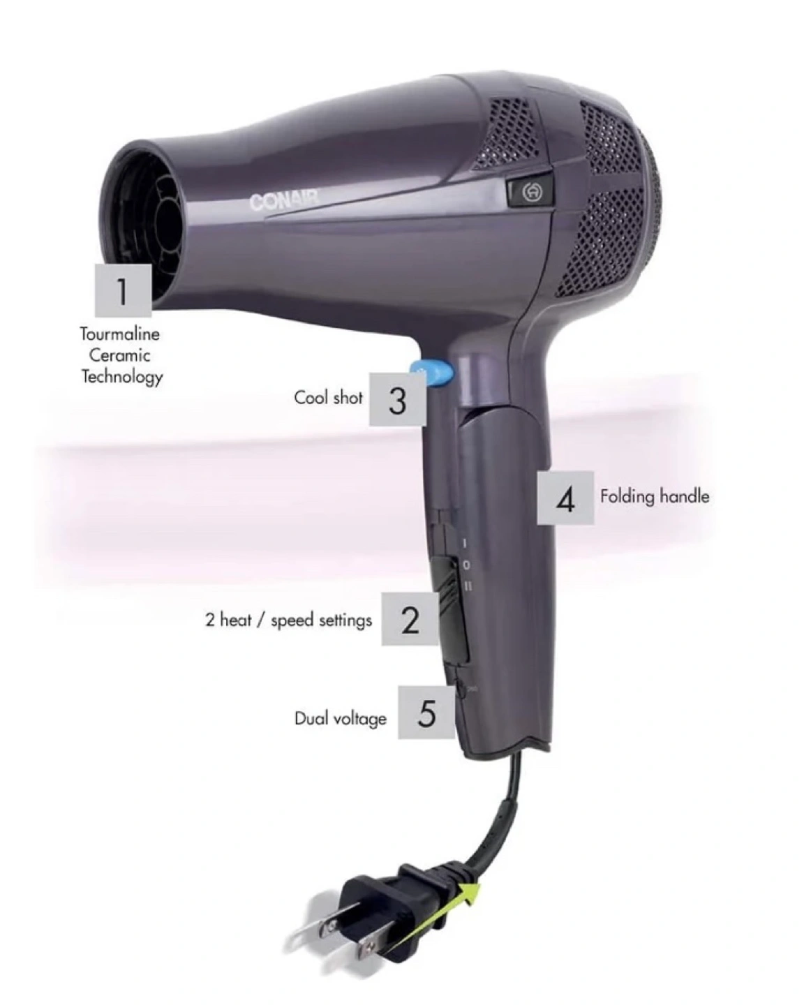 Conair 1875W compact hair dryer. Features tourmaline ceramic technology, two heat/speed settings, cool shot button, and folding handle. Dual voltage for travel. Let me know if interested in purchasing from me thx ๐๐ Pick up only โบ๏ธ Exact address will be given once a meetup is decided ๐ ๐ฅ Bundle items (3 or more) for discounted price ๐ฅ