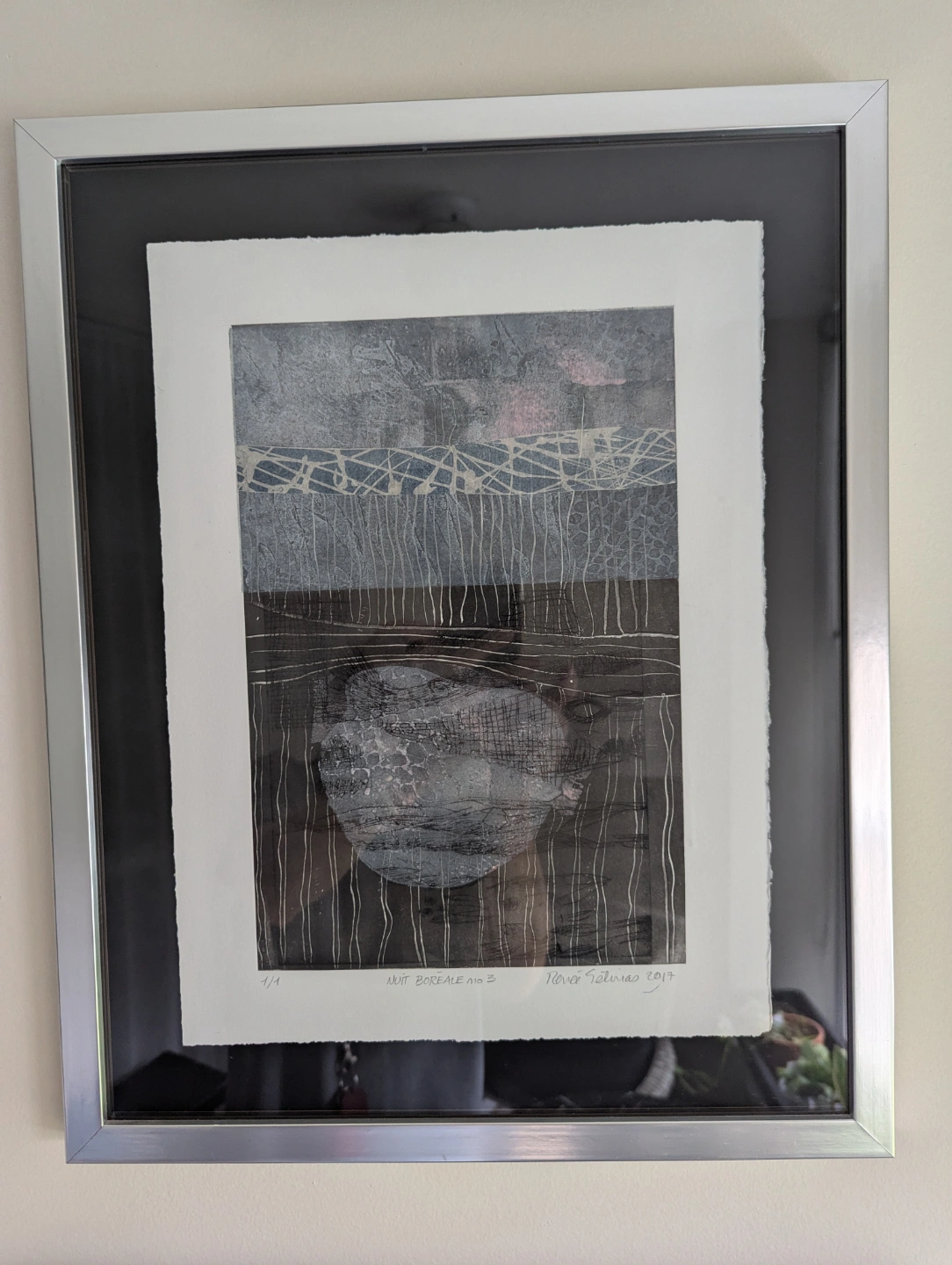 Beautiful original art work, mainly in black and white and grey shades, silver tone frame with glass overlay. Signed and numbered piece.