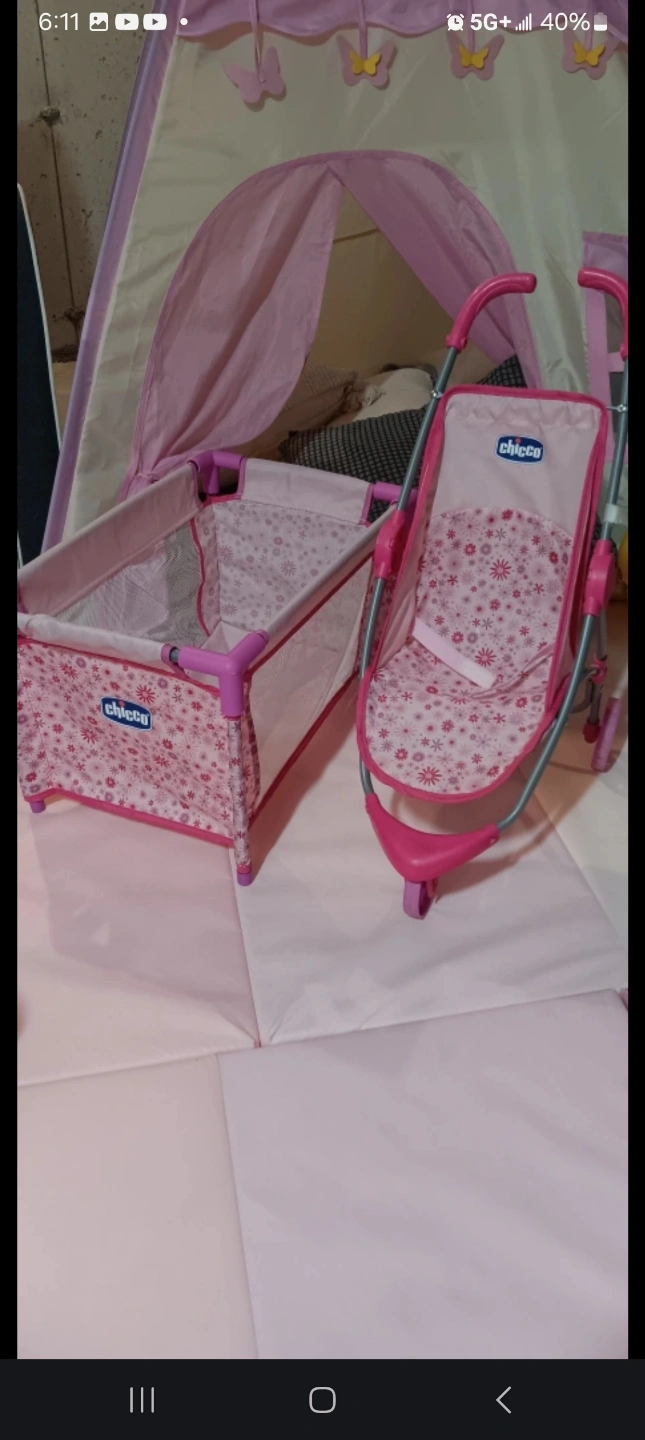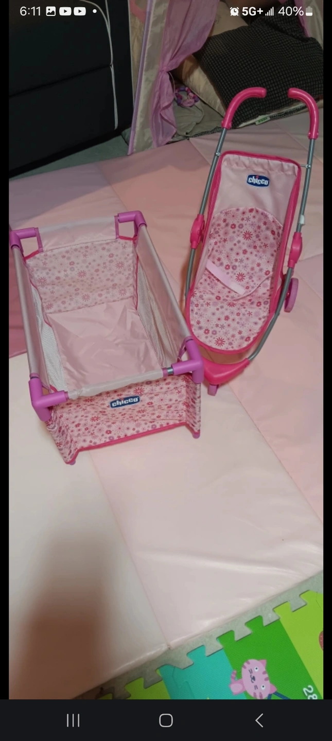 Adorable pink Chicco doll playset. Includes a stroller, high chair and crib. Perfect for imaginative play. Excellent condition.