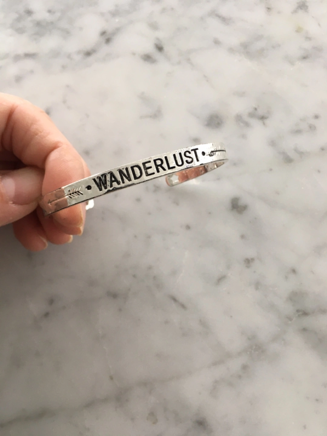 Silver-toned metal cuff bracelet. Features the word Wanderlust and small arrow accents. Adjustable fit.