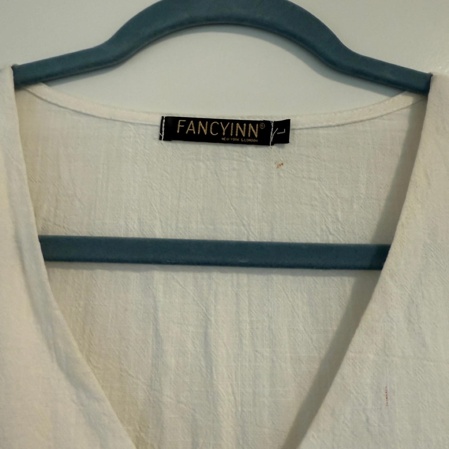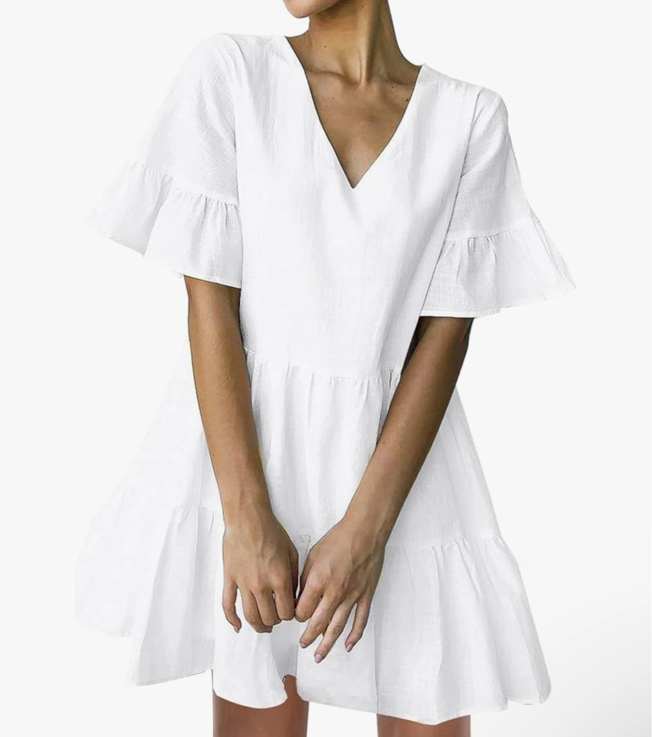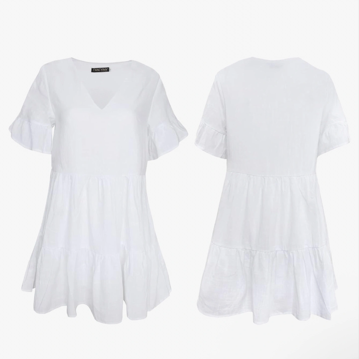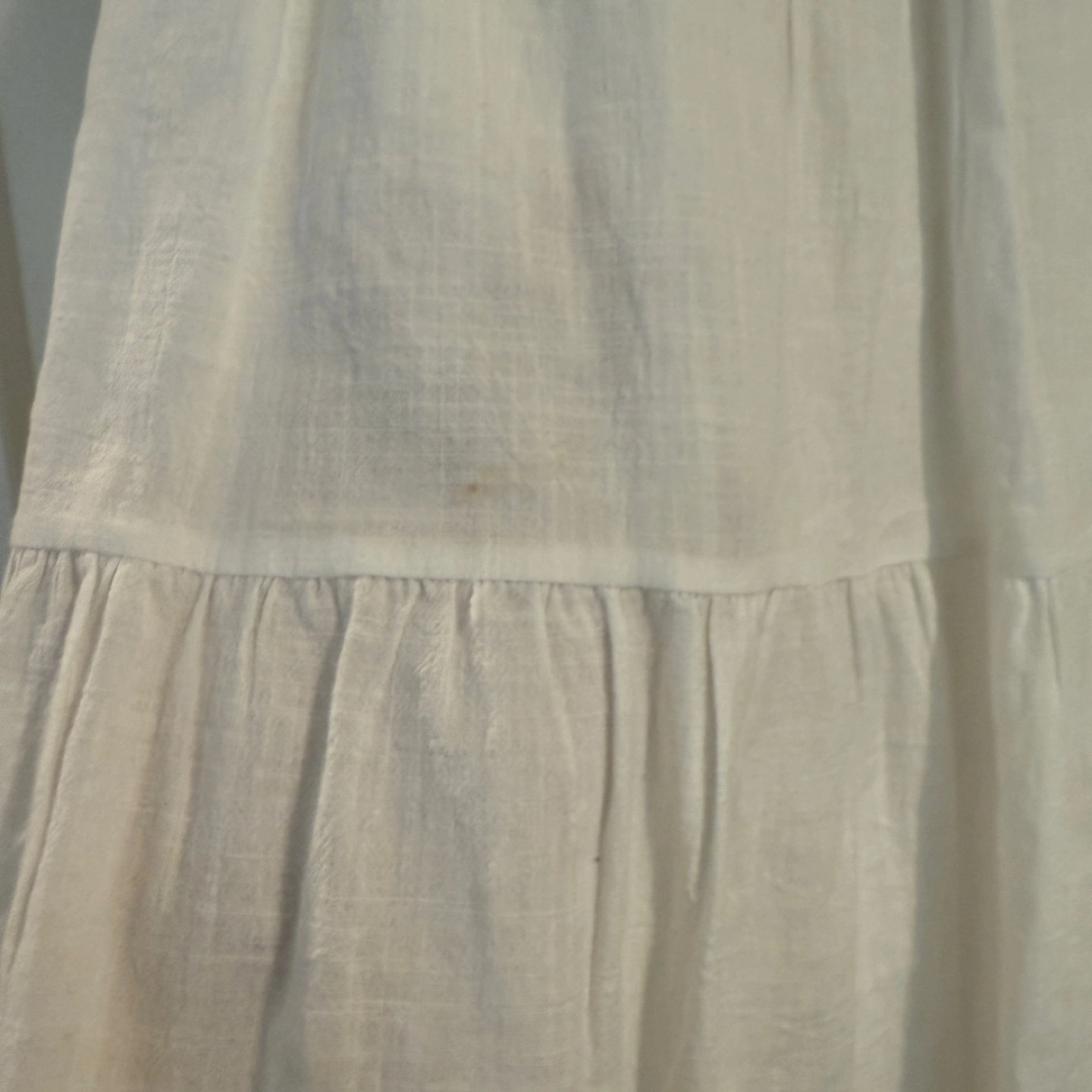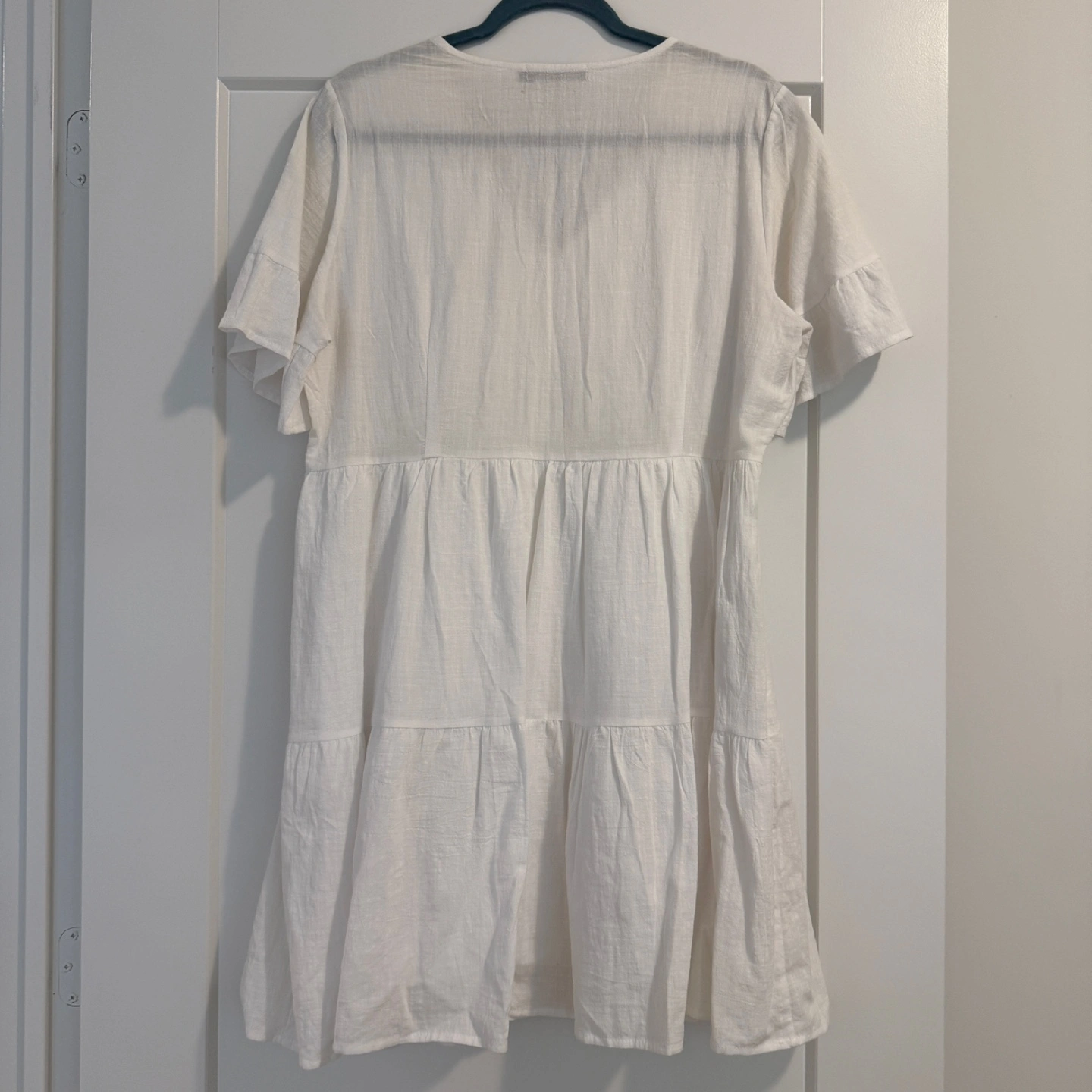 Cute white summer dress with ruffle hem sleeves Size L Good condition, some small marks (see photos 7~9 ) Perfect for a beach day! Relaxed fit baby doll dress Length 34.5" (87.5cm) Shoulder to shoulder 16" (40.5cm)