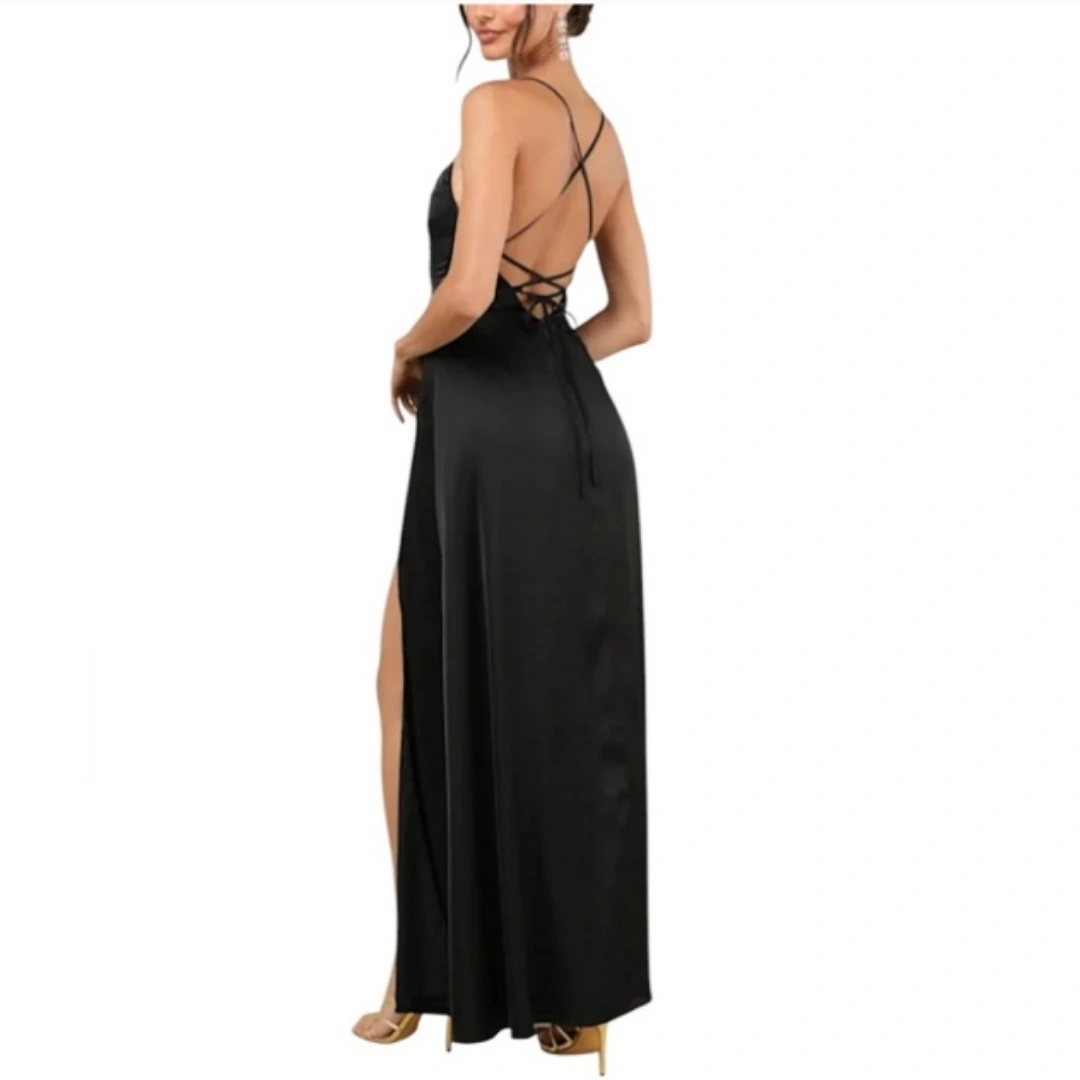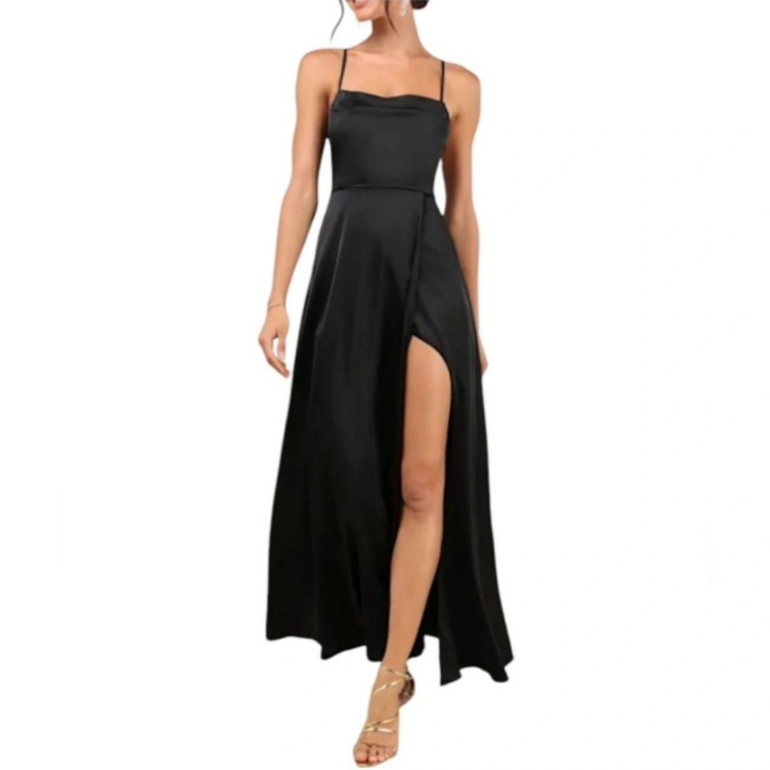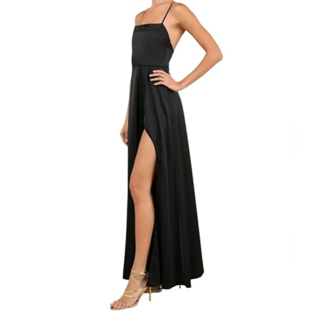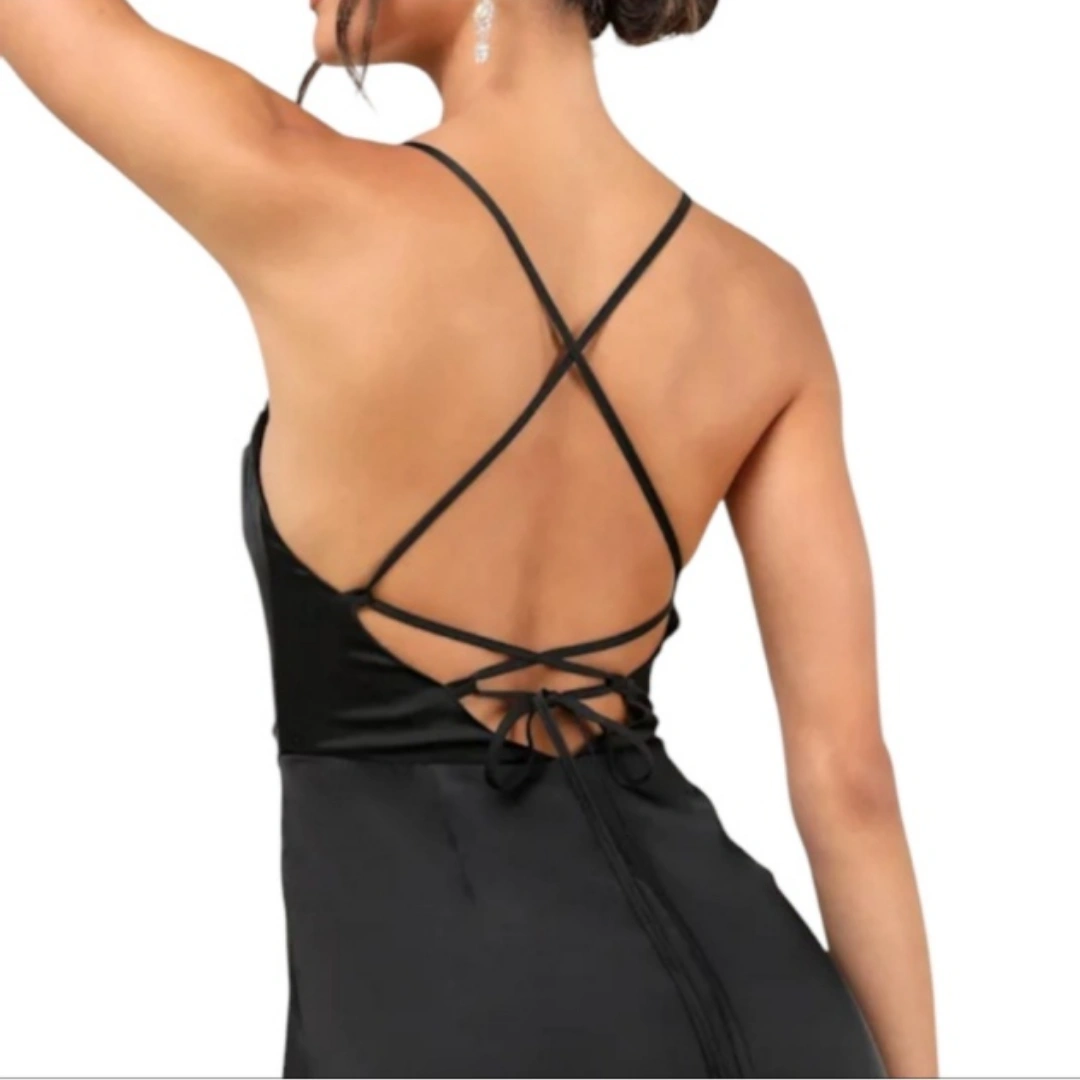 Lulus Black Satin Backless Lace Up Dress. Size Medium (Fits smaller; like a size 6.) Condition: New without tags! Purchased at a liquidation sale that is why the label is cut. Sleek satin shapes this gorgeous dress that has a sweetheart neckline with a pleated. Cowl-like detail, and a fitted bodice, all supported by long slender straps that lace up the open-back design. High, fitted waist sits atop an overlapping, A-line silhouette that forms a side slit as it falls to a sweeping maxi hem. Hidden back zipper/clasp. Shell: 95% Polyester, 5% Spandex. Lining: 95% Polyester, 5% Spandex.