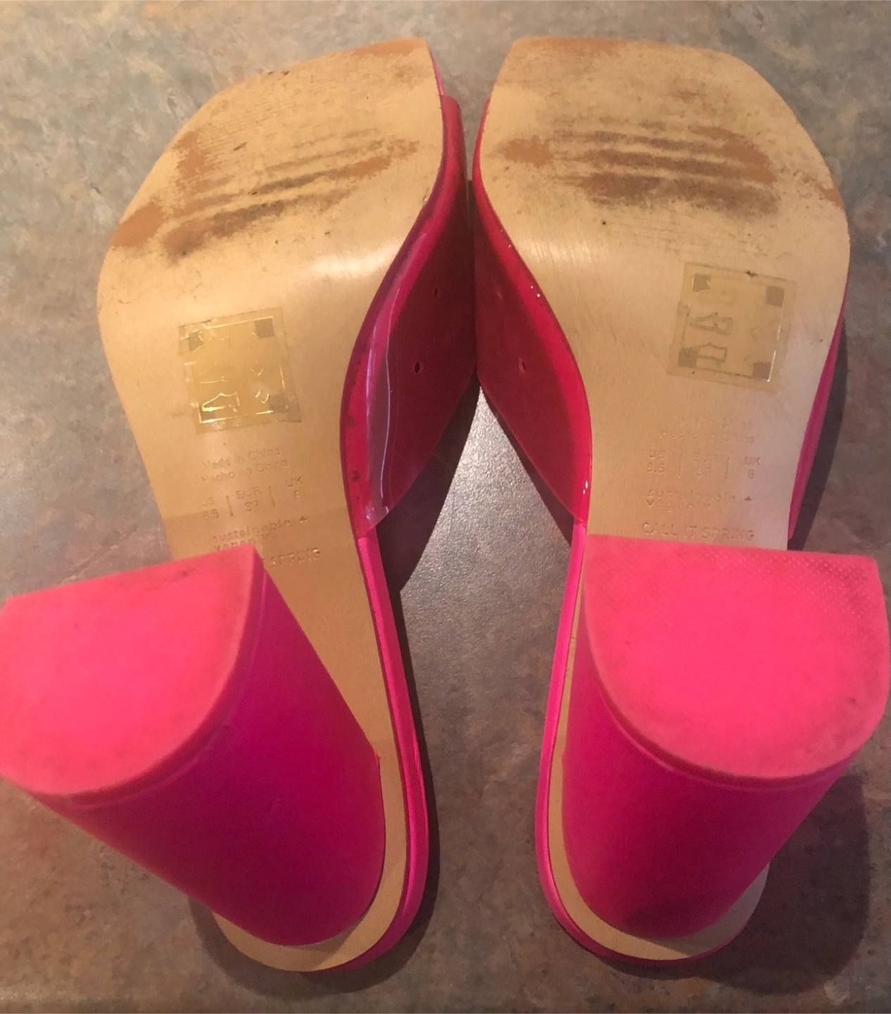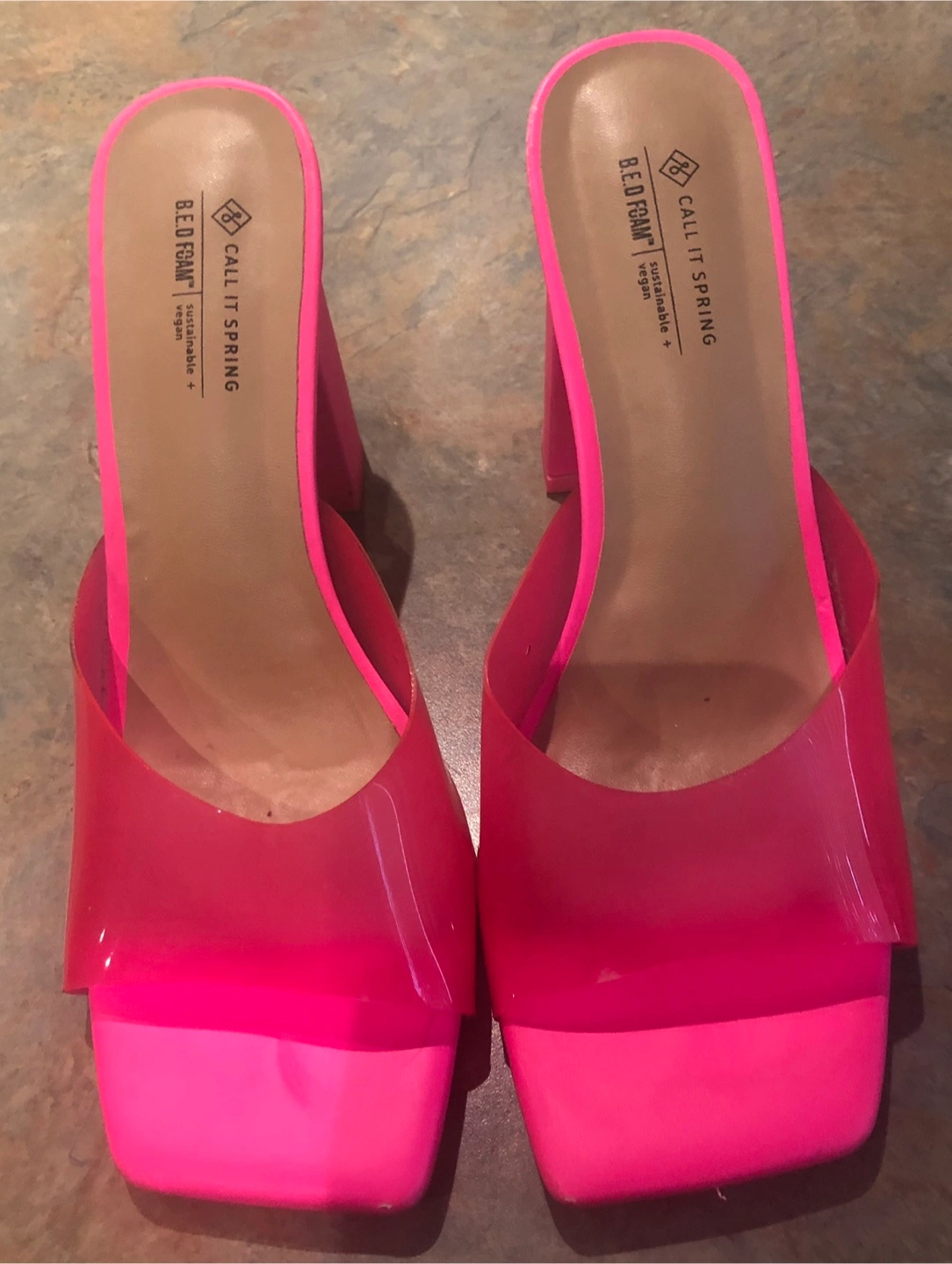 Pair of bright pink, transparent, square-toe heeled mules. 3 inch Block heel. Sustainable and vegan. Worn once for a wedding.