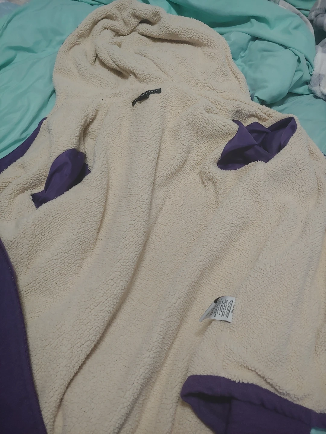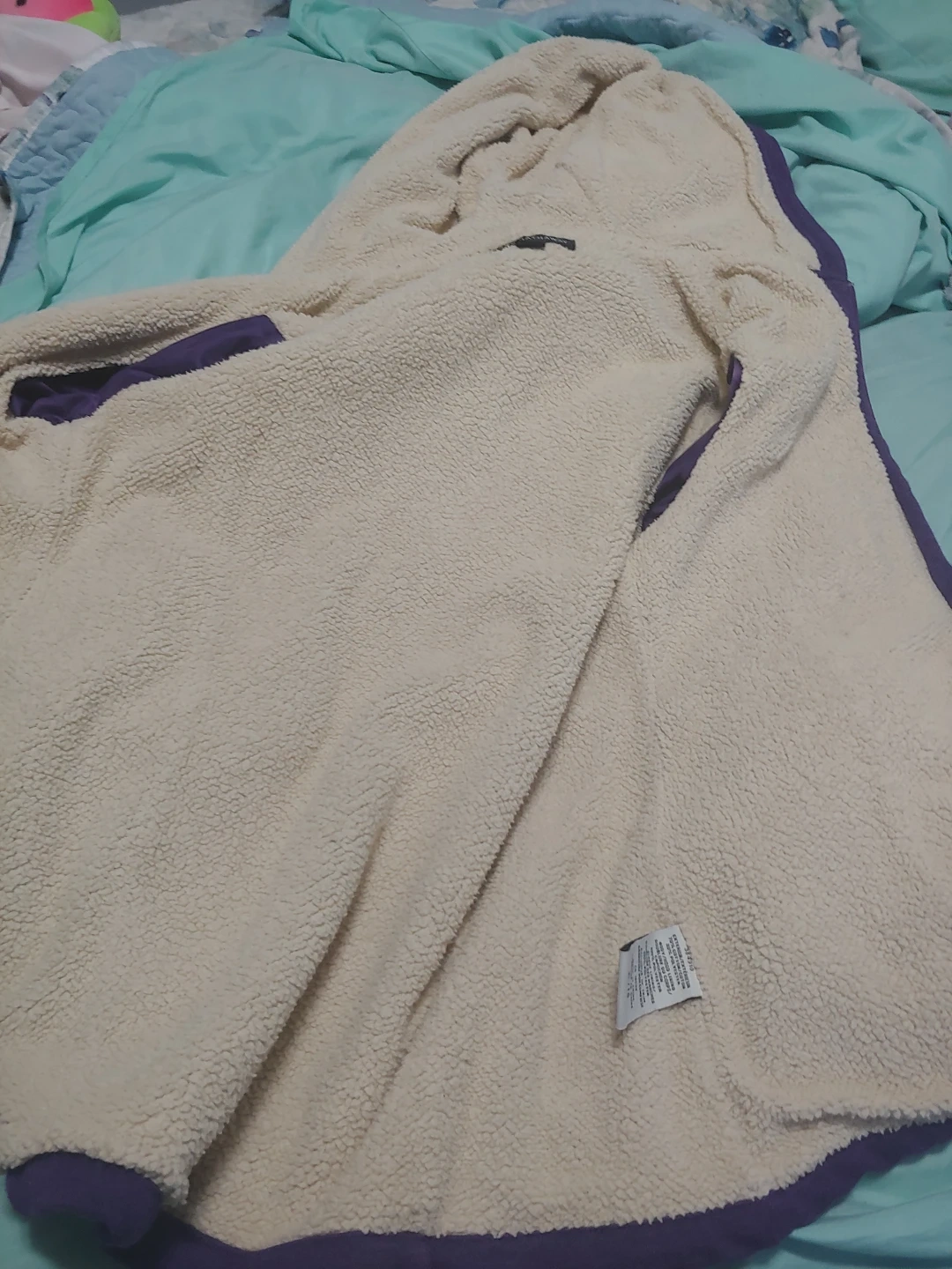 Women's purple hooded jacket. Features a warm sherpa lining. Great for colder weather. Zipper closure.