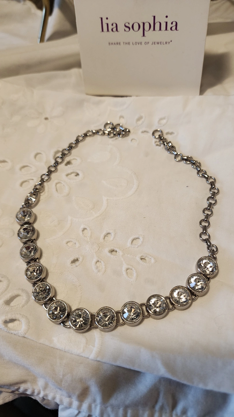 Silver-tone necklace. Features round clear crystals. Comes in original box.