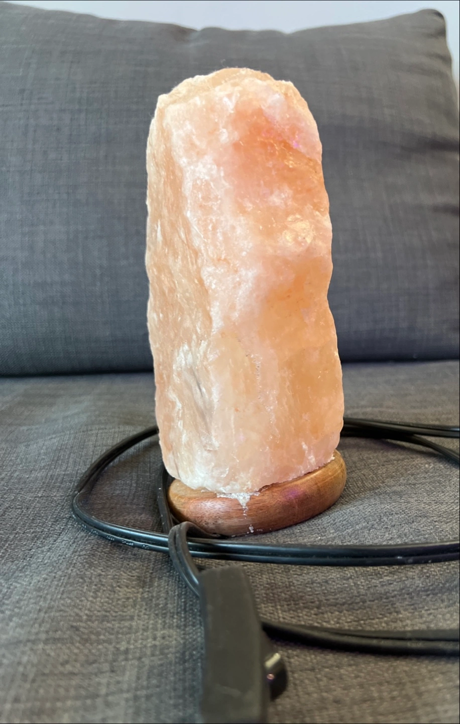 Natural Himalayan pink salt lamp. Features a warm, ambient glow. Cord included. Wooden base.