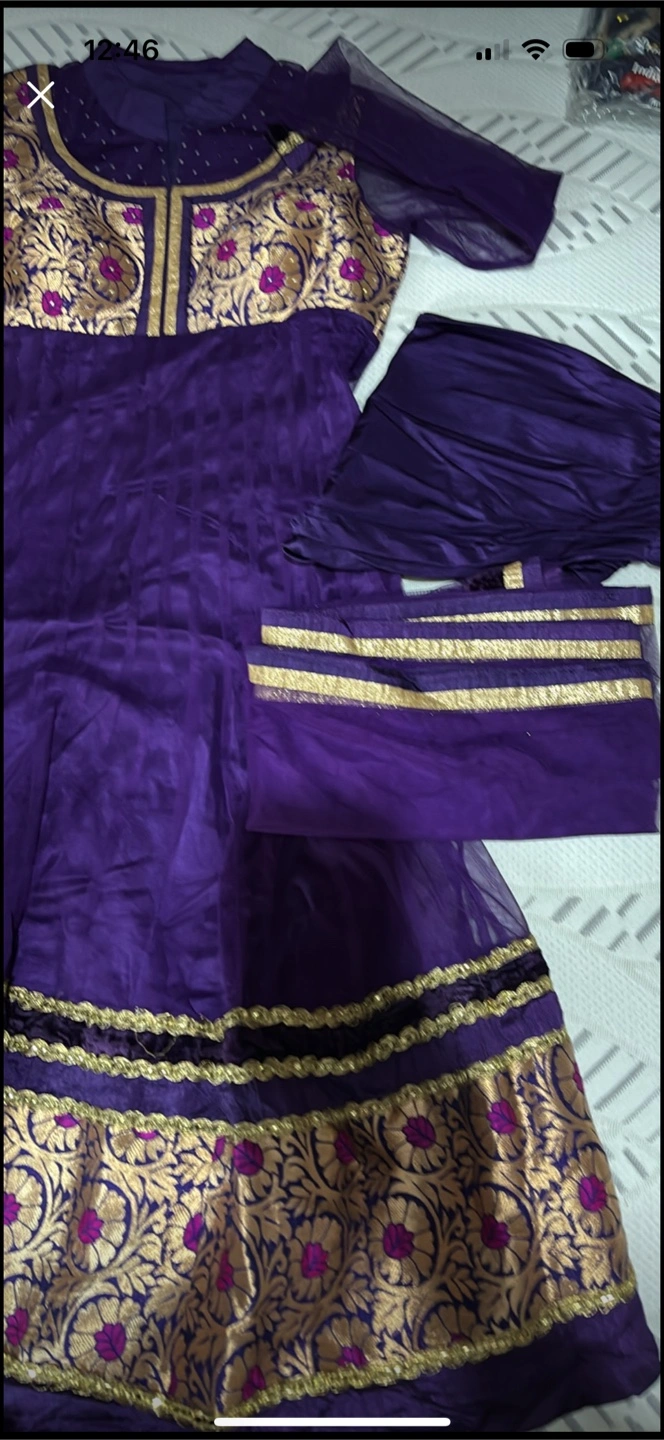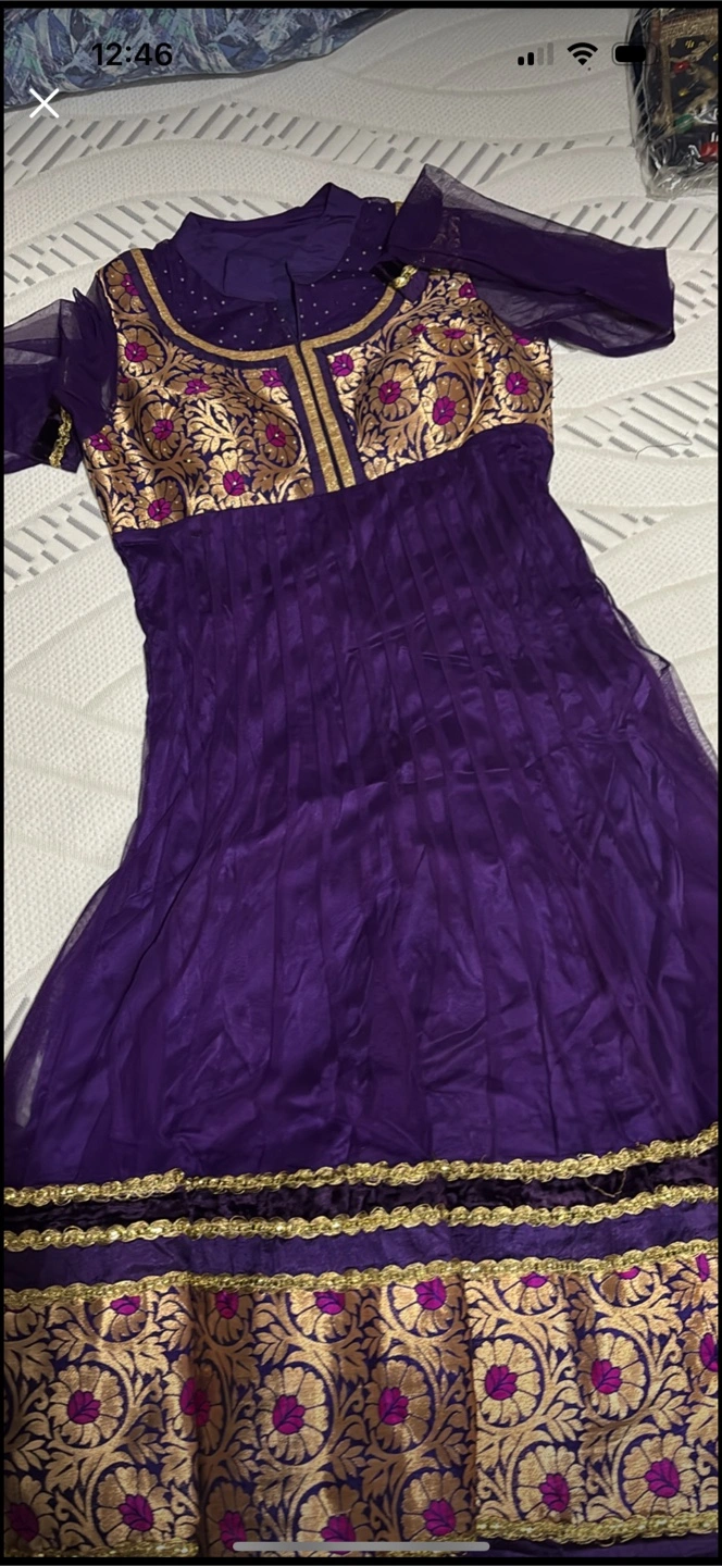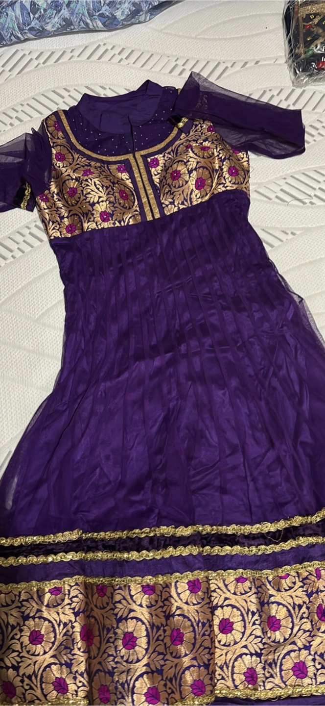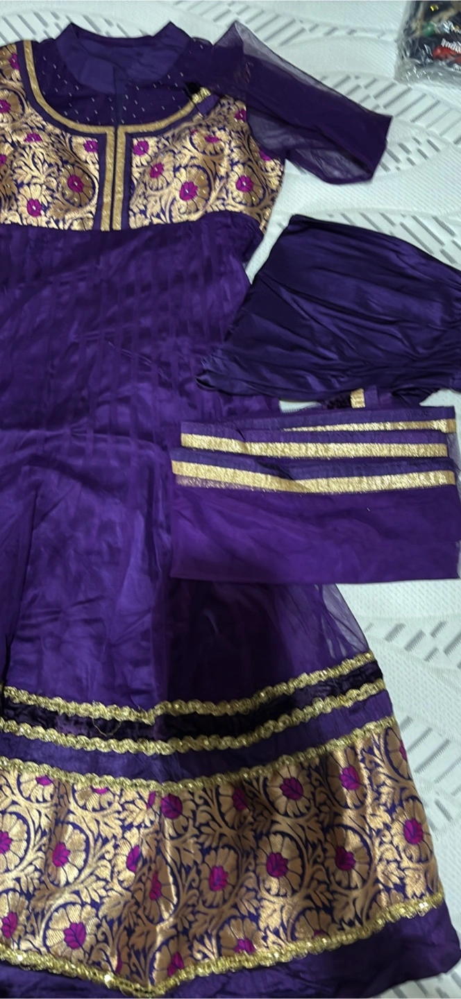 Beautiful purple salwar kameez. Features gold and pink embroidery. Includes matching bottom and dupatta. Intricate detailing.
