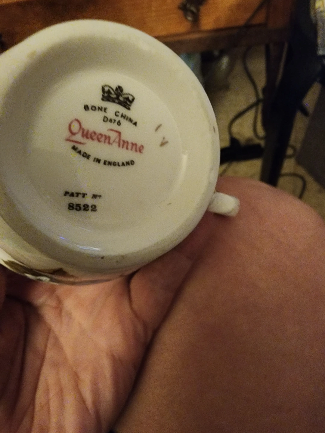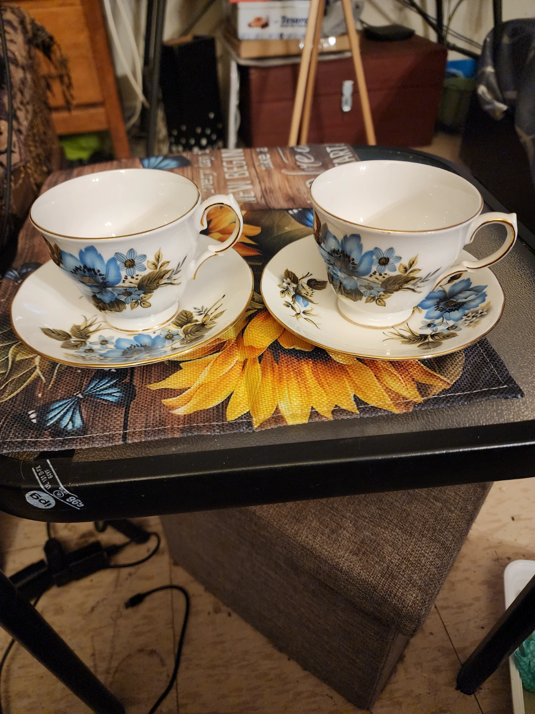 Pair of vintage teacups and saucers. Floral design. Bone china. Made in England. Gold trim. Pattern # 8522. $15 for 1 set or $25 for both