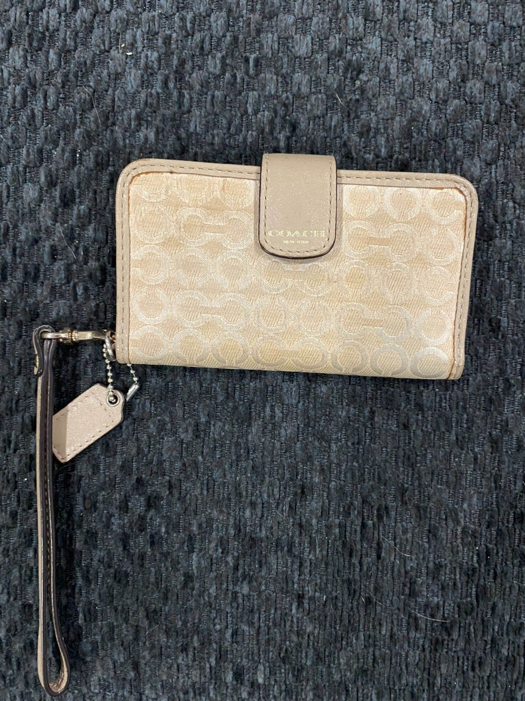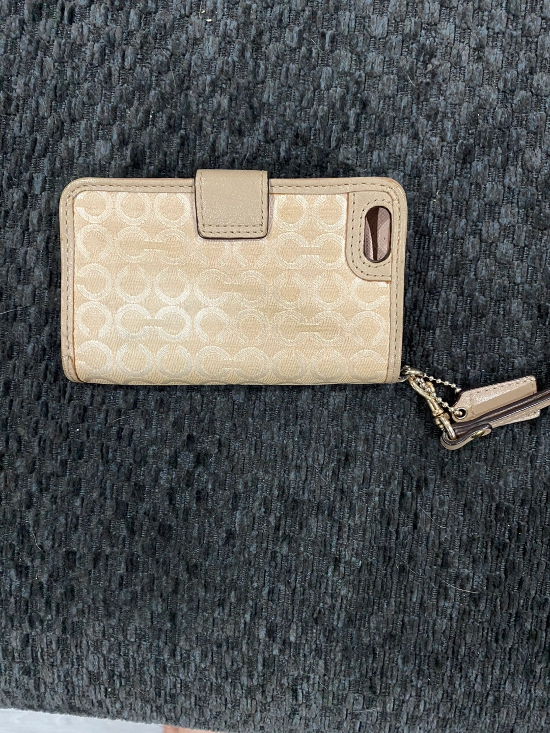 Beige Coach phone case with wallet. Features multiple card slots, a small ID window, and a wristlet strap. Classic Coach pattern. Pre-owned.