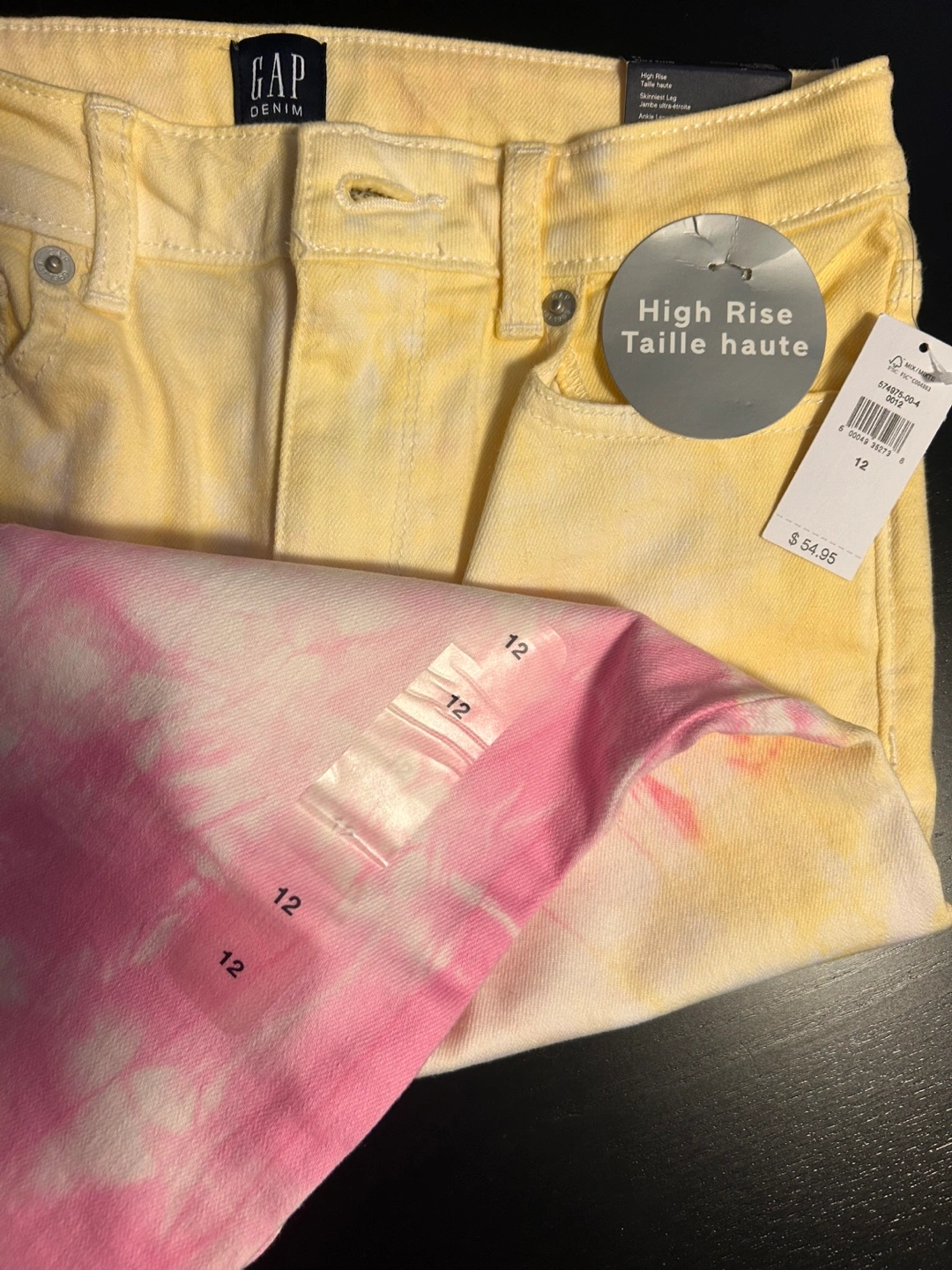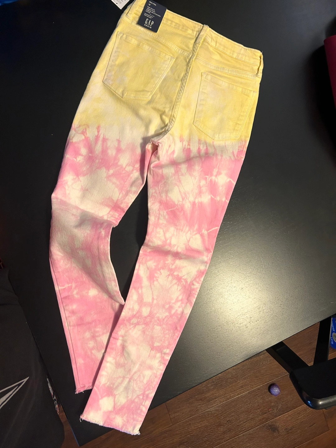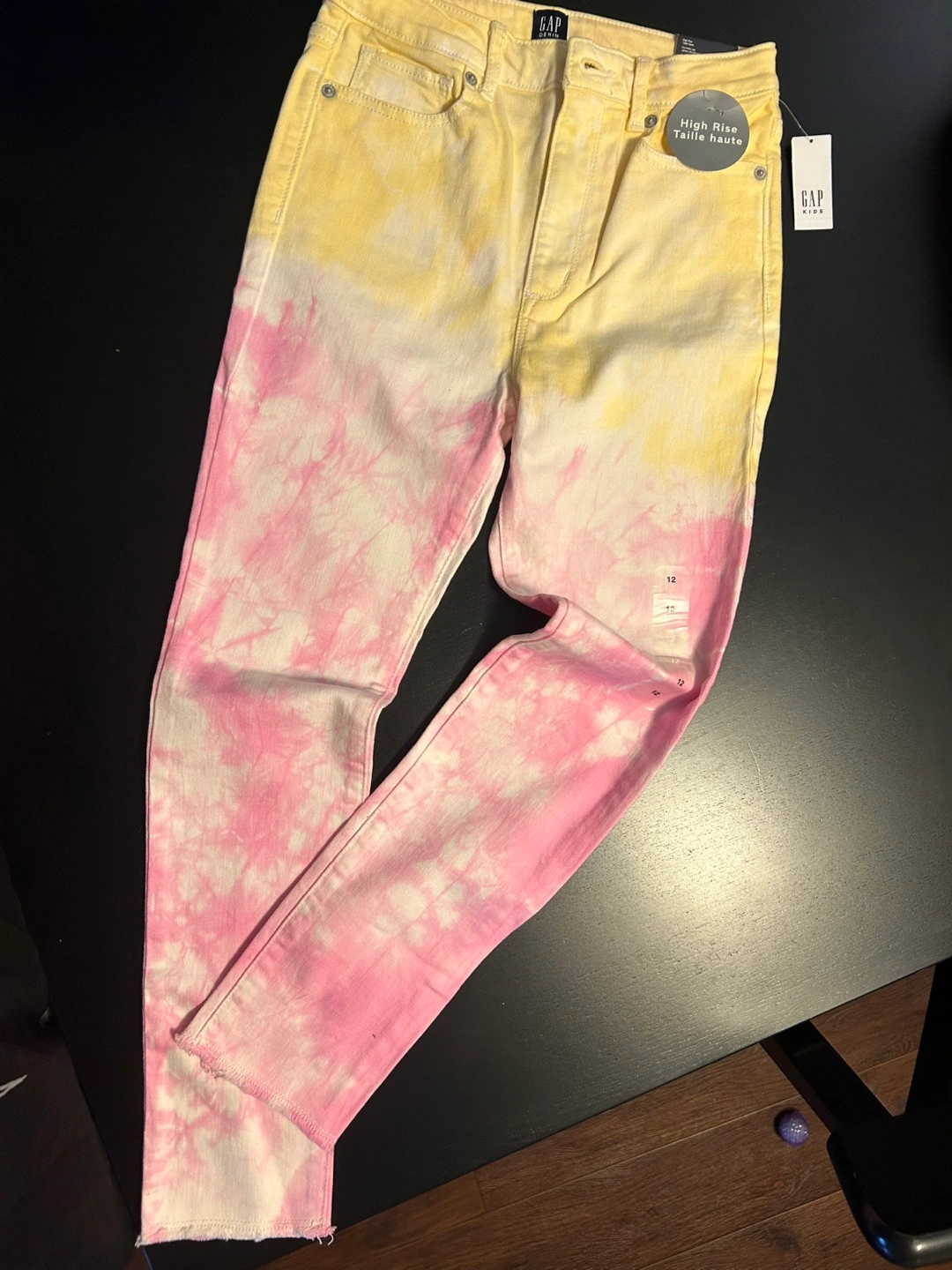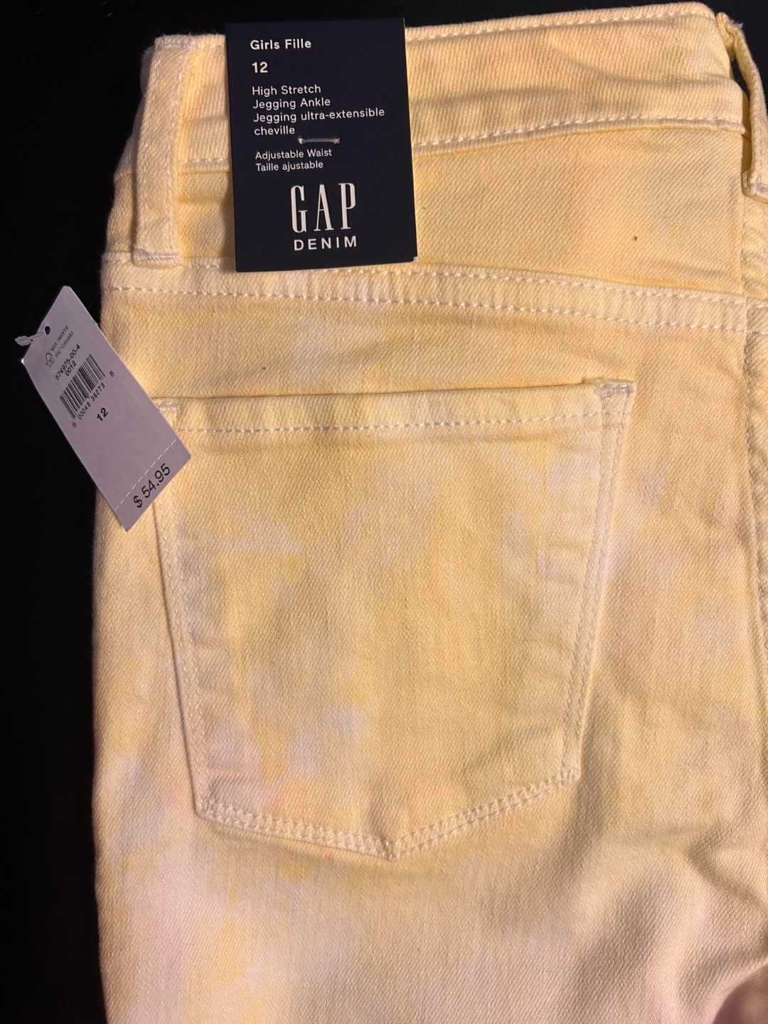 New with tags. Yellow and pink tie dye. High rise, adjustable waist. High stretch jegging. Size 12. Brand: GAP