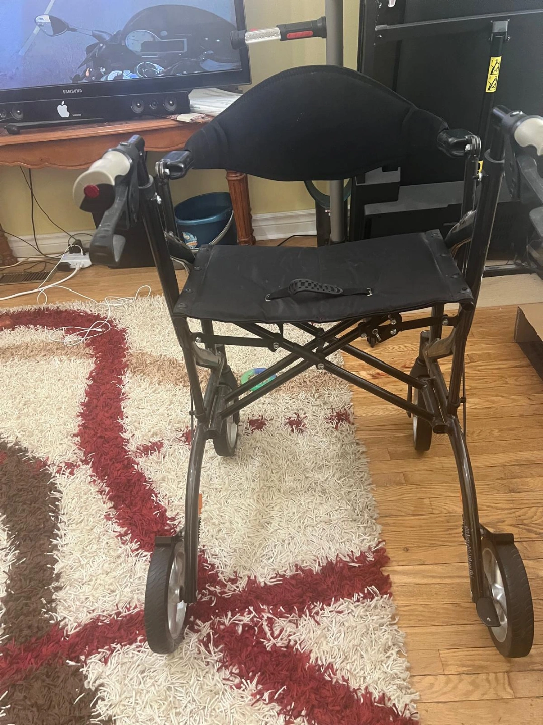 Black rollator walker. Features a padded seat and carry bag. Lightweight and foldable design. Good condition.