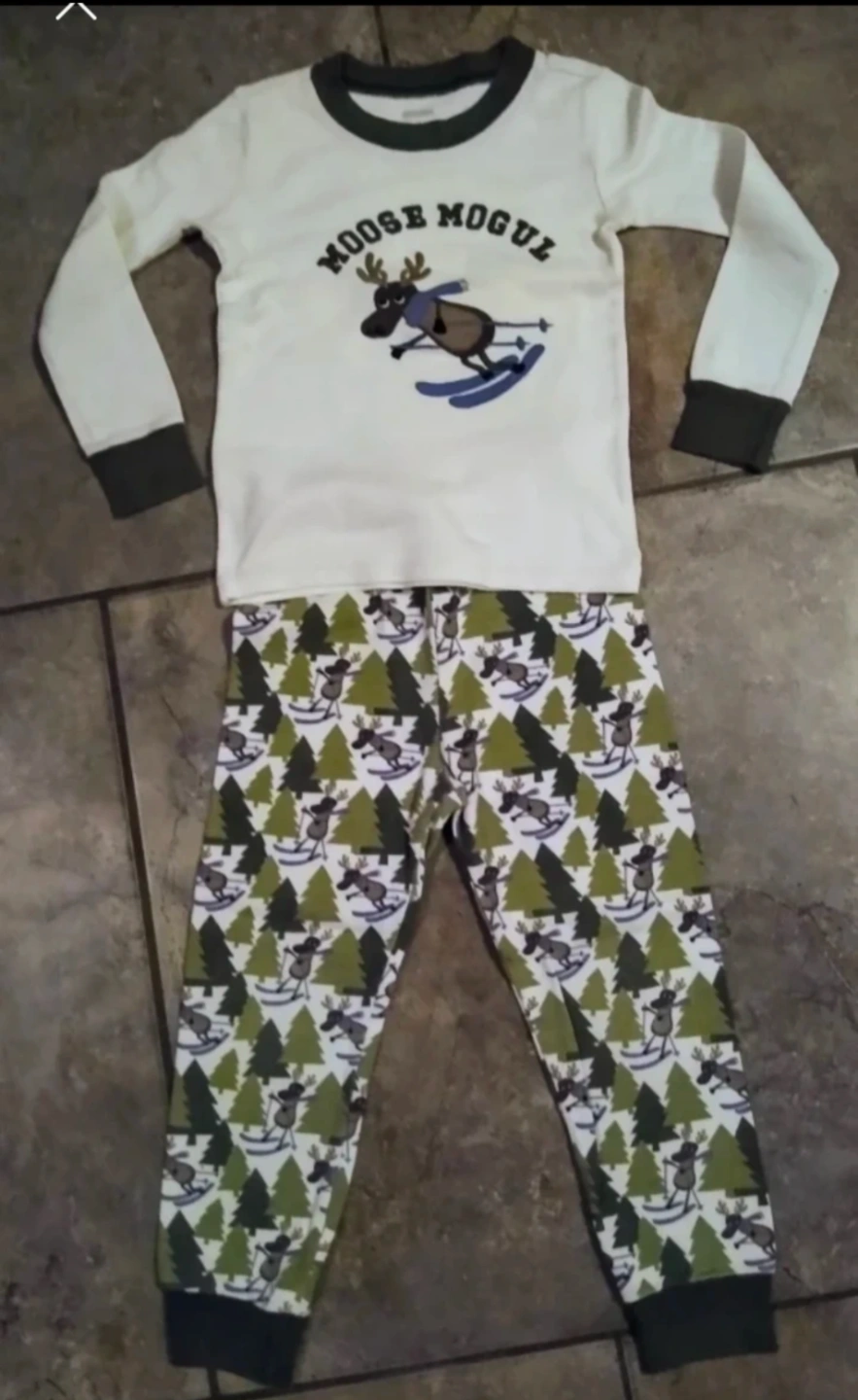 Size 4 years Child's 2 PC pyjama set from Gymboree. "Moose Mogul" green and white with moose and trees pattern.