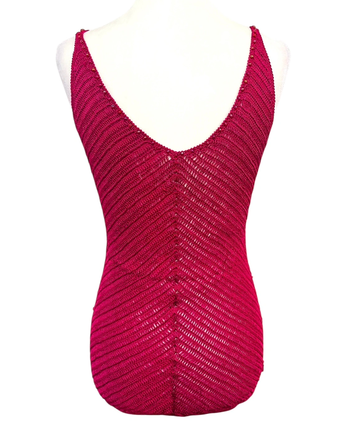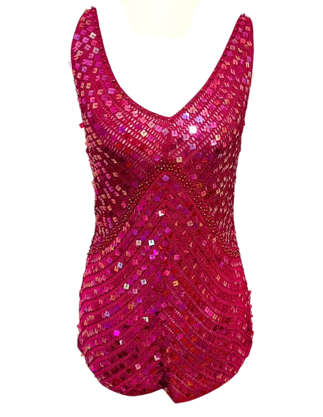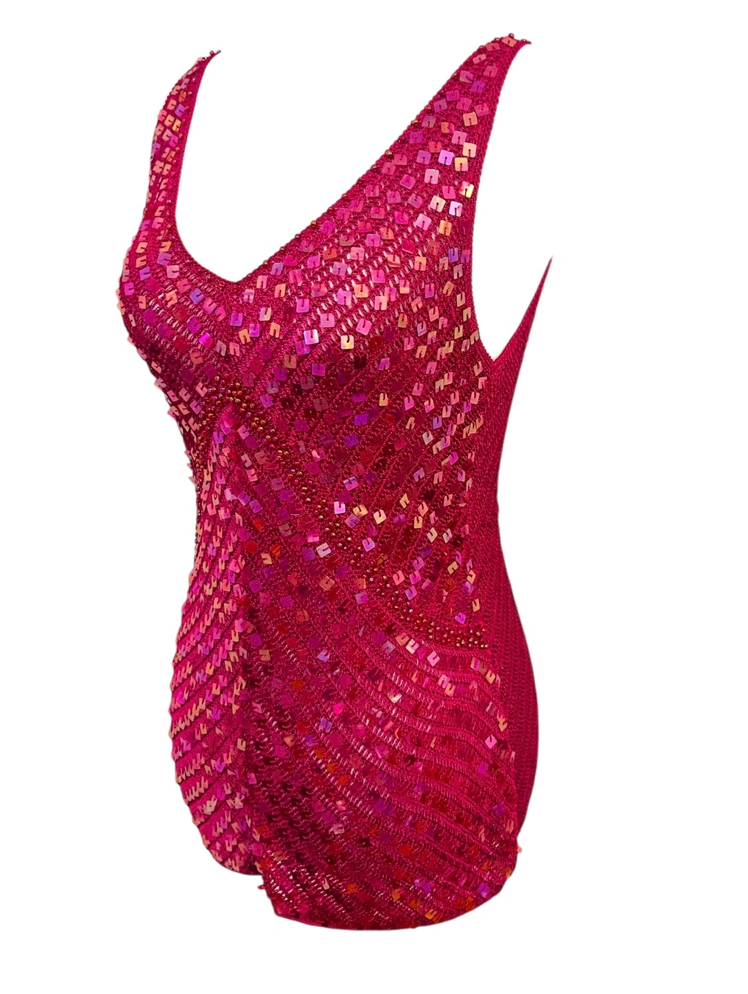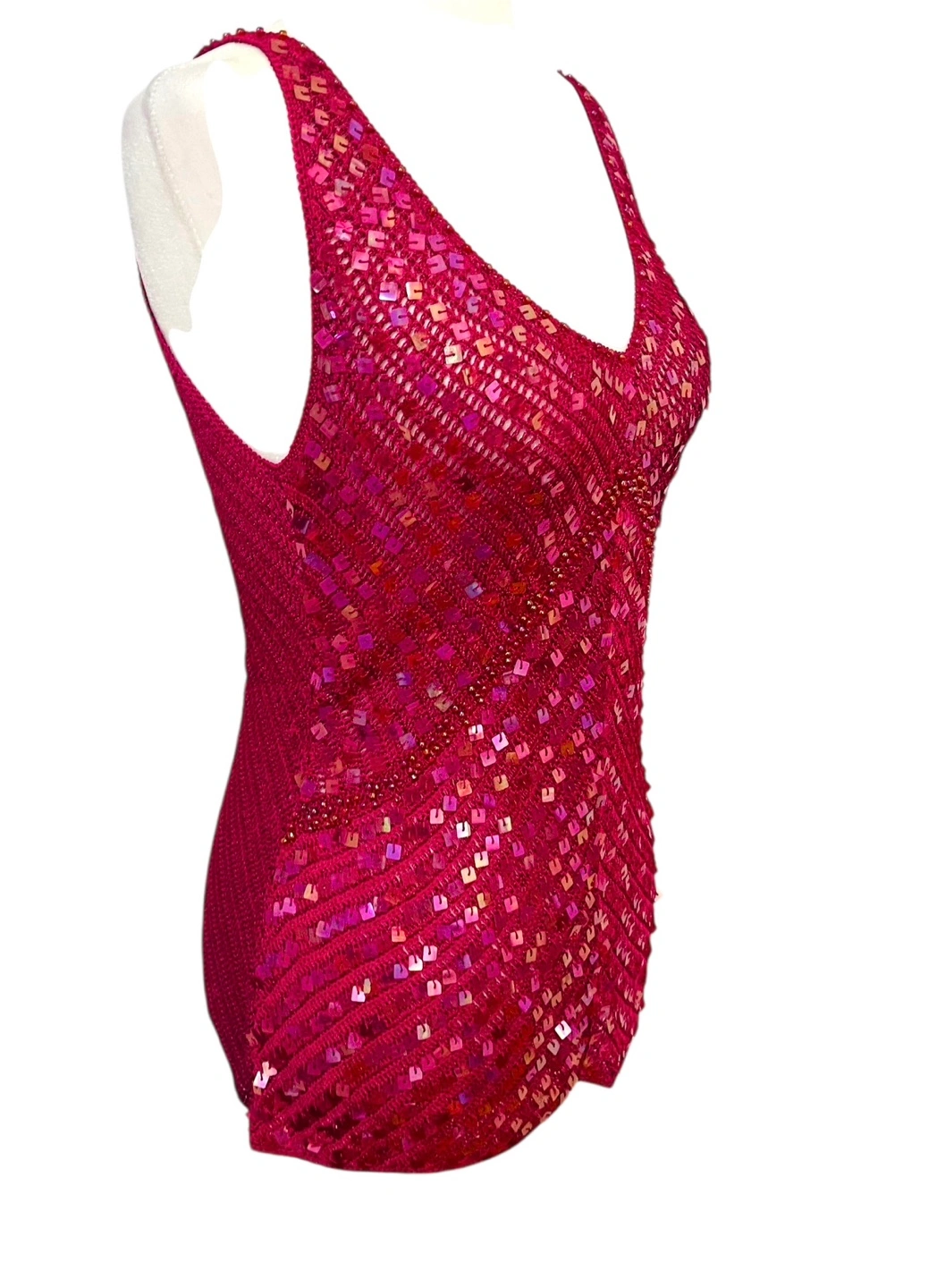 A dazzling statement piece, this sequined bodysuit is ready to turn heads. The dark magenta hue shimmers with every movement, thanks to the intricate sequin and bead embellishments that catch the light. The flattering V-neckline and sleeveless design create a sleek silhouette, perfect for layering or wearing alone. The knitted construction ensures a comfortable fit, allowing you to dance the night away with ease. This bodysuit is ideal for a glamorous night out, a festive party, or adding a touch of sparkle to a special occasion. Color: Purple Department: Women Style: One Piece Type: Bodysuit Fabric Type: Knit Character: Magenta, Sparkle, Retro, Party, Sequin Compression Area: Body, Waist, Buttocks, Abdomen Material: Viscose, 100% Viscose, Metallic Fiber, Polyester Features: Stretch, Lightweight, Lined, Sheer Compression Level: Mild Womens UK 12/ 8 US Excellent Condition Length 26" Pit to pit 16" PU Ottawa & Strasburg, Kitchener Keywords: sequin bodysuit, embellished bodysuit, party bodysuit, magenta bodysuit, sleeveless bodysuit, V-neck bodysuit, knitted bodysuit, Marks & Spencer, size 12, dark magenta, sequin top, party top, retro style, vintage inspired