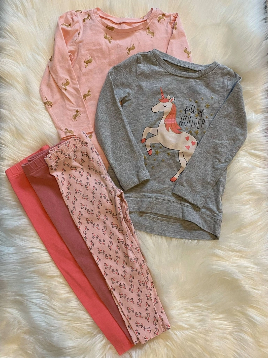 Adorable unicorn themed Bundle size 3T , “Simple Joy by Carter’s brand , all are in excellent jused condition no stains or any rips. featuring a pink top with gold unicorns, a gray top with a unicorn print, and matching pants. Perfect for cozy nights. Used only one season
