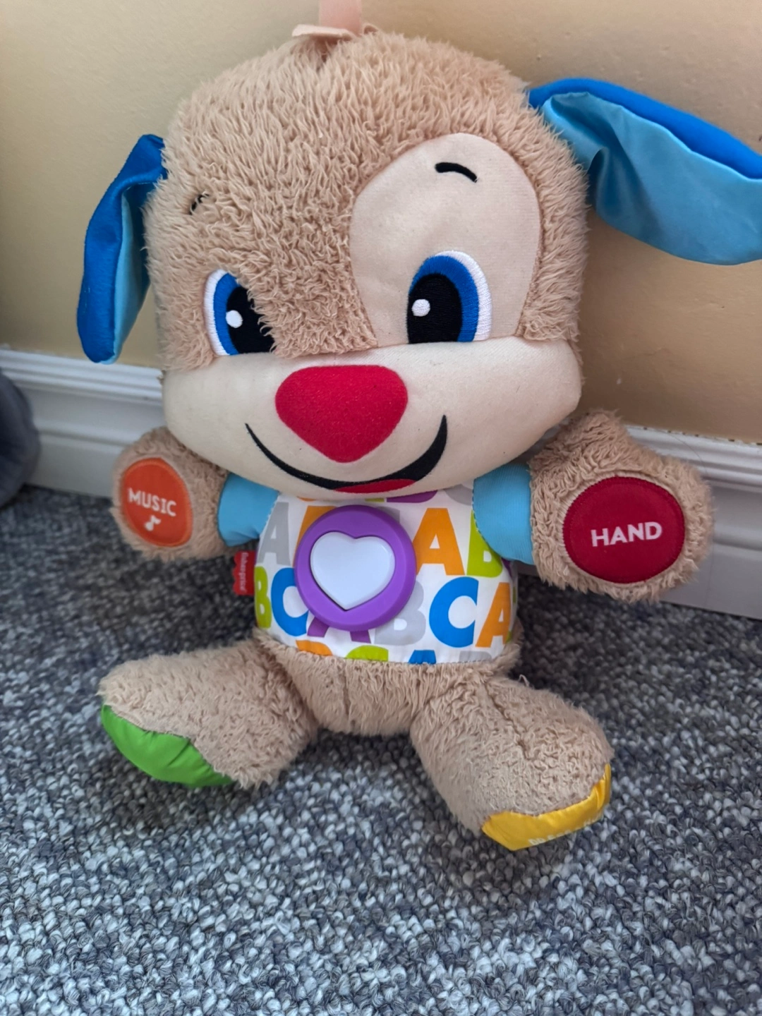 Adorable plush puppy toy. Features lights and sounds. Plays music and teaches the alphabet. Great for toddlers.