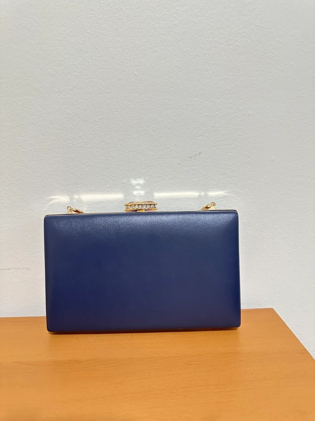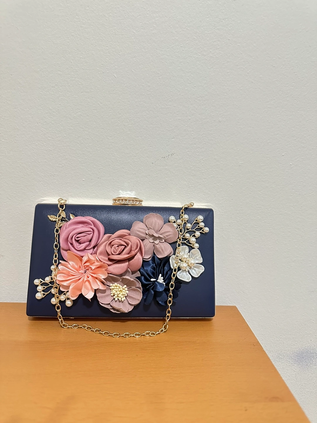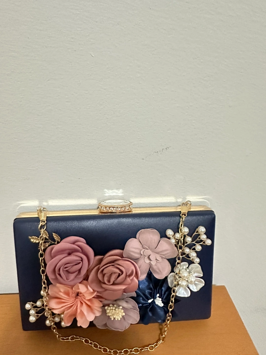 Beautiful navy blue clutch. Features floral embellishments and a gold chain strap. Perfect for special occasions. Box clasp closure.
