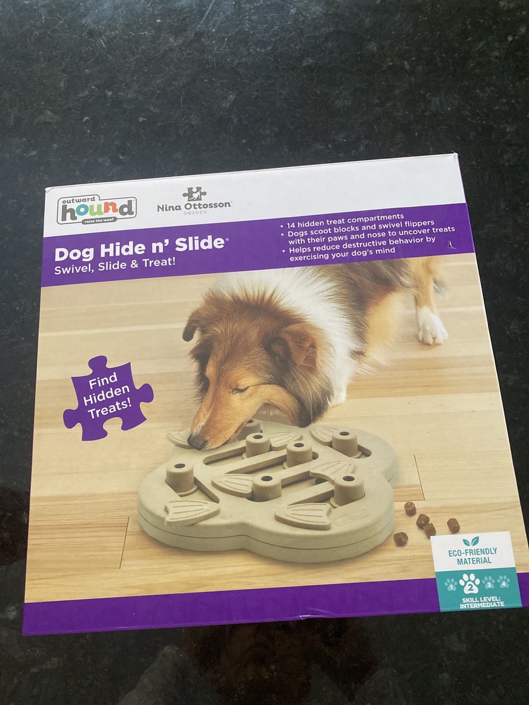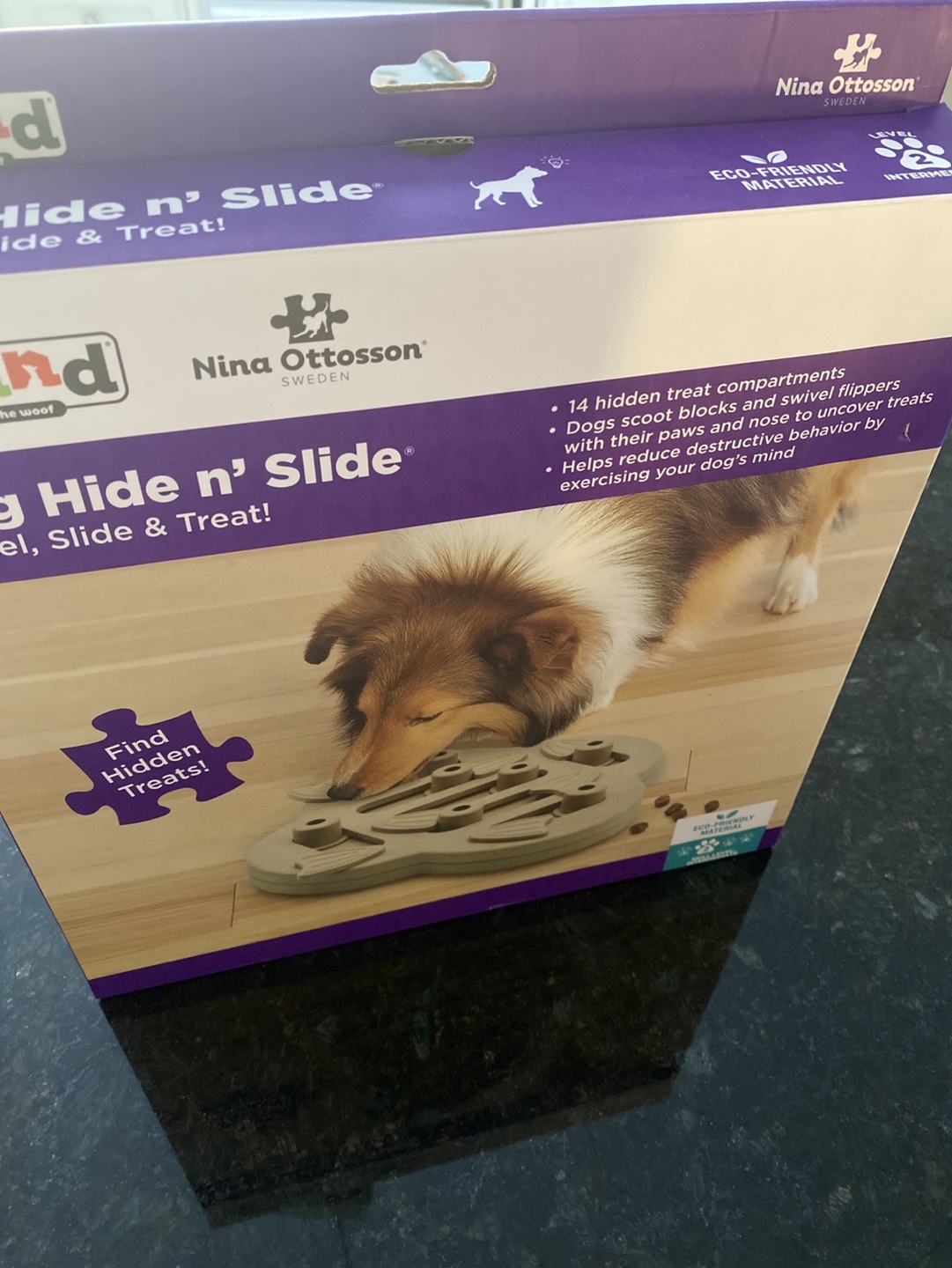 Nina Ottoson’s original, hide n’ slide, treat, dispensing, dog toy, skill level 2/intermediate. Like new, our dog only used it once, so I cleaned it thoroughly and put it back in the original packaging. Instore new 28cad.